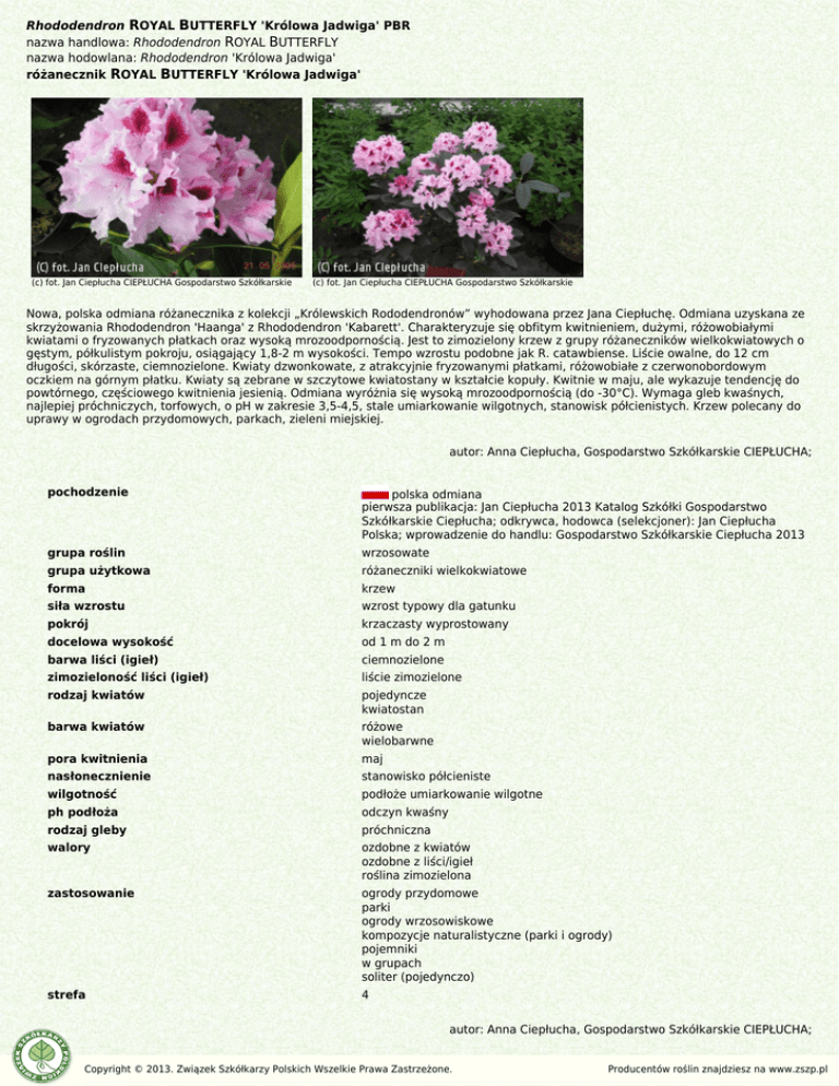 Rhododendron ROYAL BUTTERFLY 'Królowa Jadwiga' PBR nazwa handlowa: Rhododendron ROYAL BUTTERFLY nazwa hodowlana: Rhododendron 'Królowa Jadwiga' różanecznik ROYAL BUTTERFLY 'Królowa Jadwiga' (c) fot. Jan Ciepłucha CIEPŁUCHA Gospodarstwo Szkółkarskie (c) fot. Jan Ciepłucha CIEPŁUCHA Gospodarstwo Szkółkarskie Nowa, polska odmiana różanecznika z kolekcji „Królewskich Rododendronów” wyhodowana przez Jana Ciepłuchę. Odmiana uzyskana ze skrzyżowania Rhododendron 'Haanga' z Rhododendron 'Kabarett'. Charakteryzuje się obfitym kwitnieniem, dużymi, różowobiałymi kwiatami o fryzowanych płatkach oraz wysoką mrozoodpornością. Jest to zimozielony krzew z grupy różaneczników wielkokwiatowych o gęstym, półkulistym pokroju, osiągający 1,8-2 m wysokości. Tempo wzrostu podobne jak R. catawbiense. Liście owalne, do 12 cm długości, skórzaste, ciemnozielone. Kwiaty dzwonkowate, z atrakcyjnie fryzowanymi płatkami, różowobiałe z czerwonobordowym oczkiem na górnym płatku. Kwiaty są zebrane w szczytowe kwiatostany w kształcie kopuły. Kwitnie w maju, ale wykazuje tendencję do powtórnego, częściowego kwitnienia jesienią. Odmiana wyróżnia się wysoką mrozoodpornością (do -30°C). Wymaga gleb kwaśnych, najlepiej próchniczych, torfowych, o pH w zakresie 3,5-4,5, stale umiarkowanie wilgotnych, stanowisk półcienistych. Krzew polecany do uprawy w ogrodach przydomowych, parkach, zieleni miejskiej. autor: Anna Ciepłucha, Gospodarstwo Szkółkarskie CIEPŁUCHA; pochodzenie polska odmiana pierwsza publikacja: Jan Ciepłucha 2013 Katalog Szkółki Gospodarstwo Szkółkarskie Ciepłucha; odkrywca, hodowca (selekcjoner): Jan Ciepłucha Polska; wprowadzenie do handlu: Gospodarstwo Szkółkarskie Ciepłucha 2013 grupa roślin wrzosowate grupa użytkowa różaneczniki wielkokwiatowe forma krzew siła wzrostu wzrost typowy dla gatunku pokrój krzaczasty wyprostowany docelowa wysokość od 1 m do 2 m barwa liści (igieł) ciemnozielone zimozieloność liści (igieł) liście zimozielone rodzaj kwiatów pojedyncze kwiatostan barwa kwiatów różowe wielobarwne pora kwitnienia maj nasłonecznienie stanowisko półcieniste wilgotność podłoże umiarkowanie wilgotne ph podłoża odczyn kwaśny rodzaj gleby próchniczna walory ozdobne z kwiatów ozdobne z liści/igieł roślina zimozielona zastosowanie ogrody przydomowe parki ogrody wrzosowiskowe kompozycje naturalistyczne (parki i ogrody) pojemniki w grupach soliter (pojedynczo) strefa 4 autor: Anna Ciepłucha, Gospodarstwo Szkółkarskie CIEPŁUCHA; Copyright © 2013. Związek Szkółkarzy Polskich Wszelkie Prawa Zastrzeżone. Producentów roślin znajdziesz na www.zszp.pl