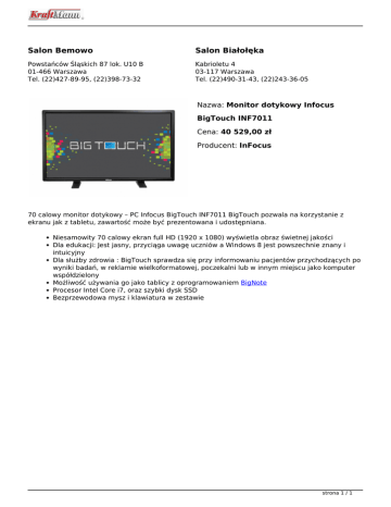 Salon Bemowo Salon Białołęka Powstańców Śląskich 87 lok. U10 B 01-466 Warszawa Tel. (22)427-89-95, (22)398-73-32 Kabrioletu 4 03-117 Warszawa Tel. (22)490-31-43, (22)243-36-05 Nazwa: Monitor dotykowy Infocus BigTouch INF7011 Cena: 40 529,00 zł Producent: InFocus 70 calowy monitor dotykowy – PC Infocus BigTouch INF7011 BigTouch pozwala na korzystanie z ekranu jak z tabletu, zawartość może być prezentowana i udostępniana. Niesamowity 70 calowy ekran full HD (1920 x 1080) wyświetla obraz świetnej jakości Dla edukacji: Jest jasny, przyciąga uwagę uczniów a Windows 8 jest powszechnie znany i intuicyjny Dla służby zdrowia : BigTouch sprawdza się przy informowaniu pacjentów przychodzących po wyniki badań, w reklamie wielkoformatowej, poczekalni lub w innym miejscu jako komputer współdzielony Możliwość używania go jako tablicy z oprogramowaniem BigNote Procesor Intel Core i7, oraz szybki dysk SSD Bezprzewodowa mysz i klawiatura w zestawie strona 1 / 1 Powered by TCPDF (www.tcpdf.org)