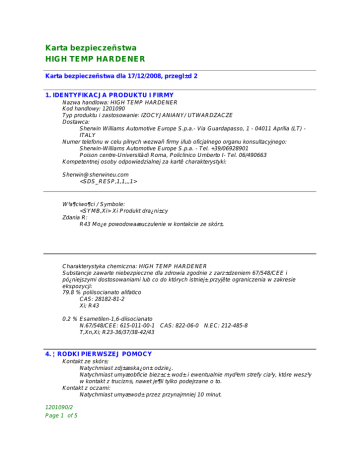 Karta bezpieczeñstwa HIGH TEMP HARDENER Karta bezpieczeñstwa dla 17/12/2008, przegl±d 2 1. IDENTYFIKACJA PRODUKTU I FIRMY Nazwa handlowa: HIGH TEMP HARDENER Kod handlowy: 1201090 Typ produktu i zastosowanie: IZOCYJANIANY/ UTWARDZACZE Dostawca: Sherwin Williams Automotive Europe S.p.a.- Via Guardapasso, 1 - 04011 Aprilia (LT) ITALY Numer telefonu w celu pilnych wezwañ firmy i/lub oficjalnego organu konsultacyjnego: Sherwin-Williams Automotive Europe S.p.a. - Tel. +39/06928901 Poison centre-Università di Roma, Policlinico Umberto I- Tel. 06/490663 Kompetentnej osoby odpowiedzialnej za kartê charakterystyki: [email protected] <SDS_RESP,1,1,,,1> W³a¶ciwo¶ci / Symbole: <SYMB,Xi> Xi Produkt dra¿ni±cy Zdania R: R43 Mo¿e powodowaæ uczulenie w kontakcie ze skór±. Charakterystyka chemiczna: HIGH TEMP HARDENER Substancje zawarte niebezpieczne dla zdrowia zgodnie z zarz±dzeniem 67/548/CEE i pó¿niejszymi dostosowaniami lub co do których istniej± przyjête ograniczenia w zakresie ekspozycji: 79.8 % poliisocianato alifatico CAS: 28182-81-2 Xi; R43 0.2 % Esametilen-1,6-diisocianato N.67/548/CEE: 615-011-00-1 CAS: 822-06-0 N.EC: 212-485-8 T,Xn,Xi; R23-36/37/38-42/43 4. ¦RODKI PIERWSZEJ POMOCY Kontakt ze skór±: Natychmiast zdj±æ ska¿on± odzie¿. Natychmiast umyæ obficie biez±c± wod± i ewentualnie myd³em strefy cia³y, które wesz³y w kontakt z trucizn±, nawet je¶li tylko podejrzane o to. Kontakt z oczami: Natychmiast umyæ wod± przez przynajmniej 10 minut. 1201090/2 Page 1 of 5 Karta bezpieczeñstwa HIGH TEMP HARDENER Po³kniêcie: Spowodowaæ wymioty. NATYCHMIAST DOKONAÆ BADANIA LEKARSKIEGO, pokazuj±c kartê norm bezpieczeñstwa. Mo¿liwe jest podanie czynnego wêgla zawieszonego w wodzie lub oleju wazelinowego mineralnego do u¿ytku medycznego. Wdychanie: Przewietrzyæ pomieszczenie. Natychmiast usun±æ pacjenta ze ska¿onego otoczenia i trzymaæ go w stanie odpoczynku w miejscu dobrze przewietrzonym. W raze z³ego samopoczucia skonsultowaæ siê z lekarzem. 5. ¦RODKI PRZECIWPO¯AROWE Zalecane ga¶nice: Woda, CO2, Piana, Proszki chemiczne w zale¿no¶ci od materia³ów objêtych ogniem. Ga¶nice zakazane: ¯adna w szczególno¶ci. Ryzyka spalania: Unikaæ wdychania dymów. ¦rodki ochrony: Zastosowaæ os³ony na drogi oddechowe. 6. ¦RODKI W RAZIE PRZYPADKOWEGO WYDOSTANIA SIÊ ¦rodki ostro¿no¶ci indywidualne: Za³o¿yæ maskê, rêkawice i odzie¿ ochronn±. ¦rodki ochrony ¶rodowiska: Zasklepiæ ubytki przy u¿yciu ziemi lub piasku. Je¶li produkt jest rozpuszczony w sp³ywie wodnym, sieci kanalizacyjnej lub skazi³ pod³o¿e terenowe lub ro¶linno¶æ, powiadomiæ o tym kompetente w³adze. Metody oczyszczania: Szybko zebraæ produkt po za³o¿eniu maski i odzie¿y ochronnej. Je¶li produkt jest w formie p³ynnej, uniemo¿liwiæ aby penetrowa³ w sieci kanalizacyjnej. Zebraæ produkt do ponownego u¿ycia, je¶li to mo¿liwe, lub do likwidacji, Ewentualnie wch³oniæ go przy u¿yciu materia³u obojêtnego. Po zebraniu, umyæ wod± zainteresowan± strefê i materia³y. 7. MANIPULACJA I MAGAZYNOWANIE ¦rodki ostro¿no¶ci przy manipulowaniu: Unikaæ kontaktu i wdychania oparów. Zobacz równie¿ nastêpny paragraf 8. Podczas pracy nie je¶æ ani nie piæ. Warunki sk³adowania: Wskazówka dla pomieszczeñ: Pomieszczenia odpowiednio przewietrzone. 8. KONTROLA EKSPOZYCJI/ OCHRONY INDYWIDUALNEJ ¦rodki ostro¿no¶ci: Odpowiednio przewietrzyæ pomieszczenia gdzie produkt jest przechowywany i/lub manipulowany. Ochrona dróg oddechowych: Nie konieczna przy normalnym u¿ytkowaniu. 1201090/2 Page 2 of 5 Karta bezpieczeñstwa HIGH TEMP HARDENER Ochrona r±k: Stosowaæ rêkawice ochronne. Ochrona oczu: Nie konieczna przy normalnym u¿ytkowaniu. Dzia³aæ, mimo wszystko wed³ug dobrych praktych pracowniczych. Ochrona skóry: Za³o¿yæ odzie¿ do ca³kowitej ochrony skóry. Ograniczenia ekspozycji zawartych substancji: Esametilen-1,6-diisocianato TLV TWA: 0,01 ppm - 0,03 mg/m3 9. W£ASCIWO¦CI FIZYCZNE I CHEMICZNE Aspekt i kolor: Zapach: pH: Temperatura topnienia: Temperatura wrzenia: Temperatura zapalania: Zapalanie siê cia³a sta³e/ gazy: W³a¶ciwo¶ci wybuchowe: W³a¶ciwo¶ci wspó³paliwowe: Ci¶nienie pary: Gêsto¶æ relatywna: Rozpuszczalno¶æ w wodzie: Rozpuszczalno¶æ w t³uszczach: Wspóczynnik rozk³adu (n-oktanol/woda) : Gêsto¶æ oparów: P³ynny-transparentny Rozcieñczalnik N.A. N.A. N.A. 37 °C N.A. N.A. N.A. N.A. 1.081 kg/l Nie N.A. N.A. N.A. 10. STATECZNO¦Æ I REAKCYJNO¦Æ Warunki, których nale¿y unikaæ: Stabilne w normalnych warunkach. Substancje, których nale¿y unikaæ: Nic szczególnego. Niebezpieczeñstwo rozk³adu: 11. INFORMACJE TOKSYKOLOGICZNE Nie istniej± do dyspozycji dane toksykologiczne o samym preparacie. Nale¿y, w zwi±zku z tym braæ pod uwagê stê¿enie pojedyñczych substancji w celu okre¶lenia efektów toksykologicznych wynikaj±cych z ekspozycji na preparat. Poni¿ej przedstawione s± informacje toksykologiczne dotycz±ce g³ównych substancji znajduj±cych siê w preparacie: 12. INFORMACJE EKOLOGICZNE Stosowaæ wed³ug prawid³owych praktyk roboczych, unikaj±c rozpraszania produktu w ¶rodowisku. 13. UWAGI NA TEMAT LIKWIDOWANIA 1201090/2 Page 3 of 5 Karta bezpieczeñstwa HIGH TEMP HARDENER Odzyskiwaæ je¶li to mo¿liwe. Dzia³aæ wed³ug obowi±zuj±cych przepisów lokalnych i krajowych. Tam gdzie zastosowywalne nale¿y odnie¶æ siê do nastêpuj±cych norm: 91/156/EWG, 91/689/EWG, 94/62/WE z pó¼niejszymi zmianami. 14. INFORMACJE NA TEMAT TRANSPORTU ADR-UN Number: ADR-Class: ADR-HI number: ADR-Shipping Name: ADR-Packing Group: ADR-S.P.: IATA-UN Number: IATA-Class: IATA-Shipping Name: IATA-Passenger Aircraft: IATA-Cargo Aircraft: IATA-Label: IATA-Packing group: IATA-ERG: IMDG-Marine pollutant: IMDG-UN Number: IMDG-Class: IMDG-Shipping Name: IMDG-Packing group: S-E IMDG-Storage category: 1263 3 30 FARBY lub MATERIA£Y ZWI¡ZANE Z FARBAMI III 640E 1263 3 FARBY lub MATERIA£Y ZWI¡ZANE Z FARBAMI 309 310 Flamm. Liquid I