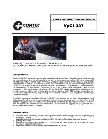 KARTA INFORMACYJNA PRODUKTU VpCI 337 BAZUJÑCY NA WODZIE INHIBITOR KOROZJI DO OCHRONY METALI MAGAZYNOWANYCH WEWNÑTRZ POMIESZCZE¡ Opis produktu Cortec VpCI-337 to gotowy do u˝ycia, bazujàcy na wodzie lotny inhibitor korozji s∏u˝àcy do ochrony antykorozyjnej metali przechowywanych w warunkach wewn´trznych. Lotne czàsteczki inhibitora zawarte w Cortec VpCI-337 migrujà i zapewniajà ochron´ antykorozyjnà, co przynosi oszcz´dnoÊci w czasie i w kosztach. Cortec VpCI-337 stosuje si´ do ochrony kraw´dzi zwojów i stert lub rozpyla w pustych przestrzeniach, zbiornikach, pojemnikach, opakowaniach i w obudowach. W ten sposób zabezpiecza si´ du˝e powierzchnie i obj´toÊci ma∏à iloÊcià preparatu i niskim nak∏adem robocizny. Cortec VpCI-337 dzia∏a szczególnie skutecznie na metale ˝elazne, aluminium i stale platerowane. Cortec VpCI-337 dobrze sprawdza si´ w ochronie antykorozyjnej najcz´Êciej stosowanych metali w przemys∏ach: metalowym i opakowaniowym. Produkty chronione Êrodkiem Cortec VpCI-337 sà gotowe do u˝ycia. Niepotrzebne jest odt∏uszczanie lub usuwanie naniesionych pow∏ok przez ostatecznego u˝ytkownika. Metal zachowa czystà i wolnà od rdzy powierzchni´. Sprawdzono, ˝e powstajàcy cienki, ochronny film nie wp∏ywa na przydatnoÊç do malowania, przewodnictwo, wyglàd lub jakàkolwiek innà wa˝nà w∏aÊciwoÊç metali i stopów. G∏ówne zalety • • • • • zawiera lotne inhibitory korozji, które jednoczeÊnie zapewniajà ochron´ antykorozyjnà wi´kszoÊci metali, pozostawia cienki, samonaprawiajàcy si´ film przyjazny dla Êrodowiska naturalnego, gotowy do u˝ycia, zapewnia ochron´ natychmiast po zastosowaniu, jest wygodny w u˝yciu i ∏atwy do usuni´cia jeÊli to konieczne, zapewnia ochron´ w warunkach wewn´trznych do 12 m-cy. www.inhibitory.pl karta informacyjna Cortec VpCI 337 strona 2 Typowe obszary zastosowaƒ • • • • • ochrona w trakcie procesu technologicznego, spryskiwanie kraw´dzi bocznych zwojów i stert blach, puste przestrzenie, wn´trza Êcian dwuwarstwowych, wype∏nianie mg∏à wn´trz. W∏aÊciwoÊci fizyczne postaç baza teoretyczne krycie powierzchni typ pow∏oki gruboÊç pow∏oki punkt zap∏onu temperatura zamarzania zawartoÊç sk∏adników nielotnych pH g´stoÊç przezroczysty do lekko m´tnego, bursztynowy p∏yn woda 23 – 46 m 2/ dm3 cienki, mi´kki film 6,3 - 12,5 µm 121°C 0°C 27 - 31 % 8,2 - 8,8 1,04 – 1,05 kg/dm3 Chronione metale • • • • • • zimno- i goràcowalcowana stal, stal krzemowa, stal nierdzewna, ˝eliwo, cynk, aluminium. Zastosowanie Nale˝y rozpylaç lub wdmuchiwaç delikatnà mgie∏k´ koncentratu Cortec VpCI-337 w iloÊci 0,4 dm 3 do pojemników, pude∏ek, skrzynek i zamkni´tych opakowaƒ na ka˝de 1,4 m3 zamkni´tej przestrzeni. Preparat mo˝na natryskiwaç na kartony, drewniane palety, sztuczne tworzywo piankowe o zamkni´tych i otwartych porach i inne materia∏y opakowaniowe. Rozpylanie preparatu wewnàtrz przestrzeni zamkni´tych powinno byç równomierne, aby pozwoliç oparom inhibitora dotrzeç bezpoÊrednio do powierzchni, które majà byç chronione. Przygotowanie produktu: Wymieszaç dok∏adnie gdy stwierdzono osad lub odmieszanie. Metody pomiaru pH roztworu: Refraktometr Czas schni´cia: do 45 minut Usuwanie produktu: Stosowaç myd∏o i wod´ do czyszczenia sprz´tu. www.inhibitory.pl karta informacyjna Cortec VpCI 337 strona 3 Opakowania i sk∏adowanie Produkt jest dost´pny w pojemnikach o obj´toÊciach 19 dm 3 i 208 dm 3 oraz w innych opakowaniach uzgodnionych z odbiorcà.. Okres trwa∏oÊci 24 miesiàce. Minimalna temeratura magazynowania: 0°C Maksymalna temeratura magazynowania: 49°C • • • • PRODUKTY WY¸ÑCZNIE DO ZASTOSOWA¡ PRZEMYS¸OWYCH CHRONIå PRZED DZIEåMI ZAMYKAå SZCZELNIE OPAKOWANIA ZAPOZNAå SI¢ Z KARTÑ BEZPIECZE¡STWA PRODUKTU PRODUKT WYTWORZONY ZGODNIE ZE STANDARDAMI JAKOÂCI ISO 9001 ORAZ ISO 14001 Wszystkie stwierdzenia, informacje techniczne i zalecenia zawarte w niniejszej karcie oparte sà na najlepszej wiedzy i doÊwiadczeniach , co do których jesteÊmy przekonani ˝e sà wiarygodne i odpowiadajà rzeczywistemu stanowi teorii i praktyki. Nie sà one jednak wià˝àce i nie tworzà ˝adnego stosunku prawnego lub umownego ani te˝ dodatkowych zobowiàzaƒ do umowy kupna - sprzeda˝y, a ich dok∏adnoÊç i kompletnoÊç nie jest gwarantowana. Cortec Corporation gwarantuje, ˝e jego produkty wysy∏ane do nabywcy sà wolne od defektów. Gwarancja ta jest ograniczona do wymiany produktu w przypadku udowodnienia jego defektu. ˚eby uzyskaç prawo do wymiany produktu w ramach niniejszej gwarancji nabywca produktu musi powiadomiç Cortec Corporation o przypisywanym defekcie w przeciàgu szeÊciu miesi´cy od daty wysy∏ki produktu do nabywcy. Wszyskie koszty wysy∏ki zwiàzane z wymianà produktu ponosi nabywca. Cortec Corporation nie ponosi ˝adnej odpowiedzialnoÊci za jakiekolwiek szkody, straty lub uszkodzenia wynikajàce z u˝ycia bàdê niemo˝noÊci u˝ycia nabytych produktów.Przed u˝yciem nabywca musi sam okreÊliç przydatnoÊç produktu do zamierzonego zastosowania na swoje ryzyko i pe∏nà odpowiedzialnoÊç z nim zwiàzanà. Jakiekolwiek informacje i stwierdzenia wykraczajàce poza niniejszà kart´ nie sà w ˝aden sposób wià˝àce dopóki nie zostanà potwierdzone umowà pisemnà. DYSTRYBUCJA i DORADZTWO: OT iK Sp. z o.o. ul. HUTNICZA 4, 81-061 GDYNIA TEL. 058 6230498, FAX 058 6230496, www.inhibitory.pl, [email protected] CORTEC®, Total Corrosion ControlTM, Migrating Corrosion InhibitorsTM, MCI® to zastrze˝one znaki towarowe firmy CORTEC, St. Paul, USA. OTiK® to zastrze˝ony znak towarowy firmy OTiK, Gdynia. TreÊç niniejszego dokumentu jest chroniona prawem. Reprodukowanie, powielanie, modyfikowanie, udost´pnianie w internecie i przekazywanie w jakikolwiek sposób elektroniczny lub mechaniczny ca∏oÊci lub fragmentów jest zabronione bez pisemnego zezwolenia OTiK Sp. z o.o