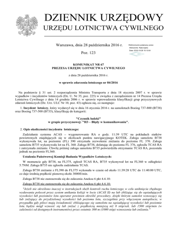 DZIENNIK URZĘDOWY URZĘDU LOTNICTWA CYWILNEGO Warszawa, dnia 28 października 2016 r. Elektronicznie podpisany przez: Aleksandra Rękorajska Poz. 123 Data: 2016-10-28 15:13:04 KOMUNIKAT NR 67 PREZESA URZĘDU LOTNICTWA CYWILNEGO z dnia 28 października 2016 r. w sprawie zdarzenia lotniczego nr 84/2016 Na podstawie § 31 ust. 2 rozporządzenia Ministra Transportu z dnia 18 stycznia 2007 r. w sprawie wypadków i incydentów lotniczych (Dz. U. Nr 35, poz. 225) w związku z zarządzeniem nr 14 Prezesa Urzędu Lotnictwa Cywilnego z dnia 14 grudnia 2006 r. w sprawie wprowadzenia klasyfikacji grup przyczynowych zdarzeń lotniczych (Dz. Urz. ULC Nr 10, poz. 43) ogłasza się, co następuje: 1. Incydent lotniczy, który wydarzył się w dniu 16 stycznia 2016 r. na samolotach Boeing 737-800 (B738) oraz Boeing 737-500 (B735), klasyfikuję do kategorii: "Czynnik ludzki" w grupie przyczynowej: "H3 – Błędy w komunikowaniu". 2. Opis okoliczności incydentu lotniczego: Zadziałanie systemu ACAS – wygenerowanie RA o godz. 11:39 UTC na pokładach statków powietrznych znajdujących się w okolicach punktu nawigacyjnego KOTEK. Załoga samolotu B738 wykonywała lot, na poziomie (FL) 390 otrzymała zezwolenie zniżania do poziomu FL 370. Załoga samolotu B735 wykonywała lot na FL 360. Załoga B738, dolatując do poziomu FL 376, zgłosiła TCAS RA i zatrzymała zniżanie. Chwilę później załoga samolotu B735 potwierdziła otrzymanie TCAS RA, pozostała jednak na poziomie FL360. Ustalenia Państwowej Komisji Badania Wypadków Lotniczych: W momencie gdy B738, na FL375, zgłosił TCAS RA, B735 wykonywał lot na FL360 w odległości 5.7NM. Załoga B735 nie zgłosiła zadziałania TCAS. Załoga B738 zniżanie z FL390 do FL375 wykonała w czasie od około 11:39:28 UTC do 11:40:00 UTC, co daje średnią prędkość pionową około 3000ft/min. Załoga B738 nie zastosowała się do zalecenia Aneksu 6 pkt 4.4.10: Załoga B738 nie zastosowała się do zalecenia Aneksu 6 pkt 4.4.10: "Jeżeli nie określono inaczej w instrukcjach służb kontroli ruchu lotniczego, w celu uniknięcia zbędnego wydawania poleceń przez system unikania kolizji w locie (ACAS II) na lub zbliżając się do sąsiadujących wysokości lub poziomów lotu operator powinien określić procedury, dzięki którym samolot wznoszący się lub zniżający do przydzielonej wysokości lub poziomu lotu, szczególnie przy włączonym autopilocie, w przypadku gdy piloci mają świadomość zbliżającego się samolotu na sąsiadującej wysokości lub poziomie lotu, będzie mógł wznosić się lub zniżać z prędkością mniejszą niż 8 stóp/sek. lub 1500 stóp/min (w zależności od dostępnych instrumentów) przez ostatnie 300 m (1000 stóp) wznoszenia lub zniżania." Dziennik Urzędowy Urzędu Lotnictwa Cywilnego –2– Poz. 123 3. Przyczyna incydentu lotniczego: Zbyt duża prędkość zniżania. Działania profilaktyczne podjęte przez podmiot badający: Zespół Badania Zdarzeń ATM przygotował informację dla zgłaszającego zdarzenie kontrolera zawierającą ustalenia z przeprowadzonego badania zdarzenia oraz dla operatora samolotu B738. 4. Zalecenia profilaktyczne Państwowej Komisji Badania Wypadków Lotniczych dotyczące bezpieczeństwa: Państwowa Komisja Badania Wypadków Lotniczych po zapoznaniu się ze zgromadzonymi w trakcie badania zdarzenia materiałami nie wydała zaleceń dotyczących bezpieczeństwa. p.o. Prezesa Urzędu Lotnictwa Cywilnego Piotr Samson