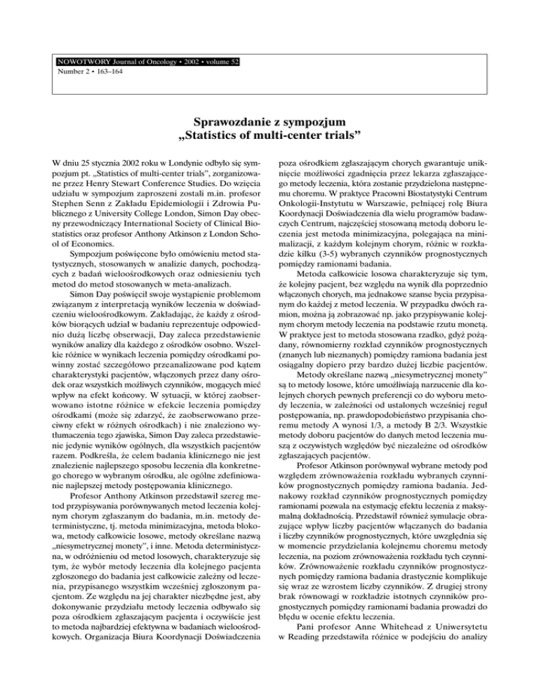 NOWOTWORY Journal of Oncology • 2002 • volume 52 Number 2 • 163–164 Sprawozdanie z sympozjum „Statistics of multi-center trials” W dniu 25 stycznia 2002 roku w Londynie odby∏o si´ sympozjum pt. „Statistics of multi-center trials”, zorganizowane przez Henry Stewart Conference Studies. Do wzi´cia udzia∏u w sympozjum zaproszeni zostali m.in. profesor Stephen Senn z Zak∏adu Epidemiologii i Zdrowia Publicznego z University College London, Simon Day obecny przewodniczàcy International Society of Clinical Biostatistics oraz profesor Anthony Atkinson z London School of Economics. Sympozjum poÊwi´cone by∏o omówieniu metod statystycznych, stosowanych w analizie danych, pochodzàcych z badaƒ wielooÊrodkowych oraz odniesieniu tych metod do metod stosowanych w meta-analizach. Simon Day poÊwi´ci∏ swoje wystàpienie problemom zwiàzanym z interpretacjà wyników leczenia w doÊwiadczeniu wielooÊrodkowym. Zak∏adajàc, ˝e ka˝dy z oÊrodków bioràcych udzia∏ w badaniu reprezentuje odpowiednio du˝à liczb´ obserwacji, Day zaleca przedstawienie wyników analizy dla ka˝dego z oÊrodków osobno. Wszelkie ró˝nice w wynikach leczenia pomi´dzy oÊrodkami powinny zostaç szczegó∏owo przeanalizowane pod kàtem charakterystyki pacjentów, w∏àczonych przez dany oÊrodek oraz wszystkich mo˝liwych czynników, mogàcych mieç wp∏yw na efekt koƒcowy. W sytuacji, w której zaobserwowano istotne ró˝nice w efekcie leczenia pomi´dzy oÊrodkami (mo˝e si´ zdarzyç, ˝e zaobserwowano przeciwny efekt w ró˝nych oÊrodkach) i nie znaleziono wyt∏umaczenia tego zjawiska, Simon Day zaleca przedstawienie jedynie wyników ogólnych, dla wszystkich pacjentów razem. PodkreÊla, ˝e celem badania klinicznego nie jest znalezienie najlepszego sposobu leczenia dla konkretnego chorego w wybranym oÊrodku, ale ogólne zdefiniowanie najlepszej metody post´powania klinicznego. Profesor Anthony Atkinson przedstawi∏ szereg metod przypisywania porównywanych metod leczenia kolejnym chorym zg∏aszanym do badania, m.in. metody deterministyczne, tj. metoda minimizacyjna, metoda blokowa, metody ca∏kowicie losowe, metody okreÊlane nazwà „niesymetrycznej monety”, i inne. Metoda deterministyczna, w odró˝nieniu od metod losowych, charakteryzuje si´ tym, ˝e wybór metody leczenia dla kolejnego pacjenta zg∏oszonego do badania jest ca∏kowicie zale˝ny od leczenia, przypisanego wszystkim wczeÊniej zg∏oszonym pacjentom. Ze wzgl´du na jej charakter niezb´dne jest, aby dokonywanie przydzia∏u metody leczenia odbywa∏o si´ poza oÊrodkiem zg∏aszajàcym pacjenta i oczywiÊcie jest to metoda najbardziej efektywna w badaniach wielooÊrodkowych. Organizacja Biura Koordynacji DoÊwiadczenia poza oÊrodkiem zg∏aszajàcym chorych gwarantuje unikni´cie mo˝liwoÊci zgadni´cia przez lekarza zg∏aszajàcego metody leczenia, która zostanie przydzielona nast´pnemu choremu. W praktyce Pracowni Biostatystyki Centrum Onkologii-Instytutu w Warszawie, pe∏niàcej rol´ Biura Koordynacji DoÊwiadczenia dla wielu programów badawczych Centrum, najcz´Êciej stosowanà metodà doboru leczenia jest metoda minimizacyjna, polegajàca na minimalizacji, z ka˝dym kolejnym chorym, ró˝nic w rozk∏adzie kilku (3-5) wybranych czynników prognostycznych pomi´dzy ramionami badania. Metoda ca∏kowicie losowa charakteryzuje si´ tym, ˝e kolejny pacjent, bez wzgl´du na wynik dla poprzednio w∏àczonych chorych, ma jednakowe szanse bycia przypisanym do ka˝dej z metod leczenia. W przypadku dwóch ramion, mo˝na jà zobrazowaç np. jako przypisywanie kolejnym chorym metody leczenia na podstawie rzutu monetà. W praktyce jest to metoda stosowana rzadko, gdy˝ po˝àdany, równomierny rozk∏ad czynników prognostycznych (znanych lub nieznanych) pomi´dzy ramiona badania jest osiàgalny dopiero przy bardzo du˝ej liczbie pacjentów. Metody okreÊlane nazwà „niesymetrycznej monety” sà to metody losowe, które umo˝liwiajà narzucenie dla kolejnych chorych pewnych preferencji co do wyboru metody leczenia, w zale˝noÊci od ustalonych wczeÊniej regu∏ post´powania, np. prawdopodobieƒstwo przypisania choremu metody A wynosi 1/3, a metody B 2/3. Wszystkie metody doboru pacjentów do danych metod leczenia muszà z oczywistych wzgl´dów byç niezale˝ne od oÊrodków zg∏aszajàcych pacjentów. Profesor Atkinson porównywa∏ wybrane metody pod wzgl´dem zrównowa˝enia rozk∏adu wybranych czynników prognostycznych pomi´dzy ramiona badania. Jednakowy rozk∏ad czynników prognostycznych pomi´dzy ramionami pozwala na estymacj´ efektu leczenia z maksymalnà dok∏adnoÊcià. Przedstawi∏ równie˝ symulacje obrazujàce wp∏yw liczby pacjentów w∏àczanych do badania i liczby czynników prognostycznych, które uwzgl´dnia si´ w momencie przydzielania kolejnemu choremu metody leczenia, na poziom zrównowa˝enia rozk∏adu tych czynników. Zrównowa˝enie rozk∏adu czynników prognostycznych pomi´dzy ramiona badania drastycznie komplikuje si´ wraz ze wzrostem liczby czynników. Z drugiej strony brak równowagi w rozk∏adzie istotnych czynników prognostycznych pomi´dzy ramionami badania prowadzi do b∏´du w ocenie efektu leczenia. Pani profesor Anne Whitehead z Uniwersytetu w Reading przedstawi∏a ró˝nice w podejÊciu do analizy 164 danych, pochodzàcych z badaƒ wielooÊrodkowych i meta-analizy. Zaprezentowa∏a i szczegó∏owo omówi∏a 6 modeli regresji, stosowanych w analizie statystycznej do oceny wyników. Porównywa∏a modele pozwalajàce na estymacj´ efektu leczenia dla ka˝dego z oÊrodków osobno, w zale˝noÊci od tego, czy interesujàcy jest efekt w konkretnym oÊrodku (fixed-effect models), czy te˝ raczej interesujàcy jest Êredni efekt w wybranych oÊrodkach, traktowanych jedynie jako reprezentacja wszystkich potencjalnych oÊrodków, zajmujàcych si´ wybranym rodzajem leczenia (random-effect models). Kolejne wystàpienie dotyczy∏o sposobów an