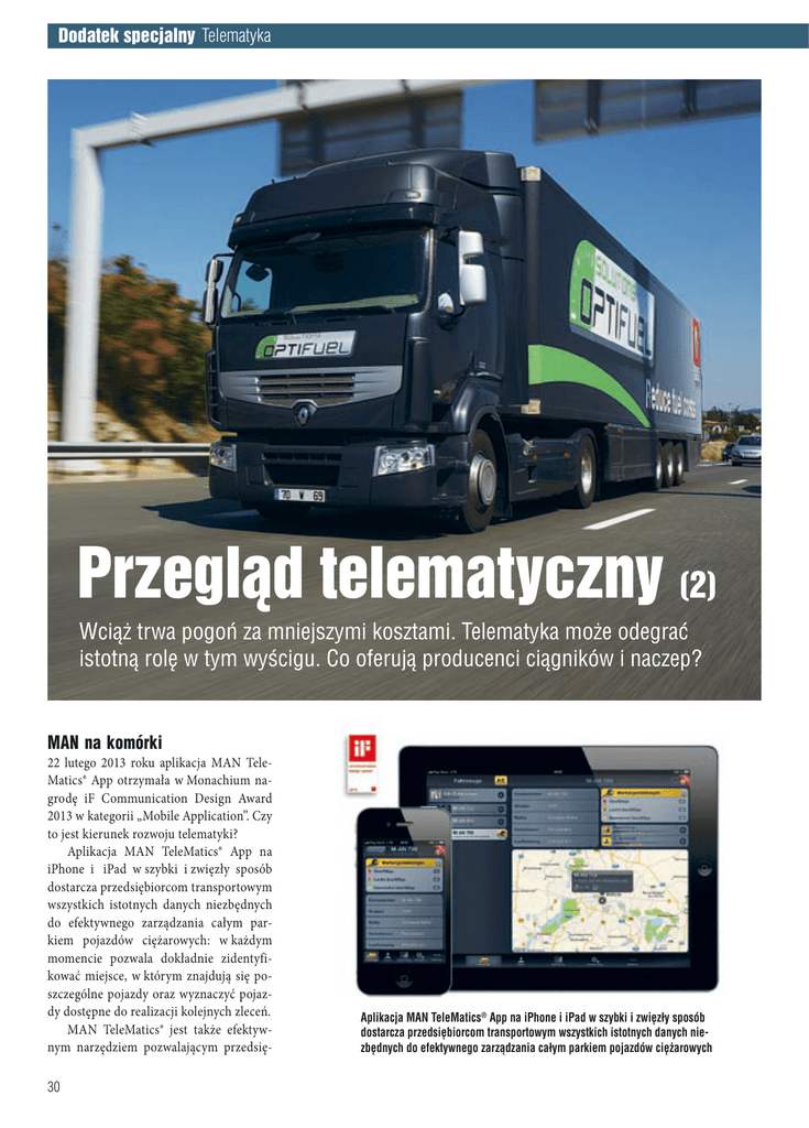 Dodatek specjalny Telematyka Przegląd telematyczny (2) Wciąż trwa pogoń za mniejszymi kosztami. Telematyka może odegrać istotną rolę w tym wyścigu. Co oferują producenci ciągników i naczep? MAN na komórki 22 lutego 2013 roku aplikacja MAN TeleMatics® App otrzymała w Monachium nagrodę iF Communication Design Award 2013 w kategorii „Mobile Application’’. Czy to jest kierunek rozwoju telematyki? Aplikacja MAN TeleMatics® App na iPhone i iPad w szybki i zwięzły sposób dostarcza przedsiębiorcom transportowym wszystkich istotnych danych niezbędnych do efektywnego zarządzania całym parkiem pojazdów ciężarowych: w każdym momencie pozwala dokładnie zidentyfikować miejsce, w którym znajdują się poszczególne pojazdy oraz wyznaczyć pojazdy dostępne do realizacji kolejnych zleceń. MAN TeleMatics® jest także efektywnym narzędziem pozwalającym przedsię30 Aplikacja MAN TeleMatics® App na iPhone i iPad w szybki i zwięzły sposób dostarcza przedsiębiorcom transportowym wszystkich istotnych danych niezbędnych do efektywnego zarządzania całym parkiem pojazdów ciężarowych FleetBoard transmituje informacje o pojeździe i przebiegu kursu przez sygnał radiowy, podczas gdy pojazd jest w drodze. Sygnał zabezpiecza hasło biorcom na zmniejszenie zużycia paliwa – z każdego pojazdu przesyłane są dane dotyczące zużycia paliwa, pustych przebiegów, wykorzystania retardera i tempomatu, a także informacje o jeździe w optymalnym zakresie liczby obrotów silnika oraz o konsekwentnym korzystaniu z opcji hamowania silnikiem. Nowa aplikacja rozszerza system MAN TeleMatics® o dostęp do kolejnej funkcji mobilnej. Dzięki niej użytkownik może w każdym momencie – także przebywając poza biurem – sprawdzić, czy pojazdy znajdują się w dobrym stanie technicznym oraz czy kierowcy prowadzą samochody w sposób pozwalający na niskie zużycie paliwa i materiałów. Osoba odpowiadająca za flotę pojazdów może w ten sposób identyfikować bieżące zapotrzebowanie na naprawy i przeglądy pojazdów oraz na szkolenia kierowców. Nowa aplikacja umożliwia także otwieranie raportów zawierających kolorowe wykresy słupkowe, na podstawie których można wygodnie analizować efektywność poszczególnych pojazdów znajdujących się w trasie. Aplikacja MAN TeleMatics® App posiada także funkcje w zakresie komunikacji: kierowca i dysponent mogą wysyłać maile bezpośrednio z aplikacji. W aplikacji iPhone App znajduje się ponadto funkcja telefonu, dzięki której kierowca jest dostępny bezpośrednio pod numerem komórkowym. cym aplikacje do zarządzania i analizowania operacji floty przystosowane do iPhone’a i iPad’a firmy Apple. Umożliwia to całodobową kontrolę nad pojazdami ciężarowymi dostawczymi oraz przeprowadzanie analizy operacyjnej ostatniego kursu. FleetBoard transmituje informacje o pojeździe i przebiegu kursu przez sygnał radiowy, podczas gdy pojazd jest w drodze. Sygnał zabezpiecza hasło. Na podstawie tych danych, program komputerowy pozwala na oszacowanie kosztów zużycia benzyny i serwisowania, ale także pozwala na redukcję emisji CO2 w samochodach użytkowych już w ciągu pierwszych trzech miesięcy korzystania. Co więcej, usługa pozwala na zintegrowaną kontrolę pracy kierowcy i pojazdu nawet w ramach najbardziej skomplikowanych operacji. Dyspozytorzy mogą w każdej chwili wysyłać kierowcom wiadomości tekstowe, umożliwiając im szybkie przyjmowanie zleceń, zachowując kontrolę nad pozostałym czasem ,,za kółkiem’’. Dodatkowo najnowszy FleetBoard daje dostęp do wszelkich instrukcji, raportów i wiadomości. Korzystanie z nowej aplikacji jest konwencjonalne i możliwe we wszystkich pojazdach wyposażonych we FleetBoard i posiadających umowę na obsługę systemu. Nowa aplikacja może zostać ściągnięta w wirtualnym sklepie firmy Apple – App-Store – w pełni za darmo i natychmiastowo. Dynafleet – Volvo Trucks Dynafleet to internetowy System Informacji Transportowej Volvo Trucks, umożliwiający poprawę rentowności. Można sprawdzać aktualną lokalizację swoich pojazdów, monitorować zużycie paliwa, przesłane wiadomości, czasy pracy kierowców, okresy międzyobsługowe i wiele innych parametrów. Czytelne i precyzyjne informacje, jakie zapewnia system, ułatwiają podejmowanie właściwych decyzji. Najnowsza generacja systemu ma większe możliwości niż kiedykolwiek wcześniej i jest dostępna w trzech pakietach dostosowanych do różnych potrzeb. Renault Trucks – Optifuel Szczegóły wyjaśnia Marcin Majak, marketing manager Renault Trucks Central East Market Właściciele firm transportowych coraz częściej zastanawiają się jak i na czym zaoszczędzić, szukają pomysłów jak skuteczniej administrować flotą pojazdów i czasem pracy pracowników. Dynafleet to internetowy System Informacji Transportowej Volvo Trucks, umożliwiający poprawę rentowności Daimler FleetBoard Spółka Daimler FleetBoard jest pierwszym dostawcą rozwiązań telematycznych oferują31 Dodatek specjalny Telematyka Producenci naczep TControl Krone Optifuel zawiera w sobie kilka pomniejszych elementów takich jak: Optifuel Infomax, Optifuel Training czy Optifuel Technology Wydatki na paliwo stanowią istotną pozycję wśród wydatków firmy, dlatego też informacja ile dany pojazd zużywa paliwa, gdzie i kiedy jest tankowany jest kluczowa dla wydajnego zarządzania firmą. Częstym sposobem na zoptymalizowanie wydatków jest system do zarządzania flotą. Systemy telematyczne stały się standardem wyposażenia pojazdów, tak jak na przykład klimatyzacja. Coraz więcej samochodów ciężarowych na pierwszym wyposażeniu posiada na pokładzie mniej lub bardziej rozwinięte systemy telematyczne. Wszystkie samochody Renault Trucks (z wyjątkiem gamy pojazdów dostawczych) opuszczają fabrykę przystosowane do współpracy z Infomaxem. Infomax jest narzędziem dostarczającym informacji na temat jakości pr