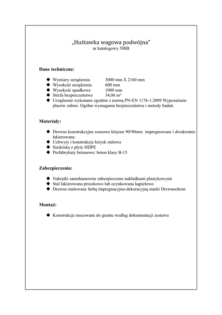 „Huśtawka wagowa podwójna” nr katalogowy 508B Dane techniczne: Wymiary urządzenia 3000 mm X 2160 mm Wysokość urządzenia 600 mm Wysokość upadkowa 1000 mm Strefa bezpieczeństwa 34,06 m² Urządzenie wykonane zgodnie z normą PN-EN 1176-1:2009 Wyposażenie placów zabaw. Ogólne wymagania bezpieczeństwa i metody badań. Materiały: Drewno konstrukcyjne sosnowe klejone 90/90mm impregnowane i dwukrotnie lakierowane. Uchwyty i konstrukcja łożysk stalowa Siedziska z płyty HDPE Prefabrykaty betonowe: beton klasy B-15 Zabezpieczenia: Nakrętki samohamowne zabezpieczone nakładkami plastykowymi Stal lakierowana proszkowo lub ocynkowana kąpielowo Drewno malowane farbą impregnacyjno-dekoracyjną marki Drewnochron Montaż: Konstrukcje mocowane do gruntu według dokumentacji zestawu