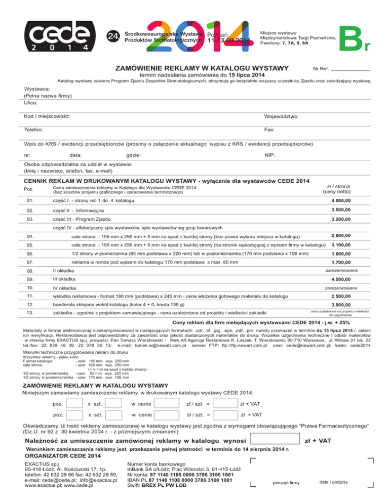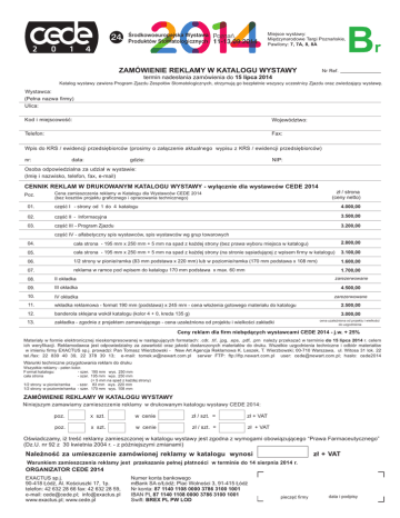Miejsce wystawy: Międzynarodowe Targi Poznańskie, Pawilony: 7, 7A, 8, 8A ZAMÓWIENIE REKLAMY W KATALOGU WYSTAWY Br Nr Ref. termin nadesłania zamówienia do 15 lipca 2014 Katalog wystawy zawiera Program Zjazdu Zespołów Stomatologicznych, otrzymują go bezpłatnie wszyscy uczestnicy Zjazdu oraz zwiedzający wystawę. Wystawca: (Pełna nazwa firmy) Ulica: Kod i miejscowość: Województwo: Telefon: Fax: Wpis do KRS / ewidencji przedsiębiorców (prosimy o załączenie aktualnego wypisu z KRS / ewidencji przedsiębiorców) data: nr: NIP: gdzie: Osoba odpowiedzialna za udział w wystawie: (Imię i nazwisko, telefon, fax, e-mail) CENNIK REKLAM W DRUKOWANYM KATALOGU WYSTAWY - wyłącznie dla wystawców CEDE 2014 Poz. zł / strona (ceny netto) Cena zamieszczenia reklamy w Katalogu dla Wystawców CEDE 2014 (bez kosztów projektu graficznego i opracowania technicznego) 01. część I - strony od 1 do 4 katalogu 4.000,00 02. część II - Informacyjna 3.500,00 03. część III - Program Zjazdu 3.200,00 część IV - alfabetyczny spis wystawców, spis wystawców wg grup towarowych 04. cała strona - 195 mm x 250 mm + 5 mm na spad z każdej strony (bez prawa wyboru miejsca w katalogu) 2.800,00 05. cała strona - 195 mm x 250 mm + 5 mm na spad z każdej strony (na stronie sąsiadującej z wpisem firmy w katalogu) 3.100,00 06. 1/2 strony w pionie/ramka (83 mm podstawa x 220 mm) lub w poziomie/ramka (170 mm podstawa x 108 mm) 1.600,00 07. reklama w ramce pod wpisem do katalogu 170 mm podstawa x max. 60 mm 1.700,00 08. II okładka zarezerwowane 09. III okładka 4.500,00 10. IV okładka zarezerwowane 11. wkładka reklamowa - format 190 mm (podstawa) x 245 mm - cena włożenia gotowego materiału do katalogu 12. banderola sklejana wokół katalogu (kolor 4 + 0, kreda 135 g) 13. zakładka - zgodnie z projektem zamawiającego - cena uzależniona od projektu i wielkości zakładki 2.500,00 3.000,00 cena uzależniona od projektu i wielkości do uzgodnienia Ceny reklam dla firm niebędących wystawcami CEDE 2014 - j.w. + 25% Materiały w formie elektronicznej nieskompresowanej w następujących formatach: .cdr, .tif, .jpg, .eps, .pdf, .prn należy przekazać w terminie do 15 lipca 2014 r. celem ich weryfikacji. Reklamodawca jest odpowiedzialny za zawartość oraz jakość dostarczonych materiałów do druku. Wszelkie uzgodnienia techniczne i odbiór materiałów w imieniu firmy EXACTUS sp.j. prowadzi: Pan Tomasz Wierzbowski - New Art Agencja Reklamowa K. Leszek, T. Wierzbowski; 00-710 Warszawa, ul. Witosa 31 lok. 22 tel./fax: 22 839 40 39, 22 378 39 13; e-mail: [email protected] serwer FTP: ftp://ftp.newart.com.pl user: [email protected]; hasło: cede2014 Warunki techniczne przygotowania reklam do druku Wszystkie reklamy - pełen kolor. F ormat katalogu: - szer. 195 mm wys. 250 mm cała strona - szer. 195 mm wys. 250 mm (+ 5 mm na spad z każdej strony) 1/2 strony w pionie/ramka - szer. 83 mm wys. 220 mm 1/2 strony w poziomie/ramka - szer. 170 mm wys. 108 mm ZAMÓWIENIE REKLAMY W KATALOGU WYSTAWY Niniejszym zamawiamy zamieszczenie reklamy w drukowanym katalogu wystawy CEDE 2014: poz. x szt. w cenie zł / szt. = zł + VAT poz. x szt. w cenie zł / szt. = zł + VAT Oświadczamy, iż treść reklamy zamieszczonej w katalogu wystawy jest zgodna z wymogami obowiązującego “Prawa Farmaceutycznego” (Dz.U. nr 92 z 30 kwietnia 2004 r. - z późniejszymi zmianami) Należność za umieszczenie zamówionej reklamy w katalogu wynosi zł + VAT Warunkiem zamieszczenia reklamy jest przekazanie pełnej płatności w terminie do 14 sierpnia 2014 r. ORGANIZATOR CEDE 2014 EXACTUS sp.j. 90-418 Łódź, Al. Kościuszki 17, 1p. telefon: 42 632 28 66 fax: 42 632 28 59, e-mail: [email protected]; [email protected] www.exactus.pl; www.cede.pl Numer konta bankowego mBank SA o/Łódź; Plac Wolności 3, 91-415 Łódź Nr konta: 87 1140 1108 0000 3786 3100 1001 IBAN PL 87 1140 1108 0000 3786 3100 1001 Swift: BREX PL PW LOD pieczęć firmy data i podpisy