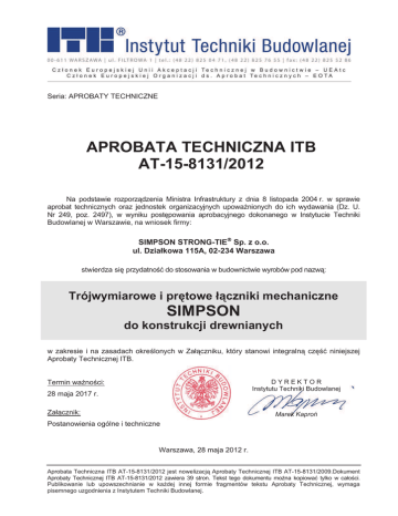 Seria: APROBATY TECHNICZNE Egzemplarz archiwalny APROBATA TECHNICZNA ITB AT-15-8131/2012 Na podstawie rozporządzenia Ministra Infrastruktury z dnia 8 listopada 2004 r. w sprawie aprobat technicznych oraz jednostek organizacyjnych upowaĪnionych do ich wydawania (Dz. U. Nr 249, poz. 2497), w wyniku postĊpowania aprobacyjnego dokonanego w Instytucie Techniki Budowlanej w Warszawie, na wniosek firmy: SIMPSON STRONG-TIE£ Sp. z o.o. ul. Dziaákowa 115A, 02-234 Warszawa stwierdza siĊ przydatnoĞü do stosowania w budownictwie wyrobów pod nazwą: Trójwymiarowe i prĊtowe áączniki mechaniczne SIMPSON do konstrukcji drewnianych w zakresie i na zasadach okreĞlonych w Zaáączniku, który stanowi integralną czĊĞü niniejszej Aprobaty Technicznej ITB. DYREKTOR Instytutu Techniki Budowlanej Termin waĪnoĞci: 28 maja 2017 r. Zaáącznik: Marek KaproĔ Postanowienia ogólne i techniczne Warszawa, 28 maja 2012 r. Aprobata Techniczna ITB AT-15-8131/2012 jest nowelizacją Aprobaty Technicznej ITB AT-15-8131/2009.Dokument Aprobaty Technicznej ITB AT-15-8131/2012 zawiera 39 stron. Tekst tego dokumentu moĪna kopiowaü tylko w caáoĞci. Publikowanie lub upowszechnianie w kaĪdej innej formie fragmentów tekstu Aprobaty Technicznej, wymaga pisemnego uzgodnienia z Instytutem Techniki Budowlanej.