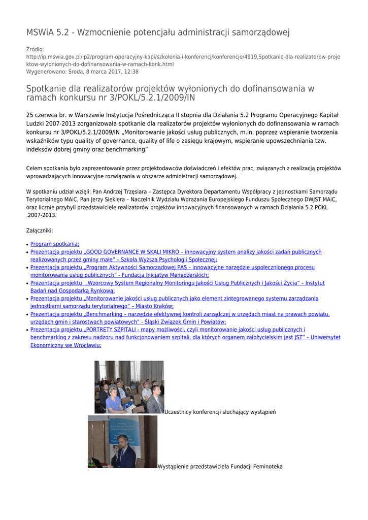 MSWiA 5.2 - Wzmocnienie potencjału administracji samorządowej Źródło: http://ip.mswia.gov.pl/ip2/program-operacyjny-kapi/szkolenia-i-konferencj/konferencje/4919,Spotkanie-dla-realizatorow-proje ktow-wylonionych-do-dofinansowania-w-ramach-konk.html Wygenerowano: Środa, 8 marca 2017, 12:38 Spotkanie dla realizatorów projektów wyłonionych do dofinansowania w ramach konkursu nr 3/POKL/5.2.1/2009/IN 25 czerwca br. w Warszawie Instytucja Pośrednicząca II stopnia dla Działania 5.2 Programu Operacyjnego Kapitał Ludzki 2007-2013 zorganizowała spotkanie dla realizatorów projektów wyłonionych do dofinansowania w ramach konkursu nr 3/POKL/5.2.1/2009/IN „Monitorowanie jakości usług publicznych, m.in. poprzez wspieranie tworzenia wskaźników typu quality of governance, quality of life o zasięgu krajowym, wspieranie upowszechniania tzw. indeksów dobrej gminy oraz benchmarking” Celem spotkania było zaprezentowanie przez projektodawców doświadczeń i efektów prac, związanych z realizacją projektów wprowadzających innowacyjne rozwiązania w obszarze administracji samorządowej. W spotkaniu udział wzięli: Pan Andrzej Trzęsiara – Zastępca Dyrektora Departamentu Współpracy z Jednostkami Samorządu Terytorialnego MAiC, Pan Jerzy Siekiera – Naczelnik Wydziału Wdrażania Europejskiego Funduszu Społecznego DWJST MAiC, oraz licznie przybyli przedstawiciele realizatorów projektów innowacyjnych finansowanych w ramach Działania 5.2 POKL .2007-2013. Załączniki: ● ● ● ● ● ● ● Program spotkania; Prezentacja projektu „GOOD GOVERNANCE W SKALI MIKRO – innowacyjny system analizy jakości zadań publicznych realizowanych przez gminy małe” – Szkoła Wyższa Psychologii Społecznej; Prezentacja projektu „Program Aktywności Samorządowej PAS – innowacyjne narzędzie uspołecznionego procesu monitorowania usług publicznych” - Fundacja Inicjatyw Menedżerskich; Prezentacja projektu „Wzorcowy System Regionalny Monitoringu Jakości Usług Publicznych i Jakości Życia” – Instytut Badań nad Gospodarką Rynkową; Prezentacja projektu „Monitorowanie jakości usług publicznych jako element zintegrowanego systemu zarządzania jednostkami samorządu terytorialnego” – Miasto Kraków; Prezentacja projektu „Benchmarking – narzędzie efektywnej kontroli zarządczej w urzędach miast na prawach powiatu, urzędach gmin i starostwach powiatowych” - Śląski Związek Gmin i Powiatów; Prezentacja projektu „PORTRETY SZPITALI - mapy możliwości, czyli monitorowanie jakości usług publicznych i benchmarking z zakresu nadzoru nad funkcjonowaniem szpitali, dla których organem założycielskim jest JST” – Uniwersytet Ekonomiczny we Wrocławiu; Uczestnicy konferencji słuchający wystąpień Wystąpienie przedstawiciela Fundacji Feminoteka Wystąpienie przedstawiciela Fundacji Inicjatyw Menadżerskich Wystąpienie przedstawiciela miasta Krakowa Wystąpienie przedstawicieli Instytutu Badań nad Gospodarką Rynkową Wystąpienie przedstawicieli Szkoły Wyższej Psychologi Społecznej Dyrektor Andrzej Trzęsiara otwiera konferencję Dyrektor Andrzej Trzęsiara przemawia przed zebranymi Drukuj Generuj PDF Powiadom znajomego Wstecz