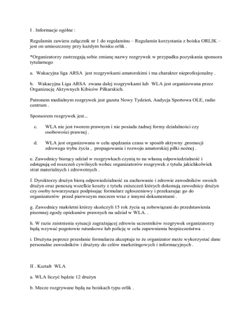 I . Informacje ogólne : Regulamin zawiera załącznik nr 1 do regulaminu – Regulamin korzystania z boiska ORLIK – jest on umieszczony przy każdym boisku orlik . *Organizatorzy zastrzegają sobie zmianę nazwy rozgrywek w przypadku pozyskania sponsora tytularnego a. Wakacyjna liga ARSA jest rozgrywkami amatorskimi i ma charakter nieprofesjonalny . b. Wakacyjna Liga ARSA zwana dalej rozgrywkami lub WLA jest organizowana przez Organizację Aktywnych Kibiców Piłkarskich. Patronem medialnym rozgrywek jest gazeta Nowy Tydzień, Audycja Sportowa OLE, radio centrum . Sponsorem rozgrywek jest... c. WLA nie jest tworem prawnym i nie posiada żadnej formy działalności czy osobowości prawnej . d. WLA jest organizowana w celu spędzania czasu w sposób aktywny ,promocji zdrowego trybu życia , propagowania i rozwoju amatorskiej piłki nożnej . e. Zawodnicy biorący udział w rozgrywkach czynią to na własną odpowiedzialność i odstępują od roszczeń cywilnych wobec organizatorów rozgrywek z tytułu jakichkolwiek strat materialnych i zdrowotnych . f. Dyrektorzy drużyn biorą odpowiedzialność za zachowanie i zdrowie zawodników swoich drużyn oraz ponoszą wszelkie koszty z tytułu zniszczeń których dokonują zawodnicy drużyn czy osoby towarzyszące podpisując formularz zgłoszeniowy i przekazując go do organizatorów przed pierwszym meczem wraz z innymi dokumentami . g. Zawodnicy małoletni którzy skończyli 15 rok życia są zobowiązani do przedstawienia pisemnej zgody opiekunów prawnych na udział w WLA. . h. W razie zaistnienia sytuacji zagrażającej zdrowiu uczestników rozgrywek organizatorzy będą wzywać pogotowie ratunkowe lub policję w celu zapewnienia bezpieczeństwa . i. Drużyna poprzez przesłanie formularza akceptuje to że organizator może wykorzystać dane personalne zawodników i drużyny do celów marketingowych i informacyjnych . II . Kształt WLA a. WLA liczyć będzie 12 drużyn b. Mecze rozgrywane będą na boiskach typu orlik . c. Rozgrywkami zarządzać będzie zarząd OAKP zwany dalej organizatorem , który dokonywać będzie weryfikacji wyników ,statystyk oraz wszelkich roszczeń pomiędzy drużynami . d. Do rozgrywek przystępują drużyny ,które złożą aplikację zgłoszeniową w formie elektronicznej a następnie przed pierwszym meczem zgłoszą w formie pisemnej wypełniony formularz zgłoszeniowy oraz ewentualnie zgody na udział małoletniego w rozgrywkach . e. Rozgrywki podzielone będą na fazę 1 i 2 . O liczbach drużyn w grupie decyduje organizator . O tym jakie drużyny zagrają w poszczególnych grupach zadecyduje losowanie bez podziału na koszyki . f. Przed każdym meczem obowiązuje 1 minutowa rozgrzewka na boisku . III. Rozgrywki WLA a. Terminy meczów ustalać będzie organizator i podawać je na swojej stronie internetowej na minimum 4 dni przed planowanym pierwszym meczem danej kolejki . Mecze odbywać się będą w dni powszednie tygodnia lub w soboty w godzinach udostępnionych przez zarządców boisk typu Orlik. Mecz trwać będzie 2 razy po 20 minut połowa .Drużyny grające w rozgrywkach mecze rozgrywać będą po 6 zawodników łącznie z bramkarzem . b. Wszelkie informacje dotyczące rozgrywek będzie można uzyskać na oficjalnej stronie OAKP– www.arsenallublin.futbolowo.pl oraz pomocniczo na forum pilkonogia.pl , które będzie tylko nośnikiem informacji o rozgrywkach a także forum rozgrywek. c. Miejsce rozgrywania WLA, boiska typu Orlik posiadają odrębny regulamin którego należy przestrzegać i jest to obowiązkiem każdej drużyny . Za nie przestrzeganie regulaminu boisk orlik grozi kara odjęcia punktów drużyny lub indywidualne kary dyscyplinarne d. Organizator w ciągu 24 godzin od zakończenia danego meczu będzie weryfikować wyniki , podawać pełne statystyki oraz ewentualne zawieszenia zawodników na kolejne mecze . e. Organizator ustalać będzie obsadę sędziowską na mecze na jeden dzień przed danym meczem . f. Wszelkie protesty do organizatorów związane z sędziowaniem ,strzelcami goli ,zawieszeniami i organizacją meczu może kierować tylko i wyłącznie dyrektor drużyny w formie pisemnej/pisemnej elektronicznej w ciągu do 24 godzin od zakończenia meczu danej drużyny . g. Zawody prowadzi jeden lub więcej sędziów w zależności od ustalenia obsady przez organizatorów . Sędzia lub organizator może nie dopuścić do gry zawodnika gdy : Nie ma on odpowiedniego obuwia Jest pod wpływem alkoholu lub środków odurzających Nie jest tym zawodnikiem za którego się podaje W przypadku stwierdzenia po meczu ,że w drużynie zagrał zawodnik nie uprawniony do gry organizator może nałożyć karę walkowera na zespół w którym ten zawodnik wystąpił i zweryfikować wynik już zakończonego meczu zgodnie z regulaminem . IV Punktacja, Przepisy ,Tabele , Wyłaniane zwycięzców rozgrywek , Walkowery * Rozgrywki w swojej formule są systemem ligowym * a. Za wygrany mecz drużyna otrzymuje 3 punkty , za remis 1 punkt , za porażkę 0 punktów . b. O zwycięstwie w lidze decyduje liczba punktów zdobytych przez drużynę w sezonie . W przypadku równej liczby punktów zdobytej przez dwie drużyny o zwycięstwie w grupie decyduje w pierwszej kolejności: bilans bramkowy z ( +/-), następnie bilans klasyfikacji fair play .(ilość żółtych i czerwonych kartek) Mniejsza ilość goli straconych Jeżeli w przypadku równego statusu w wymienionych kategoriach decyduje dodatkowy Złoty mecz o miejsce . W przypadku równej liczby punktów zdobytych prze 3 i więcej drużyn tworzy się mini tabelę z uwzględnieniem meczów pomiędzy zainteresowanymi drużynami gdzie : w pierwszej kolejności decyduje suma punktów w tych spotkaniach ,następnie bilans bramek z całej ligi +/- ,następnie bilans bramek strzelonych ( kto więcej ), następnie klasyfikacja fair play , następnie ilość punktów zdobytych z pozostałymi drużynami w lidze . W przypadku dalszego nie wyłonienia mistrza rozegran