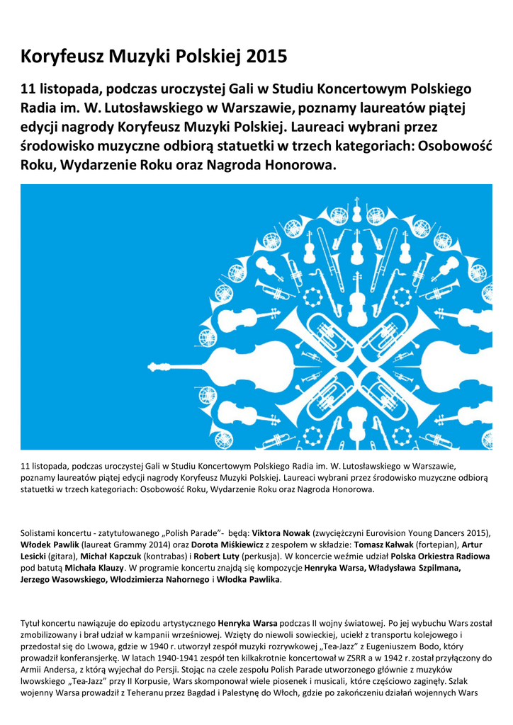 Koryfeusz Muzyki Polskiej 2015 11 listopada, podczas uroczystej Gali w Studiu Koncertowym Polskiego Radia im. W. Lutosławskiego w Warszawie, poznamy laureatów piątej edycji nagrody Koryfeusz Muzyki Polskiej. Laureaci wybrani przez środowisko muzyczne odbiorą statuetki w trzech kategoriach: Osobowość Roku, Wydarzenie Roku oraz Nagroda Honorowa. 11 listopada, podczas uroczystej Gali w Studiu Koncertowym Polskiego Radia im. W. Lutosławskiego w Warszawie, poznamy laureatów piątej edycji nagrody Koryfeusz Muzyki Polskiej. Laureaci wybrani przez środowisko muzyczne odbiorą statuetki w trzech kategoriach: Osobowość Roku, Wydarzenie Roku oraz Nagroda Honorowa. Solistami koncertu - zatytułowanego „Polish Parade”- będą: Viktora Nowak (zwyciężczyni Eurovision Young Dancers 2015), Włodek Pawlik (laureat Grammy 2014) oraz Dorota Miśkiewicz z zespołem w składzie: Tomasz Kałwak (fortepian), Artur Lesicki (gitara), Michał Kapczuk (kontrabas) i Robert Luty (perkusja). W koncercie weźmie udział Polska Orkiestra Radiowa pod batutą Michała Klauzy. W programie koncertu znajdą się kompozycje Henryka Warsa, Władysława Szpilmana, Jerzego Wasowskiego, Włodzimierza Nahornego i Włodka Pawlika. Tytuł koncertu nawiązuje do epizodu artystycznego Henryka Warsa podczas II wojny światowej. Po jej wybuchu Wars został zmobilizowany i brał udział w kampanii wrześniowej. Wzięty do niewoli sowieckiej, uciekł z transportu kolejowego i przedostał się do Lwowa, gdzie w 1940 r. utworzył zespół muzyki rozrywkowej „Tea-Jazz” z Eugeniuszem Bodo, który prowadził konferansjerkę. W latach 1940-1941 zespół ten kilkakrotnie koncertował w ZSRR a w 1942 r. został przyłączony do Armii Andersa, z którą wyjechał do Persji. Stojąc na czele zespołu Polish Parade utworzonego głównie z muzyków lwowskiego „Tea-Jazz” przy II Korpusie, Wars skomponował wiele piosenek i musicali, które częściowo zaginęły. Szlak wojenny Warsa prowadził z Teheranu przez Bagdad i Palestynę do Włoch, gdzie po zakończeniu działań wojennych Wars został udekorowany medalem Cavaliere della Croce przez ostatniego króla Włoch, a zespół Polish Parade otrzymał nagrodę za najlepszy zespół muzyczny wśród aliantów. Galę, której organizatorem jest Instytut Muzyki i Tańca oraz Program 2 Polskiego Radia, poprowadzą Agata Kwiecińska i Marcin Majchrowski. Gala wręczenia nagrody będzie transmitowana „na żywo” na stronie internetowej www.koryfeusz.org.pl. Początek transmisji o godz. 19.00. Laureaci otrzymają statuetkę Koryfeusza autorstwa prof. Adama Myjaka. Nagrody finansowe ufundowało Stowarzyszenie Autorów ZAiKS oraz Związek Artystów Wykonawców STOART. O miano Koryfeusza Muzyki Polskiej w kategorii Osobowość Roku rywalizować będą: saksofonista Paweł Gusnar, pianista jazzowy, kompozytor i aranżer Nikola Kołodziejczyk, kompozytorzy Paweł Mykietyn i Marcin Stańczyk oraz dyrygentka Anna Szostak-Myrczek. Muzycznym Wydarzeniem Roku zostanie jedno z pięciu nominowanych: · · · · · Koncert i album „Requiem ludowe” w wykonaniu Adama Struga i zespołu Kwadrofonik, zrealizowane przez Program 2 Polskiego Radia, Otwarcie nowej siedziby Narodowej Orkiestry Symfonicznej Polskiego Radia w Katowicach oraz Festiwal Otwarcia, Spektakl „Agrippina” G.F. Haendla w Teatrze Stanisławowskim w Łazienkach Królewskich w Warszawie, zrealizowany przez Stowarzyszenie Miłośników Sztuki Barokowej „Dramma per musica”, Spektakle Teatru Wielkiego – Opery Narodowej „Jolanta” Piotra Czajkowskiego i „Zamek Sinobrodego” Beli Bartóka w reżyserii Mariusza Trelińskiego w Metropolitan Opera w Nowym Jorku, Zwycięstwo Viktorii Nowak w konkursie Eurovision Young Dancers 2015 – Eurowizji dla Młodych Tancerzy w Teatrze Nowym w Pilznie. Ze względu na charakter Nagrody Honorowej, nazwisko laureata zostanie ogłoszone dopiero podczas Gali wręczenia nagród. Sylwetki nominowanych osób, opisy wydarzeń, a także szczegółowy program koncertu dostępne są na stronie www.koryfeusz.org.pl.