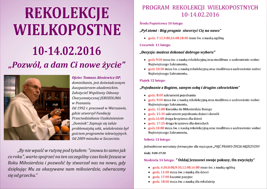 REKOLEKCJE WIELKOPOSTNE 10- 14 . 02.2016 PROGRAM REKOLEKCJI WIELKOPOSTNYCH 1 0 -1 4 .0 2 .2 0 1 6 Środa Popielcowa 10 lutego: „Pył ziemi - Bóg p ragn ie stworzyć Cię na nowo" • Czwartek 11 lutego: „Decyzja: możesz dokonać dobrego wyboru" • „Pozwól, a dam Ci nowe życie" godz. 7 :1 5 ,9 :0 0 ,1 6 :0 0 ,1 8 :0 0 m sze św. z n au k ą ogólną godz 9 :0 0 m sza św. z nauką rek o lek cy jn ą oraz m od litw a o u zd row ien ie w o b ec N ajśw iętszego Sak ram en tu , • godz 1 8 :3 0 m sza ś w. z nauką re k o le k cy jn ą oraz m od litw a o u zd row ien ie w o b ec N ajsw iętszego Sak ram en tu , Ojciec Tomasz Alexiewicz OP, dominikanin, jest doświadczonym duszpasterzem akademickim. Założyciel Wspólnoty Odnowy Charyzmatycznej JEROZOLIMA w Poznaniu. Od 1992 r. pracował w Warszawie, gdzie utworzył Fundację Przeciwdziałania Uzależnieniom „Dominik". Zajmuje się także problematyką sekt, wielokrotnie był gościem programów telewizyjnych. Od 2009 mieszka w Szczecinie. Piątek 12 lutego: „Pojednanie z Bogiem, samym sobą i drugim człowiekiem" • godz. 8 :0 0 sa k ra m e n t p o jed n an ia • godz. 9 :0 0 m sza św. z nauką re k o le k cy jn ą oraz m od litw a o u zd row ien ie w o b ec N ajsw iętszego Sak ram en tu , • godz. 1 5 :0 0 K oronka do M iłosierd zia Bożego • godz. 1 5 :3 0 sa k ra m e n t p o jed n an ia dzieci i d orosli • g o d z .1 6 :0 0 droga krzyzow a dla dzieci • godz. 1 7 :1 5 droga k rzyzow a dla d o ro sły ch • g o d z .1 8 :0 0 m sza sw. z nauką re k o le k cy jn ą oraz m odlitw a o u zd row ien ie w o b ec N ajsw iętszego Sak ram en tu , Sobota 13 lutego: Jedno dniowe warsztaty form acyjne dla mężczyzn „PIĘĆ PRAWD ŻYCIA MĘŻCZYZNY „By nie wpaść w rutynę pod tytułem: "znowu to samo jak co roku", warto spojrzeć na ten szczególny czas łaski Jezusa w Roku Miłosierdzia i pozwolić by stwarzał nas na nowo, gdy dziękując Mu za okazywane nam miłosierdzie, odwracamy się od grzechu." Godz. 9:00-17:30 Niedziela 14 lutego: ”Oddaj Jezusowi swoje pokusy, On zwycięży” • godz. 6 :3 0 ,8 :0 0 ,9 :3 0 ,1 2 :0 0 ,1 6 :0 0 m sze św. z nauką ogó lną • godz. 1 1 :0 0 m sza ś w. z nauką dla dzieci • godz. 1 7 :0 0 k az a n ie p asy jn e • godz. 1 8 :0 0 m sza ś w. z nauką dla m ło d zieży