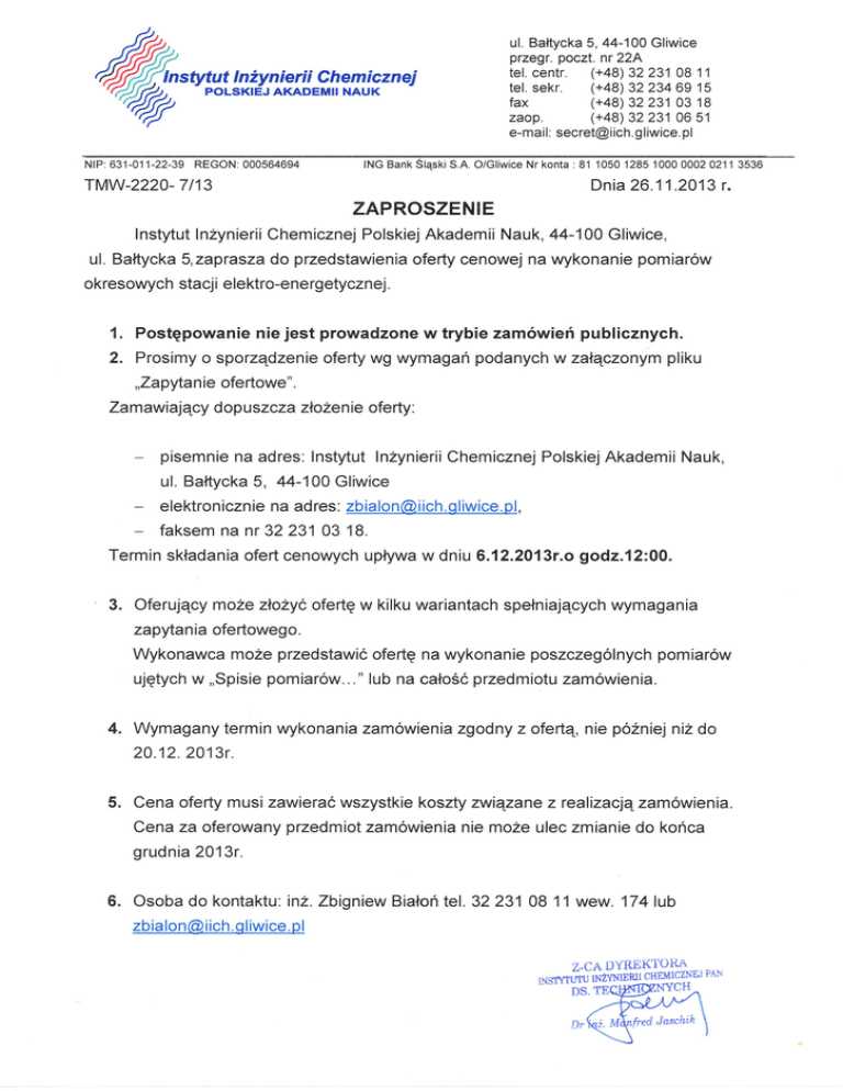 I //-) , Bałtycka 5' 44-100 GIiwice przegr. poczt. nr 224 tel. centr. (+48) 32 231 08 11 .)'rź). u|. r//fff n sffi u t l n żyn i ,T/)JI./,1, e ri i C h e m i c z n POLSKIEJAKADEMII NAUK I 1rź 'r NIP: 631-01 sekr. fax zaop. (+48) 32234 69 15 (+48)32 231 03 18 (+48) 32 231 06 51 e-mail: secret@iich. gliwice. pl tel. ' 1-22-39 REGON: 000564694 TMW-2220- I ej 7 |NG BankS|ąski S.A. o/G|iwice Nrkonta:81 1050 1285 1000 0002 0211 3536 Dnia 26.11.2013 t13 nstytut nzyn ieri i c hem I iczn"fr:H:t-:::: Na u k, 44- 1 r. ooG iwice, I 5,zaprasza do przedstawienia ofeńy cenowej na Wykonanie pomiarów u|. Battycka okresowych stacj i elektro-ene rgetycznej. 1. Postępowanie nie jest prowadzone w trybie zamówień pub|icznych. 2. Prosimy o sporządzenie oferty Wg Wymagań podanych w załączonym p|iku ,,Zapytanie ofe rtowe ". Zamawiający dopus zcza ztoŻen ie ofeńy: pisemnie na adres: Instytut Inzynierii Chemicznej Polskiej Akademii Nauk, ul. Battycka 5, 44-100 Gliwice elektron iczn ie na ad res: zbialon@ ich. i g I iwice.pl, faksem na nr 32231 03 18. Termin składania ofert cenowych uptywa w dniu 6.,|2.2013r.o godz.12:00. 3. Oferujący moze złoŻyc ofeńę w ki|ku wariantach spełniających wymagania zapytania ofeńowego. Wykonawca moze przedstawić ofeńę na wykonanie poszczego|nych pomiarow ujętych w ,,Spisie pomiarów... '' |ub na całośĆprzedmiotu zamówienia. 4. Wymagany termin wykonania zamówienia zgodny z ofertą, nie póŹniej niz do 20.12.2013r. 5. Cena oferty musi zawieraÓ wszystkie koszty związane z rea|izacją zamówienia. Cena za oferowany przedmiot zamówienia nie moie u|ec zmianie do końca grudnia 2013r. 6. osoba do kontaktu: inz. Zbigniew Białoń te|. 32 231 08 11 wew. 174 |ub [email protected] Juschik