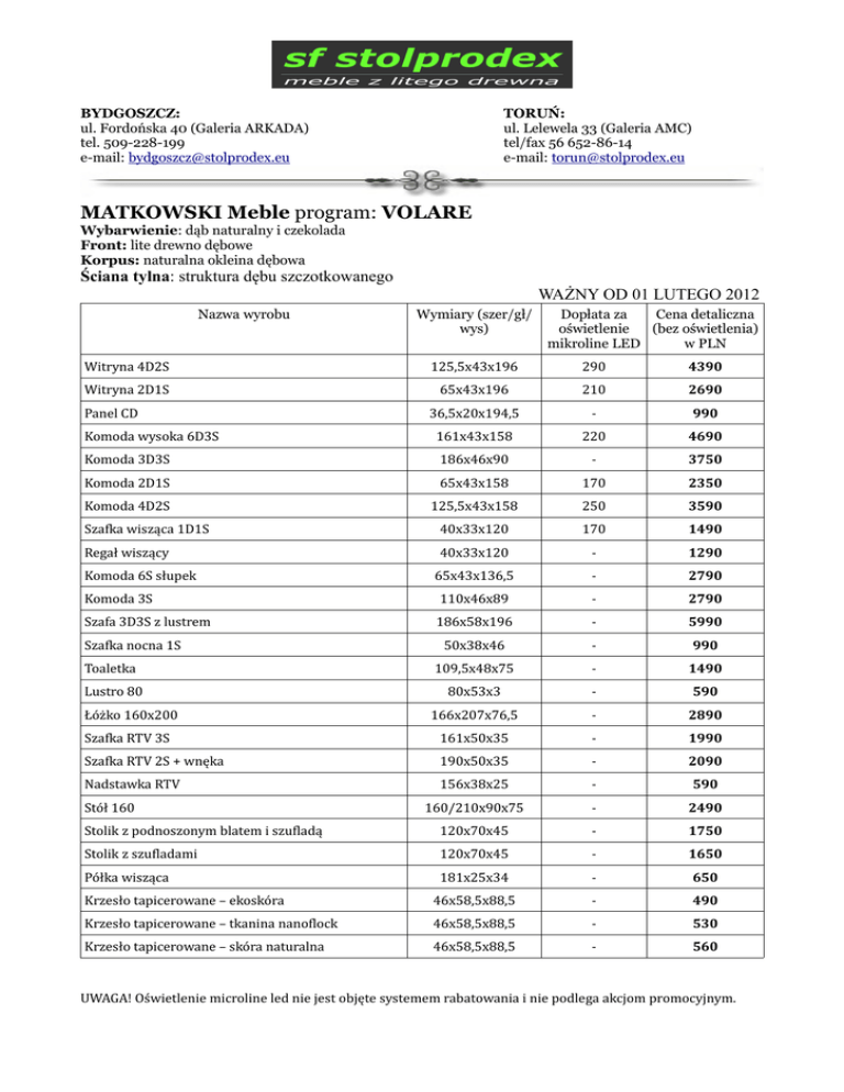 BYDGOSZCZ: ul. Fordońska 40 (Galeria ARKADA) tel. 509-228-199 e-mail: [email protected] TORUŃ: ul. Lelewela 33 (Galeria AMC) tel/fax 56 652-86-14 e-mail: [email protected] MATKOWSKI Meble program: VOLARE Wybarwienie: dąb naturalny i czekolada Front: lite drewno dębowe Korpus: naturalna okleina dębowa Ściana tylna: struktura dębu szczotkowanego WAŻNY OD 01 LUTEGO 2012 Nazwa wyrobu Wymiary (szer/gł/ wys) Dopłata za Cena detaliczna oświetlenie (bez oświetlenia) mikroline LED w PLN Witryna 4D2S 125,5x43x196 290 4390 Witryna 2D1S 65x43x196 210 2690 36,5x20x194,5 - 990 Komoda wysoka 6D3S 161x43x158 220 4690 Komoda 3D3S 186x46x90 - 3750 Komoda 2D1S 65x43x158 170 2350 Komoda 4D2S 125,5x43x158 250 3590 Szafka wisząca 1D1S 40x33x120 170 1490 Regał wiszący 40x33x120 - 1290 65x43x136,5 - 2790 Komoda 3S 110x46x89 - 2790 Szafa 3D3S z lustrem 186x58x196 - 5990 50x38x46 - 990 Toaletka 109,5x48x75 - 1490 Lustro 80 80x53x3 - 590 Łóżko 160x200 166x207x76,5 - 2890 Szafka RTV 3S 161x50x35 - 1990 Szafka RTV 2S + wnęka 190x50x35 - 2090 Nadstawka RTV 156x38x25 - 590 160/210x90x75 - 2490 Stolik z podnoszonym blatem i szufladą 120x70x45 - 1750 Stolik z szufladami 120x70x45 - 1650 Półka wisząca 181x25x34 - 650 Krzesło tapicerowane – ekoskóra 46x58,5x88,5 - 490 Krzesło tapicerowane – tkanina nanoflock 46x58,5x88,5 - 530 Krzesło tapicerowane – skóra naturalna 46x58,5x88,5 - 560 Panel CD Komoda 6S słupek Szafka nocna 1S Stół 160 UWAGA! Oświetlenie microline led nie jest objęte systemem rabatowania i nie podlega akcjom promocyjnym.