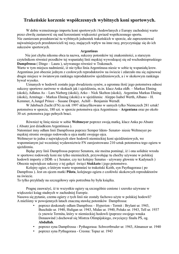 Trakeńskie korzenie współczesnych wybitnych koni sportowych. W dobie wzmożonego importu koni sportowych i hodowlanych z Europy zachodniej warto przez chwilę zastanowić się nad korzeniami większości gwiazd współczesnego sportu. Nie zamierzam przedstawiać tu wybitnych jednostek trakeńskich w sporcie, ale zaprezentować najważniejszych przedstawicieli tej rasy, mających wpływ na inne rasy, przyczyniając się do ich sukcesów sportowych. Argentinus Nie jest chyba nikomu obca ta nazwa, sukcesy potomków tej znakomitości, a starszym czytelnikom również przodków tej wspaniałej linii męskiej wywodzącej się od wschodniopruskiego Dampfrossa ( Dingo – Laura ), używanego również w Trakenach. Warto w tym miejscu nadmienić, iż nie tylko linia Argentinusa niesie w sobie tę wspaniałą krew. Argentinus jest obecnie jednym z czołowych reproduktorów na świecie i zdarzało mu się zajmować drugie miejsce w światowym rankingu reproduktorów ujeżdżeniowych, a i w skokowym rankingu bywał wysoko. Uznanych w hodowli zostało jego dwudziestu synów, a ogromna ilość jego potomstwa odnosi sukcesy sportowe zarówno w skokach jak i ujeżdżeniu, m.in. klacz Anka oldb. – Markus Ehning (skoki), Adlatus As – Lars Nieberg (skoki), Arko – Nick Skelton (skoki), Argentina Markus Ehning (skoki), Armitage – Markus Ehning (skoki) a w ujeżdżeniu: Aleppo Isabel Werth, Albano – H. Kemmer, A.Jungel Prince – Susane Draper, Achill – Benjamin Werndl. W Jahrbuch Zucht (FN) za rok 1997 sklasyfikowano w samych tylko Niemczech 281 sztuk! potomstwa w sporcie, 180 szt. w sporcie potomstwa ojca Argentinusa – Argentana oraz po około 30 szt. potomstwa jego pełnych braci. Również tę linię niesie w sobie Weltmeyer poprzez swoją matkę, klacz Anka po Absatz ( Absatz jest dziadkiem Argentinusa ). Natomiast inny odłam linii Dampfrossa poprzez Semper Idem- Senator- niesie Weltmeyer po męskiej stronie swojego rodowodu u ojca matki swojego ojca. Weltmeyer to jedna z największych sław hodowli niemieckiej koni ujeżdżeniowych, we wspomnianym już wcześniej wydawnictwie FN zarejestrowano 210 sztuk potomstwa tego ogiera w ujeżdżeniu. Będąc przy linii Dampfrossa poprzez Senatora, nie można pominąć, iż i ona solidnie wrosła w sportowe rodowody koni nie tylko niemieckich, przywołując tu choćby używane w polskiej hodowli importy z DDR- u ( Senator, czy tez kolejny Senatus - używany głownie w Kadynach ) Obecnie największe sukcesy z tej gałęzi święci Stakkato i jego potomstwo. Kolejny ogier, o którym warto wspomnieć to trakeński Keith, syn Paythagorasa ( po Dampfross ). Jest on ojcem matki Pilota, kolejnego ogiera z czołówki skokowych reproduktorów na świecie. To tylko przykłady na szczegółowy opis potrzebna by była książka. Pragnę zauważyć, iż te wszystkie ogiery są szczególnie cenione i szeroko używane w większości ksiąg stadnych w zachodniej Europie. Nasuwa się pytanie, czemu ogiery z tych linii nie zostały fachowo użyte w polskiej hodowli? A mieliśmy w powojennych latach znaczną stawkę potomków Dampfrossa: • poprzez doskonały odłam Dampfross – Hyperion - Termit : Brylant ur. 1943, Buschido ur. 1940, Huligan ur. 1943, Midas ur. 1940, Poluks ur. 1943, Tell ur. 1937 (s ynowie Termita, który w niemieckiej hodowli (poprzez swojego wnuka Donauwind ) dochował się Mistrza Olimpijskiego, zwycięzcy finału PŚ, og. Abdullah. • poprzez syna Dampfrossa - Pythagorasa: Schwertbruder ur. 1943, Almansor ur. 1940 • poprzez syna Pythagorasa - Creona: Topaz ur. 1943 • • • • • • • poprzez syna Hyperiona - Sonnentau: Sozius ur. 1939 poprzez syna Pythagoras - Pygmaliona: Pyrmonter ur. 1940 poprzez syna Dampfrossa - Semper Idem: Moskit ur. 1943 poprzez syna Dampfrossa - Neumond: Neidhardt ur. 1939 poprzez syna Dampfrossa - Hyperiona: Dietmar ur. 1942, Pyrrhus ur. 1939 poprzez syna Dampfrossa - Cellist: Caramel ur. 1941 poprzez syna Dampfrossa - Hexenschuss: Abschuss brdbg ur. 1949 Ciekawe czemu chociażby Semper Idem w bardzo wielu przypadkach sprawdził się w Niemczech i dał wiele cennego potomstwa zarówno żeńskiego jak i męskiego, natomiast w Polsce zostało tylko kilka matek po tych ogierach...