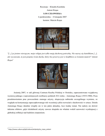 Recenzja – Klaudia Kasińska Antoni Rząsa LOS CZŁOWIEKA 6 października – 4 listopada 2007 kurator: Marcin Rząsa "[...] ja jestem wierzącym, moja religia jest tylko moją duchową potrzebą. Nie nazwę się katolikiem [...], ale wyczuwam, że jest potężny świat ducha, który bez przerwy jest w konflikcie ze światem materii" Antoni Rząsa1 Jesienią 2007, w sali głównej Centrum Rzeźby Polskiej w Orońsku, zaprezentowano wyjątkową wystawę jednego z najważniejszych rzeźbiarzy polskich XX wieku - Antoniego Rząsy (1919-1980). Poza przedstawieniem prac powszechnie znanego artysty, ekspozycja nabierała szczególnego wymiaru, ze względu na kontynuację zapoczątkowanego rok wcześniej cyklu rozważań o duchowości w sztuce. Dzieła Antoniego Rząsy idealnie wtopiły sie w ten jakże aktualny, lecz trudny temat. Nie należy sie dziwić takiemu efektow, gdyż działalność artysty zawsze skupiała sie właśnie wokół surowości wynikajacej z głebokiej reflekcji nad ludzkim cierpieniem. 1 http://www.culture.pl/pl/culture/artykuly/os_rzasa_antoni Na wystawie ukazano przedstawienia Chrystusa ukrzyżowanego, jak również krzyże, począwszy od pierwszych, powstałych w czasie choroby ukochanego nauczyciela i mistrza Antoniego Kenara, przez kolejne cykle: Los Człowieka, cykl II i IV, cykl Oświęcim, po nieukończone kompozycje ukryte dotychczas w magazynach zakopiańskiej galerii. Ekspozycję uzupełniają Macierzyństwa i Piety, poruszające problematykę narodzin i śmierci. Wierny swej filozofii i powołaniu, jakim była jego praca, Rząsa nadawał drewnu kształty niesamowite, przeszywające dosłownością, tragizmem, a niekiedy i kontrowersją. Silny związek z przyrodą i religia, to chechy widoczne na pierwszy rzut oka. Dodajmy do tego analizę losu człowieka, jego miejsca w kosmosie, sensu istnienia i otrzymamy obraz tworczości artysty. Oglądajac te zdecydowanie niebanbalne rzeźby, umiejscowione jakby w świątyni, miejscu zadumy, powodują odczucie wzruszenia wyjątkowo osobistym spotkaniem z twórczością, pomieszanym z psychodelicznym wrażeniem osaczenia ukrzyżowanymi Chrystusami. Za pomocą prostych środów wyrazu, jakimi sa piony, poziony, frontalność i umowność figur, Rząsa osiagał niebywałą siłę ekspresji. Uderzający autentyzm cierpienia najbardziej odczuwalny jest w pracach z cyklu zainspirowanego okropnościami wojny, Oświęcim, gdzie artysta wyrzeźbił matkę z niemowlęciem w drodze do krematorium. Duchowe przeżycia w świecie ponoć pozbawionym duchowości były tym bardziej intensywne, gdyż doświadczyłam ich dzięki artyście, który przełamał tradycyjną kościelną ikonografię. Ponadto dzieła zostały zaprezentowane w miejscu szczególnym ze względów historycznych, kulturowych i artystycznych. Centrum Rzeźby Polskiej w Orońsku stało się na moment powiernikiem najskrytszych pragnień i lęków człowieka, dotyczących jego małości i wielkości, tragizmu i ciągłego dążenia do szczęścia. By jednak w pelni docenic istotę wystawy najlepiej sięgnąc po slowa samego artysty: "Bynajmniej, gdy robię Chrystusa czy Piety - nie robię z myślą, żeby się do nich modlić, tylko snuję opowieść o ludziach. Ja nie uważam, że moja sztuka jest jakaś tragiczna, pełna jakiejś rezygnacji. Ja się solidaryzuję z ludźmi i staram się bronić tego człowieka. Przed czym? Sam nie wiem, ale przed czymś się broni, bo odczuwam to.” Antoni Rząsa2 2 http://www.muzeum-polskie.org/kalendarium/archiwum_calend/2005/info_rzasa_pl.htm