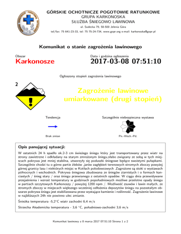 GÓRSKIE OCHOTNICZE POGOTOWIE RATUNKOWE GRUPA KARKONOSKA SŁUŻBA ŚNIEGOWO LAWINOWA ul. Sudecka 79, 58-500 Jelenia Góra tel/fax: 75 641-23-33, tel: 75 75-24-734, www.gopr.org e-mail: [email protected] Komunikat o stanie zagrożenia lawinowego Obszar Data i godzina ogłoszenia Karkonosze 2017-03-08 07:51:10 Ogłoszony stopień zagrożenia lawinowego Zagrożenie lawinowe umiarkowane (drugi stopień) Tendencja Szczególnie niebezpieczna wystawa Brak zmian Pn.-Wsch.-Pd. Opis panującej sytuacji: W ostatnich 24 h spadło ok.2-3 cm świeżego śniegu który jest transportowany przez wiatr na strony zawietrzne i odkładany na starym zmrożonym śniegu,słabo związany ze sobą w tych miejscach pokrywa jest mniej stabilna, utworzyły się poduszki śniegowe będące swoistymi pułapkami. Szczególnie chodzi tu o górne partie żlebów ,jarów zagłębień terenowych stromych zboczy powyżej górnej granicy lasu i niektórych miejsc w Kotłach polodowcowych .Zagrożone są stoki o wystawach północnych i wschodnich. Pokrywa śniegowa zbudowana ze śniegów ziarnistych i o formach kanciastych / śnieg stary / oraz śniegu przewianego z ostatnich opadów. W ciągu dnia przewidywane przejaśnienia i wzrost temperatury w godzinach popołudniowych możliwe przelotne opady śniegu w partiach szczytowych Karkonoszy / powyżej 1200 npm /. Możliwość zsuwów i lawin małych, ze stromych zboczy w miejscach większego wcześniej odłożenia depozytów śniegu na pozostałym obszarze pokrywa śniegu jest stabilizowana przez wystające kamienie i roślinność. Zagrożenie lawinowe w najbliższych 24h nie powinno ulec zmianie. Śnieżka temperatura -5,2◦ C wiatr zachodni 6,4 m/s Strzecha Akademicka temperatura - 3,6 ◦ C, południowo-zachodni 3,6 m/s Komunikat lawinowy z 8 marca 2017 07:51:10 Strona 1 z 2 Wszelkie informacje na temat organizacji i zmian na szlakach turystycznych znajdą Państwo na stronie Karkonoskiego Parku Narodowego. Opis ogłoszonego stopnia według skali: Stabilność pokrywy śnieżnej: Pokrywa śnieżna jest umiarkowanie związana na niektórych stromych stokach na ogół jednak jest związana dobrze. Prawdopodobieństwo wyzwolenia (zejścia) lawiny: Wyzwolenie lawiny jest możliwe zwłaszcza przy dużym obciążeniu dodatkowym przede wszystkim na wskazanych stromych stokach. Nie należy spodziewać się samorzutnego schodzenia dużych lawin. Zalecenia dla ruchu osób: Częściowo niekorzystne warunki. Poruszanie się wymaga umiejętności oceny lokalnego zagrożenia lawinowego i odpowiedniego wyboru trasy szczególnie na wszystkich stromych stokach1, oraz na stokach średnio stromych1 szczególnie wskazanych pod względem wystawy i wysokości. Osoba odpowiedzialna Grupa odpowiedzialna Brzeziński Andrzej Grupa Karkonoska Komunikat lawinowy z 8 marca 2017 07:51:10 Strona 2 z 2 .