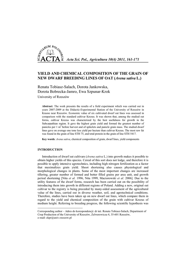 Acta Sci. Pol., Agricultura 10(4) 2011, 161-171 YIELD AND CHEMICAL COMPOSITION OF THE GRAIN OF NEW DWARF BREEDING LINES OF OAT (Avena sativa L.) Renata Tobiasz-Salach, Dorota Jankowska, Dorota Bobrecka-Jamro, Ewa Szpunar-Krok University of Rzeszów1 Abstract. The work presents the results of a field experiment which was carried out in years 2007-2009 at the Didactic-Experimental Station of the University of Rzeszów in Krasne near Rzeszów. Economic value of six cultivated dwarf oat lines was assessed in comparison with the standard cultivar Krezus. It was shown that, among the studied oat forms, cultivar Krezus was characterized by the best usefulness for growth in the Subcarpathian region. It gave the highest grain yield and formed the greatest number of panicles per 1 m2 before harvest and of spikelets and panicle grain mass. The studied dwarf lines gave on average one tone less yield per hectare than cultivar Krezus. The most raw fat was found in the grain of line STH 75, and total protein in the grain of line STH 5417. Key words: Avena sativa, chemical composition of grain, dwarf lines, yield components INTRODUCTION Introduction of dwarf oat cultivars (Avena sativa L.) into growth makes it possible to obtain higher yields of this species. Cereal of this sort does not lodge, and therefore it is possible to apply intensive agrotechnics, including high nitrogen fertilization as a factor that maximalizes grain yield. Shoot shortening also causes physiological and morphological changes in plants. Some of the most important changes are increased tillering, greater number of formed and better filled grains per area unit, and growth period shortening [Nita et al. 1996, Nita 1999, Maciorowski et al. 2006]. Due to the utility features of the dwarf forms, research has been carried out on the possibility of introducing them into growth in different regions of Poland. Adding a new, original oat cultivar to the registry is being preceded by many-sided assessment of the agricultural value of the lines, carried out in diverse weather, soil, and agrotechnical conditions. Therefore, studies have been taken up on new dwarf oat lines, which compare them in regard to the yield and chemical composition of the grain with cultivar Krezus of medium height. Referring to breeding progress, the following scientific hypothesis was Corresponding author – Adres do korespondencji: dr inż. Renata Tobiasz-Salach, Department of Crop Production of the University of Rzeszów, Zelwerowicza 4, 35-601 Rzeszów, e-mail: [email protected] 162 R. Tobiasz-Salach, D. Jankowska, D. Bobrecka-Jamro, E. Szpunar-Krok assumed: grain yield, components of yield structure, and the chemical composition of dwarf oat lines are at least similar or more favourable than the registered in 2005 cultivar Krezus. The studies were carried out in the Subcarpathian region, where the economic significance of oat is greater than in other regions of the country. The aim of the study was the assessment of economic value of dwarf cultivated oat lines grown in the conditions of the Subcarpathian region. MATERIAL AND METHODS Field experiment was carried out in years 2007-2009 at the Didactic-Experimental Station in Krasne near Rzeszów (50o03’ N; 22o06’ E). The subject of the study was six dwarf oat lines (STH 71, STH 6106, STH 6108, STH 75, STH 5417, and STH 7105), which were compared with cultivar Krezus of average height. This cultivar is one that gives some of the highest yields in that region of Poland [Kozioł 2007]. Sowing material originated from the Plant Breeding Station Strzelce Ltd. Plant Breeding and Acclimatization Institute Group. One-factor experiment was set up as a random block design in three repetitions on brown soil, with the mechanical composition of sandy silt and pH = 5.3. Soil was characterized by low magnesium content (3.8 mg per 100 g of soil) and average phosphorus (4.996 mg P per 100 g of soil) and potassium (14.53 mg K per 100 g of soil) content. Plot area for harvest was equal to 10 m2, and planned plant density was 550 plants·m-2. Forecrop in years 2007 and 2008 was triticale, and in 2009 winter rapeseed. Oat in the subsequent research years was sown on the following dates: April 2nd, 2007, April 10th, 2008 and April 4th, 2009. Nitrogen fertilization was applied in two doses of 40 kg·ha-1 pre-sowing and top-dressing at the stage of full tillering. Phosphorus and potassium fertilization in the amount of 35 kg·ha-1 P and 85 kg·ha-1 K in the form of 46% granulate superphosphate and 60% potassium salt was applied pre-sowing. Oat tending consisted of the application of spray Chwastox Turbo in the amount of 2 dm3·ha-1 at the tillering stage. During growth, observations of the developmental stages of the plants were also carried out. Before harvest, 10 plants from every plot were collected in order to carry out morphological measurements and measure the composition elements of the yield, morphological and composition yield elements. The following traits were analyzed: blade height, panicle length, number and mass of panicle grain, mass of 1000 grains, and grain yield. Also panicle density per 1 m2 was calculated before harvest. Grain harvest was conducted with the use of plot combine Seedmaster Universal on the following dates: August 7th, 2007, August 10th, 2008, and August 12th, 2009. Grain yield and mass of 1000 grains were presented in calculation per 15% humidity. Chemical composition of grain was established with near infrared reflection spectroscopy using a device made by Bruker. Soil analysis was carried out at the Regional Chemical-Agricultural Station in Rzeszów according to the current methods. Meteorological data was processed on the basis of the records by the Meteorological Station in Jasionka. Results of the experiment were statistically evaluated with the use of the following methods: 1) analysis of variance test or the Kruskal-Wallis test as its non-parametric equivalent in order to compare the mean v