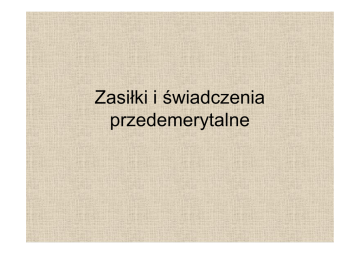 Zasiłki i świadczenia przedemerytalne Różnica uregulowania • świadczenia przedemerytalne – uregulowane są w ustawie o św przedemerytalnych; • zasiłki przedemerytalne – uregulowane są w ustawie z dnia 14 grudnia 1994 r. o zatrudnieniu i przeciwdziałaniu bezrobociu Zakres podmiotowy św. przedemeryt. (1) Przysługuje osobie która: • ukończyła co najmniej 56 lat (k) oraz 61 lat (m); • posiada okres uprawniający do emerytury, wynoszący co najmniej 20 lat dla kobiet i 25 lat dla mężczyzn • do dnia rozwiązania stosunku pracy lub stosunku służbowego z powodu likwidacji pracodawcy lub niewypłacalności pracodawcy • była zatrudniona lub pozostawała w stosunku służbowym przez okres nie krótszy niż 6 miesięcy (2) Przysługuje osobie która: • ukończyła co najmniej 55 lat - kobieta oraz 60 lat mężczyzna; • okres uprawniający do emerytury, wynoszący co najmniej 30 lat dla kobiet i 35 lat dla mężczyzn; • stosunek pracy lub stosunek służbowy został rozwiązany z przyczyn dotyczących zakładu pracy; (3) Przysługuje osobie która: • ukończyła co najmniej 56 lat - kobieta i 61 lat – mężczyzna; • posiada okres uprawniający do emerytury, wynoszący co najmniej 20 lat dla kobiet i 25 lat dla mężczyzn • do dnia ogłoszenia upadłości prowadziła nieprzerwanie i przez okres nie krótszy niż 24 miesiące pozarolniczą działalność (4) Przysługuje osobie która: • ukończyła co najmniej 55 lat - kobieta oraz 60 lat - mężczyzna • osiągnęła okres uprawniający do emerytury, wynoszący co najmniej 20 lat dla kobiet i 25 lat dla mężczyzn • zarejestrowała się we właściwym powiatowym urzędzie pracy w ciągu 30 dni od dnia ustania prawa do renty z tytułu niezdolności do pracy, pobieranej nieprzerwanie przez okres co najmniej 5 lat, i do dnia, w którym ustało prawo do renty (5) Przysługuje osobie która: • posiada okres uprawniający do emerytury, wynoszący co najmniej 35 lat dla kobiet i 40 lat dla mężczyzn; • stosunek pracy został rozwiązany z przyczyn dotyczących zakładu pracy; • przed rozwiązaniem stosunku pracy osoba ta była zatrudniona w tym zakładzie przez okres nie krótszy niż 6 miesięcy; (6) Przysługuje osobie która: • do dnia 31 grudnia roku poprzedzającego rozwiązanie stosunku pracy lub stosunku służbowego, z powodu likwidacji pracodawcy lub niewypłacalności pracodawcy • była zatrudniona lub pozostawała w stosunku służbowym przez okres nie krótszy niż 6 miesięcy • posiada okres uprawniający do emerytury wynoszący co najmniej 34 lata dla kobiet i 39 lat dla mężczyzn (7) Przysługuje osobie która: • pracownikom zatrudnionym przy azbeście (w rozumieniu ustawy o zakazie stosowania wyrobów zawierających azbest) • posiadają okres uprawniający do emerytury wynoszący co najmniej 20 lat dla kobiet i 25 lat dla mężczyzn • w tym co najmniej 10 lat były zatrudnione w pełnym wymiarze czasu pracy w zakładach produkujących azbest • i są uprawnione do prawa do zasiłku dla bezrobotnych; Dodatkowe warunki (łącznie) • pobieranie przez co najmniej 6 miesięcy pobierania zasiłku dla bezrobotnych i: – nadal jest zarejestrowana jako bezrobotna; – w okresie pobierania zasiłku dla bezrobotnych nie odmówiła bez uzasadnionej przyczyny przyjęcia propozycji odpowiedniego zatrudnienia lub innej pracy zarobkowej, w rozumieniu ustawy o promocji zatrudnienia, albo zatrudnienia w ramach prac interwencyjnych lub robót publicznych; – złoży wniosek o przyznanie świadczenia przedemerytalnego w terminie nieprzekraczającym 30 dni od dnia wydania przez powiatowy urząd pracy dokumentu poświadczającego 6-miesięczny okres pobierania zasiłku dla bezrobotnych. (termin można przywrócić) Wysokość świadczenia jest co do zasady jednolita dla wszystkich • jest co do zasady jednolita dla wszystkich – 711, 54 gr. • wyjątek: – w przypadku rencisty pobierającego świadczenie z tytułu niezdolność do pracy nie może być wyższa niż wysokość tej renty SUBS Ustanie prawa do świadczenia 1) na wniosek osoby pobierającej świadczenie przedemerytalne; 2) w dniu poprzedzającym dzień nabycia prawa do emerytury, która jest ustalona decyzją Zakładu Ubezpieczeń Społecznych, lub innego organu emerytalno-rentowego określonego w odrębnych przepisach; 3) z dniem osiągnięcia wieku 60 lat przez kobietę i 65 lat przez mężczyznę; 4) z dniem nabycia prawa własności lub objęcia w posiadanie (samoistne lub zależne) nieruchomości rolnej o powierzchni użytków rolnych przekraczających 2 ha przeliczeniowe albo współwłasności nieruchomości rolnej, jeżeli udział przekracza 2 ha przeliczeniowe; 5) wraz ze śmiercią osoby uprawnionej. SUBS Zawieszenie prawa do świadczenia • • • • • z dniem nabycia prawa do renty z tytułu niezdolności do pracy, podjęcia wypłaty renty strukturalnej lub świadczenia o charakterze rentowym z instytucji zagranicznej. • wyjątek: Świadczenie a zarobkowanie • zmniejszenie: – jeżeli łączna kwota świadczenia przedemerytalnego i przychodu przekracza miesięcznie kwotę 50 % przeciętnego miesięcznego wynagrodzenia (1190,20 zł) – nie więcej jednak niż 70% przeciętnego miesięcznego wynagrodzenia (1666,20 zł). • Świadczenie przedemerytalne jest pomniejszone o kwotę przekroczenia pomniejszoną o obowiązkowe składki na ubezpieczenia społeczne należne od ubezpieczonego, ustalone od kwoty tego przekroczenia • świadczenia nie można jednak obniżyć poniżej 335 zł. • pow. 70% świadczenie ulega zawieszeniu. • dopuszczalna roczna kwota przychodu 14282,40 zł • graniczna roczna kwota przychodu 19994,40 zł • rozliczenie przychodu następuje w formie rozliczenia rocznego • 2. W celu ustalenia, czy zaistniały okoliczności powodujące zmniejszenie lub zawieszenie świadczenia przedemerytalnego, organ rentowy porównuje: 1) łączną kwotę świadczenia przedemerytalnego i pr
