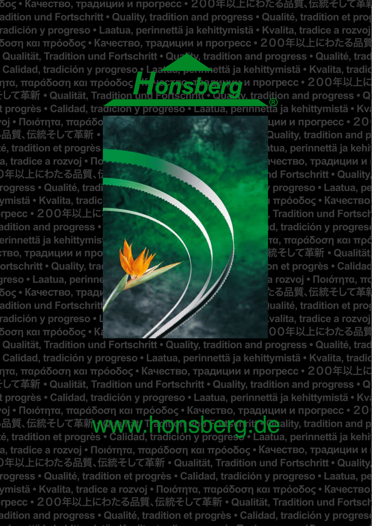 伝統そして革新 δος • Качество, традиции и прогресс • 200年以上にわたる品質、 adition und Fortschritt • Quality, tradition and progress • Qualité, tradition et prog radición y progreso • Laatua, perinnettä ja kehittymistä • Kvalita, tradice a rozvoj δοση και πρόοδος • Качество, традиции и прогресс • 200年以上にわたる品質 Qualität, Tradition und Fortschritt • Quality, tradition and progress • Qualité, trad • Calidad, tradición y progreso • Laatua, perinnettä ja kehittymistä • Kvalita, tradic ητα, παράδοση και πρόοδος • Качество, традиции и прогресс • 200年以上に そして革新 • Qualität, Tradition und Fortschritt • Quality, tradition and progress • Qu t progrès • Calidad, tradición y progreso • Laatua, perinnettä ja kehittymistä • Kva voj • Ποιότητα, παράδοση και πρόοδος • Качество, традиции и прогресс • 200 る品質、 伝統そして革新 • Qualität, Tradition und Fortschritt • Quality, tradition and pr té, tradition et progrès • Calidad, tradición y progreso • Laatua, perinnettä ja kehit a, tradice a rozvoj • Ποιότητα, παράδοση και πρόοδος • Качество, традиции и п 0年以上にわたる品質、 伝統そして革新 • Qualität, Tradition und Fortschritt • Quality, rogress • Qualité, tradition et progrès • Calidad, tradición y progreso • Laatua, pe ymistä • Kvalita, tradice a rozvoj • Ποιότητα, παράδοση και πρόοδος • Качество, огресс • 200年以上にわたる品質、 伝統そして革新 • Qualität, Tradition und Fortsch adition and progress • Qualité, tradition et progrès • Calidad, tradición y progreso erinnettä ja kehittymistä • Kvalita, tradice a rozvoj • Ποιότητα, παράδοση και πρό ство, традиции и прогресс • 200年以上にわたる品質、 伝統そして革新 • Qualität, Fortschritt • Quality, tradition and progress • Qualité, tradition et progrès • Calidad greso • Laatua, perinnettä ja kehittymistä • Kvalita, tradice a rozvoj • Ποιότητα, πα 伝統そして革新 δος • Качество, традиции и прогресс • 200年以上にわたる品質、 adition und Fortschritt • Quality, tradition and progress • Qualité, tradition et prog radición y progreso • Laatua, perinnettä ja kehittymistä • Kvalita, tradice a rozvoj δοση και πρόοδος • Качество, традиции и прогресс • 200年以上にわたる品質 Qualität, Tradition und Fortschritt • Quality, tradition and progress • Qualité, trad • Calidad, tradición y progreso • Laatua, perinnettä ja kehittymistä • Kvalita, tradic ητα, παράδοση και πρόοδος • Качество, традиции и прогресс • 200年以上に そして革新 • Qualität, Tradition und Fortschritt • Quality, tradition and progress • Qu t progrès • Calidad, tradición y progreso • Laatua, perinnettä ja kehittymistä • Kva voj • Ποιότητα, παράδοση και πρόοδος • Качество, традиции и прогресс • 200 る品質、 伝統そして革新 • Qualität, Tradition und Fortschritt • Quality, tradition and pr té, tradition et progrès • Calidad, tradición y progreso • Laatua, perinnettä ja kehit a, tradice a rozvoj • Ποιότητα, παράδοση και πρόοδος • Качество, традиции и п 0年以上にわたる品質、 伝統そして革新 • Qualität, Tradition und Fortschritt • Quality, rogress • Qualité, tradition et progrès • Calidad, tradición y progreso • Laatua, pe ymistä • Kvalita, tradice a rozvoj • Ποιότητα, παράδοση και πρόοδος • Качество, огресс • 200年以上にわたる品質、 伝統そして革新 • Qualität, Tradition und Fortsch adition and progress • Qualité, tradition et progrès • Calidad, tradición y progreso Jakość, tradycja i postęp od ponad 200 lat Jakość, tradycja i postęp są w firmie Honsberg nierozdzielnie ze sobą powiązane. Już w roku 1798 Honsberg rozpoczął produkcję brzeszczotów pił do obróbki drewna i metalu w Remscheid, głównym ośrodku niemieckiego przemysłu narzędziowego. W roku 1932 wraz z wytwarzaniem precyzyjnych narzędzi i urządzeń dla przemysłu ciężkiego doszła dalsza gałąź produkcji, w której w latach 40 rozwinęło się opracowanie i konstrukcja nowoczesnych obrabiarek i budowa kompleksowych linii produkcyjnych (automatycznych linii obróbczych z przymusowym taktem produkcyjnym) szczególnie dla przemysłu samochodowego. Po dywersyfikacji głównych dziedzin działalności, od roku 1987 firma Honsberg Metallsägen GmbH istnieje dzisiaj jako samodzielne przedsiębiorstwo, które poświęca się wyłącznie rozwojowi, produkcji i dystrybucji pił metalowych. Dopasowaliśmy się do zmienionych wymagań Klientów i stale rozwijamy nasz program produkcji, szczególnie w zakresie wytwarzania brzeszczotów pił taśmowych bimetalicznych. Precyzja jest dla nas tak samo oczywista jak dla naszych Klientów, którzy dzisiaj na całym świecie mają zaufanie do naszego niezmiennie wysokiego standardu jakości. Aby o tym standardzie jakości nie tylko pisać z okazji jubileuszów, lecz także dynamicznie dalej go rozwijać mamy certyfikaty według DIN EN ISO 9001: 2000, po to, by również w przyszłości móc oferować naszym Klientom indywidualne rozwiązania problemów poprzez optymalne dostrojenie wszystkich zakresów działalności przedsiębiorstwa. W świetle tego firma Honsberg jest dzisiaj jednym z wiodących oferentów brzeszczotów pił ta