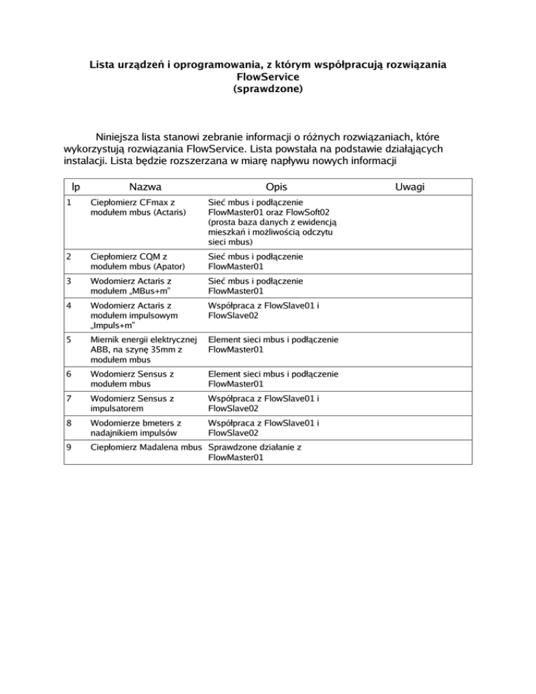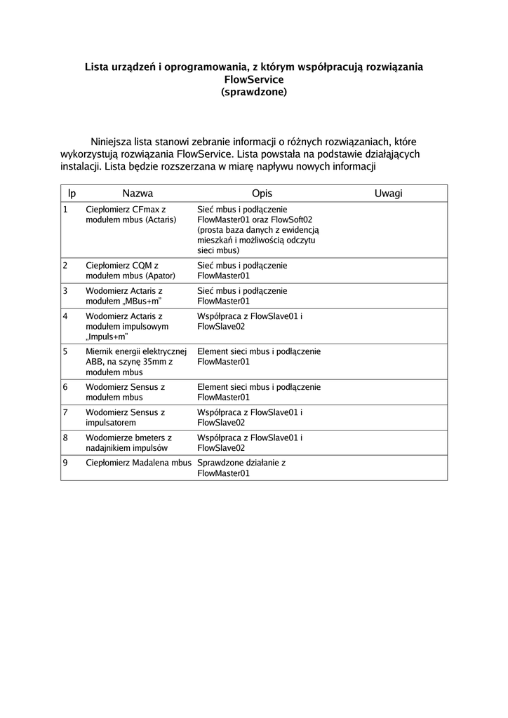Lista urządzeń i oprogramowania, z którym współpracują rozwiązania FlowService (sprawdzone) Niniejsza lista stanowi zebranie informacji o różnych rozwiązaniach, które wykorzystują rozwiązania FlowService. Lista powstała na podstawie działąjących instalacji. Lista będzie rozszerzana w miarę napływu nowych informacji lp Nazwa Opis 1 Ciepłomierz CFmax z modułem mbus (Actaris) Sieć mbus i podłączenie FlowMaster01 oraz FlowSoft02 (prosta baza danych z ewidencją mieszkań i możliwością odczytu sieci mbus) 2 Ciepłomierz CQM z modułem mbus (Apator) Sieć mbus i podłączenie FlowMaster01 3 Wodomierz Actaris z modułem „MBus+m” Sieć mbus i podłączenie FlowMaster01 4 Wodomierz Actaris z modułem impulsowym „Impuls+m” Współpraca z FlowSlave01 i FlowSlave02 5 Miernik energii elektrycznej ABB, na szynę 35mm z modułem mbus Element sieci mbus i podłączenie FlowMaster01 6 Wodomierz Sensus z modułem mbus Element sieci mbus i podłączenie FlowMaster01 7 Wodomierz Sensus z impulsatorem Współpraca z FlowSlave01 i FlowSlave02 8 Wodomierze bmeters z nadajnikiem impulsów Współpraca z FlowSlave01 i FlowSlave02 9 Ciepłomierz Madalena mbus Sprawdzone działanie z FlowMaster01 Uwagi