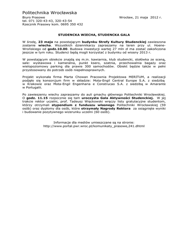 Politechnika Wrocławska Biuro Prasowe tel. 071 320-43-43, 320-43-54 Rzecznik Prasowy kom. 0695 350 432 Wrocław, 21 maja 2012 r. STUDENCKA WIECHA, STUDENCKA GALA W środę, 23 maja na powstającym budynku Strefy Kultury Studenckiej zawieszona zostanie wiecha. Wszystkich dziennikarzy zapraszamy na teren przy ul. HoeneWrońskiego od godz.10.00. Budowa inwestycji wartej 27 mln zł ma zostać zakończona jeszcze w tym roku. Studenci będą mogli korzystać z budynku od wiosny 2013 r. W powstającym obiekcie znajdą się m.in. kawiarnia, klub studencki, stołówka ze sceną, sale: wystawowa i kameralna, punkt ksero, szatnia, przechowalnia bagaży oraz wielopoziomowy parking dla prawie 300 samochodów. Obiekt będzie także w pełni przystosowany do potrzeb osób niepełnosprawnych. Projekt wykonała firma Marta Chowan Pracownia Projektowa MERITUM, a realizacji podjęło się konsorcjum firm w składzie: Mota-Engil Central Europe S.A. z siedzibą w Krakowie oraz Mota-Engil Engenharia e Construcao S.A. z siedzibą w Amarante w Portugalii. Po zawieszeniu wiechy zapraszamy do auli gmachu głównego Politechniki Wrocławskiej. O godz. 11.15 rozpocznie się tam uroczysta Gala Aktywności Studenckiej. W jej trakcie rektor uczelni, prof. Tadeusz Więckowski wręczy listy gratulacyjne studentom, którzy otrzymali stypendium z funduszu własnego Politechniki Wrocławskiej (59 osób) oraz dyplomy dla osób, które otrzymały Nagrody Rektora za osiągnięte wyniki i budowanie pozytywnego wizerunku uczelni (60 osób). Informacje dla mediów umieszczane są na stronie: http://www.portal.pwr.wroc.pl/komunikaty_prasowe,241.dhtml