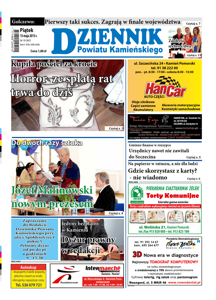 Golczewo: Pierwszy taki sukces. Zagrają w finale województwa Czytaj s. 7 Piątek 15 maja 2015 r. Zdobyła srebro i dwa azy brąz Nr 19 (367) Rok V ISSN 1899-2048 r Cena 1,80 zł Kupiła pościel za krocie Horror ze spłatą rat trwa do dziś czytaj s. 13 ul. Szczecińska 24 • Kamień Pomorski tel. 91 38 222 00 pon. - pt. 8:30 - 17:00 • sobota 8:30 - 13:30 AUTO CZĘŚCI Oleje silnikowe Akcesoria motoryzacyjne Części zamienne Kosmetyki samochodowe Akumulatory W42.4.P.7.03.d/o Czytaj s. 3 Do dwóch razy sztuka W43.2.P.07.03.d/o Gminne finanse w rozsypce Urzędnicy nawet nie zawitali do Szczecina Czytaj s. 5 Na papierze w ratuszu, a nie dla ludzi Gdzie skorzystasz z karty? - nie wiadomo Czytaj s. 6 Józef Malinowski nowym prezesem Zapraszamy do Redakcji Dziennika Powiatu Kamieńskiego przy ulicy Spółdzielczej 1 pokój 5 Pełnimy dyżur od pn do pt w godzinach 9 - 15.30 reklama PIEKARNIA CIASTKARNIA ŻELEK Torty Komunijne www.zelek.com.pl Torty z nadrukiem wykonujemy również na życzenie Klienta Czytaj s. 4 Jedyny bezpłatny w Kamieniu Dyżur prawny w redakcji ul. Wolińska 21, Kamień Pomorski tel./fax 913 820 080 • tel. 913 823 100 tel. 91 392 14 67 kom. 695 264 677 3D Nowa era w diagnostyce Najnowszy TOMOGRAF KOMPUTEROWY reklama Autoskup - skupujemy każde pojazdy, płacimy nawet za wraki, oferujemy najwyższe ceny. Tel. 536 079 721 Szeroka gama wzorów Świeżo. Tanio! ul. Wysockiego 3 • Kamień Pom. ZAPRASZAMY pn.-sob. 7.00 - 21.00, nd. 9.00 - 20.00 na rynku stomatologicznym o zredukowanej o 70% dawce promieniowania i najwyższej rozdzielczości Cyfrowy telertg, rtg zatok oraz pantomogram W.4.P.P.27.03 do 2 Nr 19 (367) Ujęcia z Powiatu We wtorek rozpoczęto wyburzanie budynku po byłym Hotelu Polonia w Kamieniu Pomorskim. W środę proce zostały zakończone. Na chwilę obecną nawet w Urzędzie Miejskim nie ma informacji na temat tego, czy w niedługim czasie właściciel prywatny terenu zamierza podjąć działania zmierzające do zainwestowania w Kamieniu. Jak widać, opłaca się w Kamieniu Pomorskim prowadzić biznes. Najprawdopodobniej tuż po weekendzie w Kamieniu Pomorskim otworzy się kolejna apteka. Będzie to już kolejna na ulicy Mickiewicza, gdyż na vis a vis otwieranej „Apteki Kamieńskiej” prowadzi już działalność apteka Avena. 70. lecie zdobycia Wolina Tradycyjnie, w dniu upamiętniającym zdobycie Wolina, nie zabrakło oficjalnych uroczystości władz miasta. Jednak największy entuzjazm szczególnie młodzieży szkolnej zyskał pokaz sprzętu wojskowego zaprezentowany przez 8. Dywizjon Przeciwlotniczy w Dziwnowie. Tegoroczne obchody 70. rocznicy zdobycia Wolina i jego powrotu do Polski tradycyjnie rozpoczęto przemarszem kombatantów i sybiraków z pocztem sztandarowym Zarządu Powiatowego Związku Kombatantów RP i Byłych Więźniów Politycznych, pocztu sztandarowego Zarządu Miejsko-Gminnego Związku Ochotniczych Straży Pożarnych RP, pocztu sztandarowego PSP w Wolinie, przedstawicieli samorządu gminnego z burmistrzem Wolina Eugeniuszem Jasiewiczem, jego zastępcą oraz sołtysów, dyrektorów i kierowników jednostek podległych Gminy Wolin, przedstawicieli stowarzyszeń i związków. W uroczystości udział wziął również wicemarszałek Województwa Zachodniopomorskiego Jarosław Rzepa, bardzo liczna grupa dzieci i młodzieży naszych szkół pod troskliwą opieką dyrektorów, nauczycieli i opiekunów oraz jak zawsze niezawodni - nasi, wolińscy harcerze. Tą wyjątkową uroczystość uświetnili również żołnierze 8. Dywizjonu Przeciwlotniczego, działającego w ramach 8 Flotylli Obrony Wybrzeża. Uroczystość rozpoczęto odśpiewaniem przez uczestników uroczystości Hymnu Narodowego. Zebrani wspólnie z ks. Kanonikiem Leszkiem Koniecznym pomodlili się za ofiary, a następnie wysłuchali apelu poległych, odczytanego przez prowadzącego uroczystość pana Marka Piotrowskiego, komendanta Gminnego Ochrony Przeciwpożarowej. Część oficjalną zakończono złożeniem przez delegacje kwiatów na Mogile Wo- jennej. Wartę honorową w tym roku pełnili żołnierze 8. Dywizjonu Przeciwlotniczego w Dziwnowie, strażacy OSP Wolin oraz harcerze 3. DH „Wolińskie Gryfy”. Dalsza część uroczystości – „spotkanie pokoleń” – odbyła się w „Dworku Wolińskim”, gdzie wykład historyczny wygłosił pan Czarnecki, nauczyciel historii, reprezentujący Publiczną Szkołę Podstawową w Wolinie. W trakcie wykładu, na parkingu za „Dworkiem Wolińskim”, po raz pierwszy w Wolinie, można było zobaczyć pokazy sprzętu wojskowego prezentowanego przez 8. Dywizjon Przeciwlotniczy w Dziwnowie, co wzbudziło wielkie zainteresowanie wśród młodzieży szkolnej. Inf. UM Wolin/ Red Podopieczni OREW odwiedzili Bibliotekę Bawili się wierszami Tuwima W środę 13 maja, Bibliotekę odwiedzili podopieczni z OREW-u wraz ze swoimi opiekunami. Schody przy wejściu obok Cechu rzemiosł Różnych zostały rozebrane, co nieco odsłoniło wejściu na kamieński rynek. Jednak w dalszym ciągu nie widać tablicy informacyjnej o rynku, która na początku roku zapowiadał Burmistrz Stanisław Kuryłło. Zamiast niej w dalszym ciągu mieszkańcy informowani są tylko o mającej siedzibę 1 100 metrów dalej dyskoncie duńskiej firmy Netto. Zastanawiające jest również to, że siedziba sklepu znajduje się na ul. Moniszki, której to w Kamieniu na pewno nie znajdziemy. Ukazuje się w każdy piątek na terenie powiatu kamieńskiego Adres redakcji: ul. Spółdzielcza 1, pok. nr 5, 72-400 Kamień Pomorski Dyżur w redakcji od pn do pt w godzinach 9-15.30 Przemysław Saja - redaktor naczelny, 501 294 118 Paweł Słomski- redaktor techniczny Wioletta Dziedzic - reklama, 91-39-22-165 Katarzyna Siuda- stażystka Jerzy Salwa - kolportaż e-mail: [email protected]; www.dziennikkamienski.pl Wydawnictwo, skład i druk „Dom Judy” Sp. z o.o., 72-200 Nowogard, ul. Boh. Warszawy 7a. Redakcja nie odpowiada za treść reklam i ogłoszeń, zastrzega sobie 