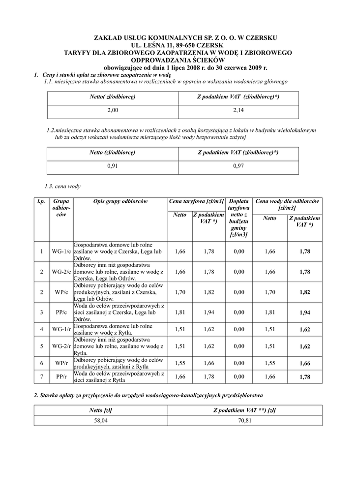ZAKŁAD USŁUG KOMUNALNYCH SP. Z O. O. W CZERSKU UL. LEŚNA 11, 89-650 CZERSK TARYFY DLA ZBIOROWEGO ZAOPATRZENIA W WODĘ I ZBIOROWEGO ODPROWADZANIA ŚCIEKÓW obowiązujące od dnia 1 lipca 2008 r. do 30 czerwca 2009 r. 1. Ceny i stawki opłat za zbiorowe zaopatrzenie w wodę 1.1. miesięczna stawka abonamentowa w rozliczeniach w oparciu o wskazania wodomierza głównego Netto( zł/odbiorcę) Z podatkiem VAT (zł/odbiorcę)*) 2,00 2,14 1.2.miesięczna stawka abonamentowa w rozliczeniach z osobą korzystającą z lokalu w budynku wielolokalowym lub za odczyt wskazań wodomierza mierzącego ilość wody bezpowrotnie zużytej Netto (zł/odbiorcę) Z podatkiem VAT (zł/odbiorcę)*) 0,91 0,97 1.3. cena wody l.p. 1 2 2 3 4 5 6 7 Grupa odbior ców Opis grupy odbiorców Gospodarstwa domowe lub rolne WG-1/c zasilane w wodę z Czerska, Łęga lub Odrów. Odbiorcy inni niż gospodarstwa WG-2/c domowe lub rolne, zasilane w wodę z Czerska, Łęga lub Odrów. Odbiorcy pobierający wodę do celów WP/c produkcyjnych, zasilani z Czerska, Łęga lub Odrów. Woda do celów przeciwpożarowych z PP/c sieci zasilanej z Czerska, Łęga lub Odrów. Gospodarstwa domowe lub rolne WG-1/r zasilane w wodę z Rytla. Odbiorcy inni niż gospodarstwa WG-2/r domowe lub rolne, zasilane w wodę z Rytla. Odbiorcy pobierający wodę do celów WP/r produkcyjnych, zasilani z Rytla Woda do celów przeciwpożarowych z PP/r sieci zasilanej z Rytla Cena taryfowa [zł/m3] Dopłata Cena wody dla odbiorców taryfowa [zł/m3] Netto Z podatkiem netto z Netto Z podatkiem budżetu VAT *) VAT *) gminy [zł/m3] 1,66 1,78 0,00 1,66 1,78 1,66 1,78 0,00 1,66 1,78 1,70 1,82 0,00 1,70 1,82 1,81 1,94 0,00 1,81 1,94 1,51 1,62 0,00 1,51 1,62 1,51 1,62 0,00 1,51 1,62 1,55 1,66 0,00 1,55 1,66 1,66 1,78 0,00 1,66 1,78 2. Stawka opłaty za przyłączenie do urządzeń wodociągowo-kanalizacyjnych przedsiębiorstwa Netto [zł] Z podatkiem VAT **) [zł] 58,04 70,81 3. Ceny za zbiorowe odprowadzanie ścieków L.p. Grupa odbior ców Opis grupy odbiorców Cena taryfowa [zł/m3] Netto Dopłata Cena za taryfowa odprowadzanie netto z ścieków dla odbiorcy budżetu [zł/m3] Z po gminy datkiem [zł/m3] Z VAT*) Netto podatkiem VAT*) 1 Gospodarstwa domowe lub rolne SG-1/c odprowadzające ścieki do oczyszczalni w Czersku, przyłączone bezpośrednio do sieci 5,69 6,09 1,75 3,94 4,22 2 Gospodarstwa domowe lub rolne odprowadzające ścieki do oczyszczalni w Czersku, przyłączone do sieci kanalizacyjnej za SG-2/c pośrednictwem przepompowni lokalnych, ponoszące we własnym zakresie koszty energii elektrycznej zużywanej przez te przepompownie 5,69 6,09 1,75 3,94 4,22 3 Odbiorcy inni niż gospodarstwa domowe lub SP-1/c rolne, odprowadzający ścieki do oczyszczalni w Czersku, przyłączeni bezpośrednio do sieci. 5,69 6,09 0,00 5,69 6,09 4 Odbiorcy inni niż gospodarstwa domowe lub rolne, odprowadzający ścieki do oczyszczalni w Czersku, przyłączeni do sieci kanalizacyjnej SP-2/c za pośrednictwem przepompowni lokalnych, ponoszący we własnym zakresie koszty energii elektrycznej zużywanej przez te przepompownie 5,69 6,09 0,00 5,69 6,09 5 Odbiorcy dostarczający ścieki bytowe do SB/c punktu zlewnego na oczyszczalni ścieków w Czersku 4,88 5,22 0,00 4,88 5,22 6 Gospodarstwa domowe lub rolne SG-1/r odprowadzające ścieki do oczyszczalni w Rytlu, przyłączone bezpośrednio do sieci 4,16 4,45 0,07 4,09 4,38 7 Gospodarstwa domowe lub rolne odprowadzające ścieki do oczyszczalni w Rytlu przyłączone do sieci kanalizacyjnej za SG-2/r pośrednictwem przepompowni lokalnych, ponoszące we własnym zakresie koszty energii elektrycznej zużywanej przez te przepompownie. 4,16 4,45 0,07 4,09 4,38 8 Odbiorcy inni niż gospodarstwa domowe lub SP-1/r rolne, odprowadzający ścieki do oczyszczalni w Rytlu, przyłączeni bezpośrednio do sieci. 4,16 4,45 0,00 4,16 4,45 9 Odbiorcy inni niż gospodarstwa domowe lub rolne, odprowadzający ścieki do oczyszczalni w Rytlu, przyłączeni do sieci kanalizacyjnej za SP-2/r pośrednictwem przepompowni lokalnych, ponoszący we własnym zakresie koszty energii elektrycznej zużywanej przez te przepompownie 4,16 4,45 0,00 4,16 4,45 3,73 3,99 0,00 3,73 3,99 Odbiorcy dostarczający ścieki bytowe do punktu zlewnego na oczyszczalni ścieków w Rytlu *) - zastosowano stawkę w wysokości 7% **) - zastosowano stawkę w wysokości 22 % 10 SB/r Prezes spółki Zbigniew Nadolski