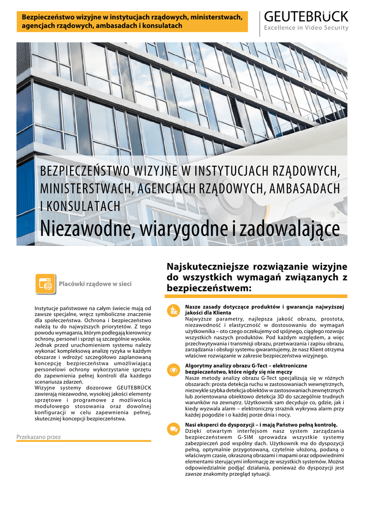 Bezpieczeństwo wizyjne w instytucjach rządowych, ministerstwach, agencjach rządowych, ambasadach i konsulatach BEZPIECZEŃSTWO WIZYJNE W INSTYTUCJACH RZĄDOWYCH, MINISTERSTWACH, AGENCJACH RZĄDOWYCH, AMBASADACH I KONSULATACH Niezawodne, wiarygodne i zadowalające Placówki rządowe w sieci Instytucje państwowe na całym świecie mają od zawsze specjalne, wręcz symboliczne znaczenie dla społeczeństwa. Ochrona i bezpieczeństwo należą tu do najwyższych priorytetów. Z tego powodu wymagania, którym podlegają kierownicy ochrony, personel i sprzęt są szczególnie wysokie. Jednak przed uruchomieniem systemu należy wykonać kompleksową analizę ryzyka w każdym obszarze i wdrożyć szczegółowo zaplanowaną koncepcję bezpieczeństwa umożliwiającą personelowi ochrony wykorzystanie sprzętu do zapewnienia pełnej kontroli dla każdego scenariusza zdarzeń. Wizyjne systemy dozorowe GEUTEBRÜCK zawierają niezawodne, wysokiej jakości elementy sprzętowe i programowe z możliwością modułowego stosowania oraz dowolnej konfiguracji w celu zapewnienia pełnej, skuteczniej koncepcji bezpieczeństwa. Przekazano przez Najskuteczniejsze rozwiązanie wizyjne do wszystkich wymagań związanych z bezpieczeństwem: Nasze zasady dotyczące produktów i gwarancja najwyższej jakości dla Klienta Najwyższe parametry, najlepsza jakość obrazu, prostota, niezawodność i elastyczność w dostosowaniu do wymagań użytkownika – oto czego oczekujemy od spójnego, ciągłego rozwoju wszystkich naszych produktów. Pod każdym względem, a więc przechwytywania i transmisji obrazu, przetwarzania i zapisu obrazu, zarządzania i obsługi systemu gwarantujemy, że nasz Klient otrzyma właściwe rozwiązanie w zakresie bezpieczeństwa wizyjnego. Algorytmy analizy obrazu G-Tect – elektroniczne bezpieczeństwo, które nigdy się nie męczy Nasze metody analizy obrazu G-Tect specjalizują się w różnych obszarach: prosta detekcja ruchu w zastosowaniach wewnętrznych, niezwykle szybka detekcja obiektów w zastosowaniach zewnętrznych lub zorientowana obiektowo detekcja 3D do szczególnie trudnych warunków na zewnątrz. Użytkownik sam decyduje co, gdzie, jak i kiedy wyzwala alarm – elektroniczny strażnik wykrywa alarm przy każdej pogodzie i o każdej porze dnia i nocy. Nasi eksperci do dyspozycji – i mają Państwo pełną kontrolę. Dzięki otwartym interfejsom nasz system zarządzania bezpieczeństwem G-SIM sprowadza wszystkie systemy zabezpieczeń pod wspólny dach. Użytkownik ma do dyspozycji pełną, optymalnie przygotowaną, czytelnie ułożoną, podaną o właściwym czasie, okraszoną obrazami i mapami oraz odpowiednimi elementami sterującymi informację ze wszystkich systemów. Można odpowiedzialnie podjąć działania, ponieważ do dyspozycji jest zawsze znakomity przegląd sytuacji. Bezpieczeństwo wizyjne w instytucjach rządowych, ministerstwach, agencjach rządowych, ambasadach i konsulatach PRZYKŁADY NASZYCH MODUŁÓW ROZWIĄZAŃ DLA INSTYTUCJI PAŃSTWOWYCH próbuje przedostać się na drugą stronę. Jeszcze lepszy efekt da dodatkowe zastosowanie naszej analizy obrazu. Certyfikowany algorytm G-Tect/VMX odróżnia w czasie rzeczywistym osoby, pojazdy oraz obiekty i małe zwierzęta, i wykorzystuje perspektywę do rozpoznawania wielkości, kierunku ruchu i prędkości każdego obiektu. Połączenie tych funkcjonalności oznacza doskonałą ochronę ogrodzenia. Kontrola dostępu – dokładna informacja kto znajduje się w obiekcie Bardzo ważne jest, aby wiedzieć przez cały czas, kto znajduje się w obiekcie. O uprawnienia dostępu troszczy się system kontroli dostępu, który posiada informacje osobowe. Nadal jednak brakuje pewności, że w obiekcie przebywają tylko uprawnione osoby. Wizyjny system dozorowy pokazuje, kto wchodzi do obiektu i dokumentuje te informacje przy pomocy zapisu obrazu uruchamianego przez system kontroli dostępu. Przy takiej technice któż Państwa oszuka? upixa/Shutterstock.com Wysoce skuteczna ochrona ogrodzenia Granice obiektu są zabezpieczone przez solidne ogrodzenie zapewniające skuteczną ochronę. Elektroniczny system alarmowy ochrony ogrodzenia wyzwala alarm, gdy ktoś usiłuje przejść się przez płot. I co teraz? Tylko przy pomocy wizyjnego systemu dozorowego można stwierdzić, czy alarm był fałszywy, czy ktoś rzeczywiście Bezpieczeństwo wizyjne w instytucjach rządowych, ministerstwach, agencjach rządowych, ambasadach i konsulatach Ręcznie: wyświetlany jest obraz z kamery wraz z rozpoznanym numerem tablicy rejestracyjnej. Użytkownik ma pełną kontrolę, zaś urządzenia dokładnie dokumentują procedurę w tle. Nasza aplikacja zarządzania dostępem pojazdów Vehicle Access Manager (VAM) pokazuje pojazdy, które znajdują się na terenie obiektu i zapewnia wszystkie funkcje oraz standardy bezpieczeństwa wymagane przez przepisy międzynarodowe dotyczące również operacji logistycznych. Michael Fritzen - Fotolia Kontrola dostępu – zoptymalizowana pod kątem bezpieczeństwa Z analizą obrazu to jest możliwe. System automatycznego rozpoznawania numerów tablic rejestracyjnych identyfikuje numer tablicy rejestracyjnej wjeżdżającego pojazdu. Uprawnienia określane są przez użytkownika – automatycznie lub ręcznie. Automatycznie: numer tablicy rejestracyjnej jest znany, brama otwiera się automatycznie, a obraz pojazdu i pasażerów zapisywany jest wraz z danymi pojazdu w centralnej bazie danych SQL. Aleksandra Pikalova/Shutterstock.com Zarządzanie budynkami Problemy nie muszą pochodzić z zewnątrz. Nieprzewidziane sytuacje związane z bezpieczeństwem, jak choćby awarie zgłaszane przez systemy budynkowe, mogą mieć przyczyny wewnętrzne, i wymagać szybkiego działania. Najgorszym przypadkiem jest alarm pożarowy. Zwykle wiadomo gdzie wystąpił, ale to za mało by ocenić faktyczną sytuację. Wizyjny system dozorowy ze strategicznie rozmieszczonymi kamerami w budynku dostarcza obrazy, które mogą 