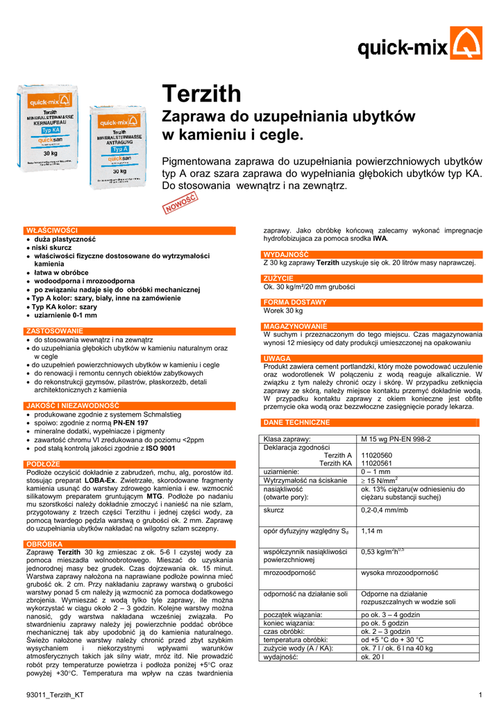 Terzith Zaprawa do uzupełniania ubytków w kamieniu i cegle. Pigmentowana zaprawa do uzupełniania powierzchniowych ubytków typ A oraz szara zaprawa do wypełniania głębokich ubytków typ KA. Do stosowania wewnątrz i na zewnątrz. WŁAŚCIWOŚCI duża plastyczność niski skurcz właściwości fizyczne dostosowane do wytrzymałości kamienia łatwa w obróbce wodoodporna i mrozoodporna po związaniu nadaje się do obróbki mechanicznej Typ A kolor: szary, biały, inne na zamówienie Typ KA kolor: szary uziarnienie 0-1 mm ZASTOSOWANIE do stosowania wewnątrz i na zewnątrz do uzupełniania głębokich ubytków w kamieniu naturalnym oraz w cegle do uzupełnień powierzchniowych ubytków w kamieniu i cegle do renowacji i remontu cennych obiektów zabytkowych do rekonstrukcji gzymsów, pilastrów, płaskorzeźb, detali architektonicznych z kamienia JAKOŚĆ I NIEZAWODNOŚĆ produkowane zgodnie z systemem Schmalstieg spoiwo: zgodnie z normą PN-EN 197 mineralne dodatki, wypełniacze i pigmenty zawartość chromu VI zredukowana do poziomu <2ppm pod stałą kontrolą jakości zgodnie z ISO 9001 PODŁOŻE Podłoże oczyścić dokładnie z zabrudzeń, mchu, alg, porostów itd. stosując preparat LOBA-Ex. Zwietrzałe, skorodowane fragmenty kamienia usunąć do warstwy zdrowego kamienia i ew. wzmocnić silikatowym preparatem gruntującym MTG. Podłoże po nadaniu mu szorstkości należy dokładnie zmoczyć i nanieść na nie szlam, przygotowany z trzech części Terzithu i jednej części wody, za pomocą twardego pędzla warstwą o grubości ok. 2 mm. Zaprawę do uzupełniania ubytków nakładać na wilgotny szlam sczepny. OBRÓBKA Zaprawę Terzith 30 kg zmieszac z ok. 5-6 l czystej wody za pomoca mieszadła wolnoobrotowego. Mieszać do uzyskania jednorodnej masy bez grudek. Czas dojrzewania ok. 15 minut. Warstwa zaprawy nałożona na naprawiane podłoże powinna mieć grubość ok. 2 cm. Przy nakładaniu zaprawy warstwą o grubości warstwy ponad 5 cm należy ją wzmocnić za pomoca dodatkowego zbrojenia. Wymieszać z wodą tylko tyle zaprawy, ile można wykorzystać w ciągu około 2 – 3 godzin. Kolejne warstwy można nanosić, gdy warstwa nakładana wcześniej związała. Po stwardnieniu zaprawy należy jej powierzchnie poddać obróbce mechanicznej tak aby upodobnić ją do kamienia naturalnego. Świeżo nałożone warstwy należy chronić przed zbyt szybkim wysychaniem i niekorzystnymi wpływami warunków atmosferycznych takich jak silny wiatr, mróz itd. Nie prowadzić robót przy temperaturze powietrza i podłoża poniżej +5C oraz powyżej +30C. Temperatura ma wpływ na czas twardnienia 93011_Terzith_KT zaprawy. Jako obróbkę końcową zalecamy wykonać impregnacje hydrofobizujaca za pomoca srodka IWA. WYDAJNOŚĆ Z 30 kg zaprawy Terzith uzyskuje się ok. 20 litrów masy naprawczej. ZUŻYCIE Ok. 30 kg/m²/20 mm grubości FORMA DOSTAWY Worek 30 kg MAGAZYNOWANIE W suchym i przeznaczonym do tego miejscu. Czas magazynowania wynosi 12 miesięcy od daty produkcji umieszczonej na opakowaniu UWAGA Produkt zawiera cement portlandzki, który może powodować uczulenie oraz wodorotlenek W połączeniu z wodą reaguje alkalicznie. W związku z tym należy chronić oczy i skórę. W przypadku zetknięcia zaprawy ze skórą, należy miejsce kontaktu przemyć dokładnie wodą. W przypadku kontaktu zaprawy z okiem konieczne jest obfite przemycie oka wodą oraz bezzwłoczne zasięgnięcie porady lekarza. DANE TECHNICZNE Klasa zaprawy: Deklaracja zgodności Terzith A Terzith KA uziarnienie: Wytrzymałość na ściskanie nasiąkliwość (otwarte pory): M 15 wg PN-EN 998-2 skurcz 0,2-0,4 mm/mb opór dyfuzyjny względny Sd 1,14 m współczynnik nasiąkliwości powierzchniowej 0,53 kg/m2h0,5 mrozoodporność wysoka mrozoodporność odporność na działanie soli Odporne na działanie rozpuszczalnych w wodzie soli początek wiązania: koniec wiązania: czas obróbki: temperatura obróbki: zużycie wody (A / KA): wydajność: po ok. 3 – 4 godzin po ok. 5 godzin ok. 2 – 3 godzin od +5 °C do + 30 °C ok. 7 l / ok. 6 l na 40 kg ok. 20 l 11020560 11020561 0 – 1 mm 15 N/mm2 ok. 13% ciężaru(w odniesieniu do ciężaru substancji suchej) 1 kolory: biała, szara, żółtoszara, szarożółta, dalsze odcienie żółci, czerwieni, zieleni na życzenie kolory specjalne przechowywanie: w suchym i przeznaczonym do tego miejscu; 12 miesięcy od daty produkcji forma dostawy: 30 kg typ A: uzupełnianie powierzchniowe typ KA: ubytki głębokie Dane techniczne dotyczą Terzithu typ A, kolor 5001. W przypadku innych kolorów podane wartości mogą się nieznacznie różnić. Materiały farbowane mogą być mieszane w celu uzyskania odpowiedniego koloru. Dane techniczne odnoszą się do temperatury 20°C i 65% wilgotności względnej powietrza quick-mix Sp. z o.o. ul. Brzegowa 73, 57-100 Strzelin quick-mix Gruppe GmbH & Co. KG Mühleneschweg 6 49090 Osnabrück 04 PN-EN 998-2:2004 1488 1488-CPD-0014 1488-CPD-0102 Zaprawa murarska według projektu, ogólnego przeznaczenia do stosowania wewnątrz i na zewnątrz w elementach budowlanych podlegających wymaganiom konstrukcyjnym Reakcja na ogień: A1 Wytrzymałość na ściskanie: M 15 0,15 N/mm² Początkowa wytrzymałość na ścinanie: (wartość tab.) Absorpcja wody: Zawartość chlorków: Współczynnik przepuszczania pary wodnej μ: Współczynnik przewodzenia ciepła λ10,dry: Stan: 30 września 2011 Z chwilą wydania nowej karty technicznej niniejsza wersja traci swą ważność Szersze informacje można uzyskać: quick-mix sp. z o.o. ul. Brzegowa 73 57-100 Strzelin tel. 71/ 392 72 20, 15 fax. 71/ 392 72 23, 24 e-mail: [email protected] www.quick-mix.pl 0,5 (wartość tab.) ) 5/35 (wartość tab.) P=50% /(m·K) dla P=90% (wartość tab. PN-EN 1745) Trwałość(odporność na zamrażanie-odmrażanie): Przyjęto na podstawie własnych doświadczeń; do stosowania w środowisku surowym wg PN-EN 998-2 Załącznik B 93011_Terzith_KT 2