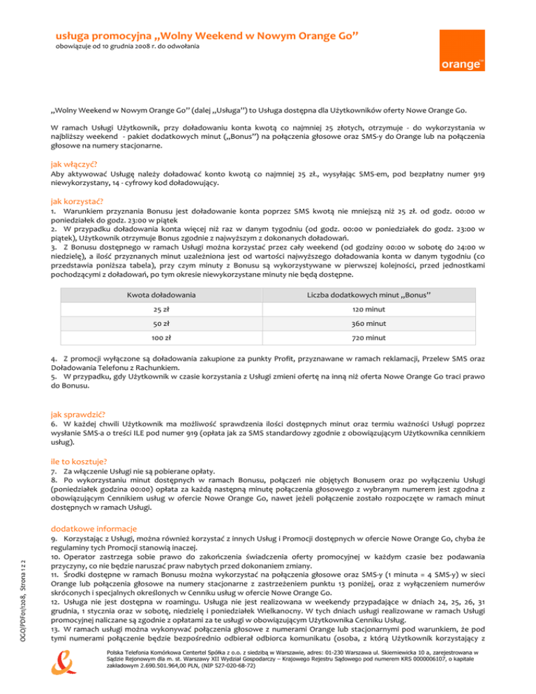 usługa promocyjna „Wolny Weekend w Nowym Orange Go” obowiązuje od 10 grudnia 2008 r. do odwołania „Wolny Weekend w Nowym Orange Go” (dalej „Usługa”) to Usługa dostępna dla Użytkowników oferty Nowe Orange Go. W ramach Usługi Użytkownik, przy doładowaniu konta kwotą co najmniej 25 złotych, otrzymuje - do wykorzystania w najbliższy weekend - pakiet dodatkowych minut („Bonus”) na połączenia głosowe oraz SMS-y do Orange lub na połączenia głosowe na numery stacjonarne. jak włączyć? Aby aktywować Usługę należy doładować konto kwotą co najmniej 25 zł., wysyłając SMS-em, pod bezpłatny numer 919 niewykorzystany, 14 - cyfrowy kod doładowujący. jak korzystać? 1. Warunkiem przyznania Bonusu jest doładowanie konta poprzez SMS kwotą nie mniejszą niż 25 zł. od godz. 00:00 w poniedziałek do godz. 23:00 w piątek 2. W przypadku doładowania konta więcej niż raz w danym tygodniu (od godz. 00:00 w poniedziałek do godz. 23:00 w piątek), Użytkownik otrzymuje Bonus zgodnie z najwyższym z dokonanych doładowań. 3. Z Bonusu dostępnego w ramach Usługi można korzystać przez cały weekend (od godziny 00:00 w sobotę do 24:00 w niedzielę), a ilość przyznanych minut uzależniona jest od wartości najwyższego doładowania konta w danym tygodniu (co przedstawia poniższa tabela), przy czym minuty z Bonusu są wykorzystywane w pierwszej kolejności, przed jednostkami pochodzącymi z doładowań, po tym okresie niewykorzystane minuty nie będą dostępne. Kwota doładowania Liczba dodatkowych minut „Bonus” 25 zł 120 minut 50 zł 360 minut 100 zł 720 minut 4. Z promocji wyłączone są doładowania zakupione za punkty Profit, przyznawane w ramach reklamacji, Przelew SMS oraz Doładowania Telefonu z Rachunkiem. 5. W przypadku, gdy Użytkownik w czasie korzystania z Usługi zmieni ofertę na inną niż oferta Nowe Orange Go traci prawo do Bonusu. jak sprawdzić? 6. W każdej chwili Użytkownik ma możliwość sprawdzenia ilości dostępnych minut oraz termiu ważności Usługi poprzez wysłanie SMS-a o treści ILE pod numer 919 (opłata jak za SMS standardowy zgodnie z obowiązującym Użytkownika cennikiem usług). ile to kosztuje? 7. Za włączenie Usługi nie są pobierane opłaty. 8. Po wykorzystaniu minut dostępnych w ramach Bonusu, połączeń nie objętych Bonusem oraz po wyłączeniu Usługi (poniedziałek godzina 00:00) opłata za każdą następną minutę połączenia głosowego z wybranym numerem jest zgodna z obowiązującym Cennikiem usług w ofercie Nowe Orange Go, nawet jeżeli połączenie zostało rozpoczęte w ramach minut dostępnych w ramach Usługi. OGO/PDF01/1208, Strona 1 z 2 dodatkowe informacje 9. Korzystając z Usługi, można również korzystać z innych Usług i Promocji dostępnych w ofercie Nowe Orange Go, chyba że regulaminy tych Promocji stanowią inaczej. 10. Operator zastrzega sobie prawo do zakończenia świadczenia oferty promocyjnej w każdym czasie bez podawania przyczyny, co nie będzie naruszać praw nabytych przed dokonaniem zmiany. 11. Środki dostępne w ramach Bonusu można wykorzystać na połączenia głosowe oraz SMS-y (1 minuta = 4 SMS-y) w sieci Orange lub połączenia głosowe na numery stacjonarne z zastrzeżeniem punktu 13 poniżej, oraz z wyłączeniem numerów skróconych i specjalnych określonych w Cenniku usług w ofercie Nowe Orange Go. 12. Usługa nie jest dostępna w roamingu. Usługa nie jest realizowana w weekendy przypadające w dniach 24, 25, 26, 31 grudnia, 1 stycznia oraz w sobotę, niedzielę i poniedziałek Wielkanocny. W tych dniach usługi realizowane w ramach Usługi promocyjnej naliczane są zgodnie z opłatami za te usługi w obowiązującym Użytkownika Cenniku Usług. 13. W ramach usługi można wykonywać połączenia głosowe z numerami Orange lub stacjonarnymi pod warunkiem, że pod tymi numerami połączenie będzie bezpośrednio odbierał odbiorca komunikatu (osoba, z którą Użytkownik korzystający z Polska Telefonia Komórkowa Centertel Spółka z o.o. z siedzibą w Warszawie, adres: 01-230 Warszawa ul. Skierniewicka 10 a, zarejestrowana w Sądzie Rejonowym dla m. st. Warszawy XII Wydział Gospodarczy – Krajowego Rejestru Sądowego pod numerem KRS 0000006107, o kapitale zakładowym 2.690.501.964,00 PLN, (NIP 527-020-68-72) OGO/PDF01/1208, Strona 2 z 2 Usługi prowadzi rozmowę za pomocą połączenia głosowego). Niedozwolone jest natomiast wykonywanie przez Użytkownika połączeń z wybranym numerem w przypadku, gdy połączenie poprzez ten numer będzie przekierowane dalej, czy to za pomocą innego połączenia głosowego, czy też metodą przesyłania głosu w formie transmisji danych (Voice Over Internet Protocol). Ponadto Użytkownik korzystający z Usługi zobowiązuje się nie udostępniać odpłatnie możliwości korzystania z Usługi innym osobom - takie działanie będzie traktowane jako działania na szkodę Polskiej Telefonii Komórkowej Centertel Spółka z ograniczoną odpowiedzialnością 14. Zlecenie skorzystania z Promocji jest jednoznaczne z akceptacja postanowień niniejszego Regulaminu, który jest dostępny na stronie internetowej www.orange.pl, w salonach Orange oraz w salonach partner Orange. 15. W zakresie nie uregulowanym niniejszym Regulaminem do świadczenia oferty promocyjnej stosuje się obowiązujący Abonenta Regulamin świadczenia usług telekomunikacyjnych w sieci telekomunikacyjnej przez spółkę pod firmą Polska Telefonia Komórkowa Centertel Spółka z ograniczoną odpowiedzialnością oraz obowiązujący cennik usług w ofercie Nowe Orange Go. Sieć Orange oznacza sieć pod nazwą „Orange” w Polsce, której operatorem jest PTK - Centertel sp. z o.o. z siedzibą w Warszawie, adres: ul. Skierniewicka 10a, 01-230 Warszawa, zarejestrowana w rejestrze przedsiębiorców prowadzonym przez Sąd Rejonowy dla m.st. Warszawy, XII Wydział Gospodarczy Krajowego Rejestru Sądowego pod numerem KRS 0000006107, o kapitale zakład