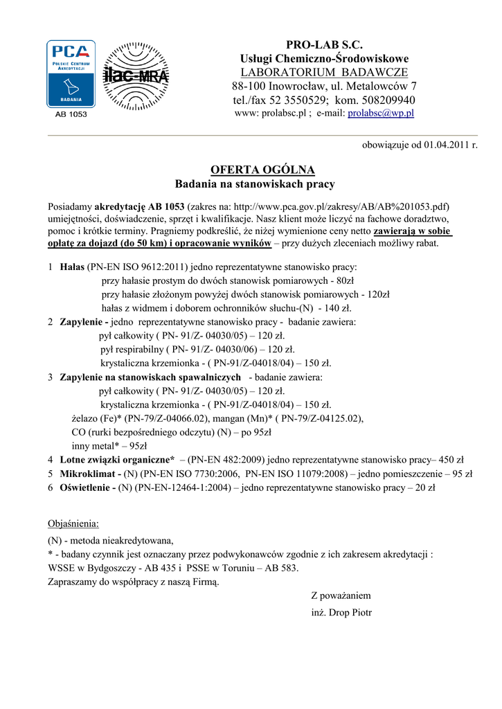 PRO-LAB S.C. Usługi Chemiczno-Środowiskowe LABORATORIUM BADAWCZE 88-100 Inowrocław, ul. Metalowców 7 tel./fax 52 3550529; kom. 508209940 www: prolabsc.pl ; e-mail: [email protected] obowiązuje od 01.04.2011 r. OFERTA OGÓLNA Badania na stanowiskach pracy Posiadamy akredytację AB 1053 (zakres na: http://www.pca.gov.pl/zakresy/AB/AB%201053.pdf) umiejętności, doświadczenie, sprzęt i kwalifikacje. Nasz klient może liczyć na fachowe doradztwo, pomoc i krótkie terminy. Pragniemy podkreślić, że niżej wymienione ceny netto zawierają w sobie opłatę za dojazd (do 50 km) i opracowanie wyników – przy dużych zleceniach możliwy rabat. 1 Hałas (PN-EN ISO 9612:2011) jedno reprezentatywne stanowisko pracy: przy hałasie prostym do dwóch stanowisk pomiarowych - 80zł przy hałasie złożonym powyżej dwóch stanowisk pomiarowych - 120zł hałas z widmem i doborem ochronników słuchu-(N) - 140 zł. 2 Zapylenie - jedno reprezentatywne stanowisko pracy - badanie zawiera: pył całkowity ( PN- 91/Z- 04030/05) – 120 zł. pył respirabilny ( PN- 91/Z- 04030/06) – 120 zł. krystaliczna krzemionka - ( PN-91/Z-04018/04) – 150 zł. 3 Zapylenie na stanowiskach spawalniczych - badanie zawiera: pył całkowity ( PN- 91/Z- 04030/05) – 120 zł. krystaliczna krzemionka - ( PN-91/Z-04018/04) – 150 zł. żelazo (Fe)* (PN-79/Z-04066.02), mangan (Mn)* ( PN-79/Z-04125.02), CO (rurki bezpośredniego odczytu) (N) – po 95zł inny metal* – 95zł 4 Lotne związki organiczne* – (PN-EN 482:2009) jedno reprezentatywne stanowisko pracy– 450 zł 5 Mikroklimat - (N) (PN-EN ISO 7730:2006, PN-EN ISO 11079:2008) – jedno pomieszczenie – 95 zł 6 Oświetlenie - (N) (PN-EN-12464-1:2004) – jedno reprezentatywne stanowisko pracy – 20 zł Objaśnienia: (N) - metoda nieakredytowana, * - badany czynnik jest oznaczany przez podwykonawców zgodnie z ich zakresem akredytacji : WSSE w Bydgoszczy - AB 435 i PSSE w Toruniu – AB 583. Zapraszamy do współpracy z naszą Firmą. Z poważaniem inż. Drop Piotr