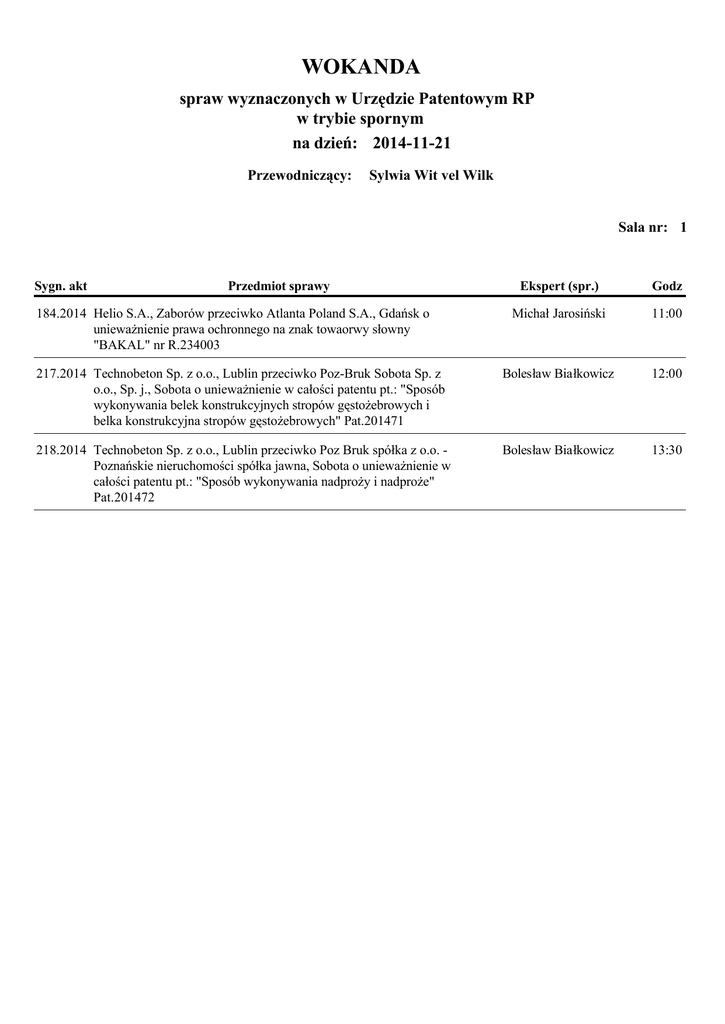 WOKANDA spraw wyznaczonych w Urzędzie Patentowym RP w trybie spornym na dzień: 2014-11-21 Przewodniczący: Sylwia Wit vel Wilk Sala nr: 1 Sygn. akt Przedmiot sprawy Ekspert (spr.) Godz Michał Jarosiński 11:00 217.2014 Technobeton Sp. z o.o., Lublin przeciwko Poz-Bruk Sobota Sp. z o.o., Sp. j., Sobota o unieważnienie w całości patentu pt.: "Sposób wykonywania belek konstrukcyjnych stropów gęstożebrowych i belka konstrukcyjna stropów gęstożebrowych" Pat.201471 Bolesław Białkowicz 12:00 218.2014 Technobeton Sp. z o.o., Lublin przeciwko Poz Bruk spółka z o.o. Poznańskie nieruchomości spółka jawna, Sobota o unieważnienie w całości patentu pt.: "Sposób wykonywania nadproży i nadproże" Pat.201472 Bolesław Białkowicz 13:30 184.2014 Helio S.A., Zaborów przeciwko Atlanta Poland S.A., Gdańsk o unieważnienie prawa ochronnego na znak towaorwy słowny "BAKAL" nr R.234003