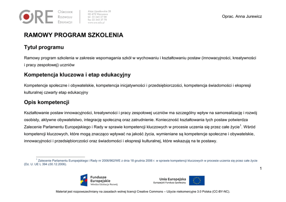 Oprac. Anna Jurewicz RAMOWY PROGRAM SZKOLENIA Tytuł programu Ramowy program szkolenia w zakresie wspomagania szkół w wychowaniu i kształtowaniu postaw (innowacyjności, kreatywności i pracy zespołowej) uczniów Kompetencja kluczowa i etap edukacyjny Kompetencje społeczne i obywatelskie, kompetencja inicjatywności i przedsiębiorczości, kompetencja świadomości i ekspresji kulturalnej czwarty etap edukacyjny Opis kompetencji Kształtowanie postaw innowacyjności, kreatywności i pracy zespołowej uczniów ma szczególny wpływ na samorealizację i rozwój osobisty, aktywne obywatelstwo, integrację społeczną oraz zatrudnienie. Konieczność kształtowania tych postaw potwierdza Zalecenie Parlamentu Europejskiego i Rady w sprawie kompetencji kluczowych w procesie uczenia się przez całe życie 1. Wśród kompetencji kluczowych, które mogą znacząco wpływać na jakość życia, wymieniane są kompetencje społeczne i obywatelskie, innowacyjności i przedsiębiorczości oraz świadomości i ekspresji kulturalnej, które wskazują na te postawy. 1 Zalecenie Parlamentu Europejskiego i Rady nr 2006/962/WE z dnia 18 grudnia 2006 r. w sprawie kompetencji kluczowych w procesie uczenia się przez całe życie (Dz. U. UE L 394 z30.12.2006). 1 Materiał jest rozpowszechniany na zasadach wolnej licencji Creative Commons – Użycie niekomercyjne 3.0 Polska (CC-BY-NC). Oprac. Anna Jurewicz Kompetencje społeczne i obywatelskie2 Kompetencje społeczne i obywatelskie są to kompetencje osobowe, interpersonalne i międzykulturowe obejmujące pełny zakres zachowań przygotowujących osoby do skutecznego i konstruktywnego uczestnictwa w życiu społecznym i zawodowym, szczególnie w społeczeństwach charakteryzujących się coraz większą różnorodnością, a także rozwiązywania konfliktów w razie potrzeby. Kompetencje obywatelskie przygotowują osoby do pełnego uczestnictwa w życiu obywatelskim w oparciu o znajomość pojęć i struktur społecznych i politycznych oraz poczuwanie się do aktywnego i demokratycznego uczestnictwa. Niezbędna wiedza, umiejętności i postawy powiązane z tą kompetencją Kompetencje społeczne są związane z dobrem osobistym i społecznym, które wymaga świadomości, w jaki sposób można zapewnić danej osobie optymalny poziom zdrowia fizycznego i psychicznego, rozumianego również jako zasób danej osoby i jej rodziny oraz bezpośredniego otoczenia społecznego, a także wiedzy, w jaki sposób może się do tego przyczynić odpowiedni styl życia. Dla powodzenia w kontaktach interpersonalnych i uczestnictwie społecznym niezbędne jest rozumienie zasad postępowania i reguł zachowania ogólnie przyjętych w różnych społeczeństwach i środowiskach (np. w pracy). Równie istotna jest świadomość podstawowych pojęć dotyczących osób, grup, organizacji zawodowych, równości płci i niedyskryminacji, społeczeństwa i kultury. 2 Opisy poszczególnych kompetencji pochodzą z: Zalecenie Parlamentu Europejskiego i Rady nr 2006/962/WE z dnia 18 grudnia 2006 r. w sprawie kompetencji kluczowych w procesie uczenia się przez całe życie (Dz. U. UE L 394 z30.12.2006). 2 Materiał jest rozpowszechniany na zasadach wolnej licencji Creative Commons – Użycie niekomercyjne 3.0 Polska (CC-BY-NC). Oprac. Anna Jurewicz Konieczne jest rozumienie wielokulturowych i społeczno-ekonomicznych wymiarów społeczeństw europejskich, a także wzajemnej interakcji narodowej tożsamości kulturowej i tożsamości europejskiej. Podstawowe umiejętności w zakresie tej kompetencji obejmują zdolność do konstruktywnego porozumiewania się w różnych środowiskach, wykazywania się tolerancją, wyrażania i rozumienia różnych punktów widzenia, negocjowania połączonego ze zdolnością tworzenia klimatu zaufania, a także zdolność do empatii. Osoby powinny być zdolne do radzenia sobie ze stresem i frustracją oraz do wyrażania ich w konstruktywny sposób, a także powinny dokonywać rozróżnienia sfery osobistej i zawodowej. Kompetencja ta opiera się na współpracy, asertywności i prawości. Osoby powinny interesować się rozwojem społecznogospodarczym, komunikacją międzykulturową, cenić różnorodność i szanować innych ludzi, a także być przygotowane na pokonywanie uprzedzeń i osiąganie kompromisu. Kompetencje obywatelskie opierają się na znajomości takich pojęć, jak: demokracja, sprawiedliwość, równość, obywatelstwo i prawa obywatelskie, łącznie ze sposobem ich sformułowania w Karcie Praw Podstawowych Unii Europejskiej i międzynarodowych deklaracjach oraz ich stosowaniem przez różne instytucje na poziomach lokalnym, regionalnym, krajowym, europejskim i międzynarodowym. Obejmują one również znajomość współczesnych wydarzeń, jak i głównych wydarzeń i tendencji w narodowej, europejskiej i światowej historii. Ponadto, należy zwiększyć świadomość celów, wartości i polityk, jakimi kierują się ruchy społeczne i polityczne. Niezbędna jest również znajomość integracji europejskiej oraz struktur UE, z ich głównymi celami i wartościami, jak i świadomość różnorodności i tożsamości kulturowych w Europie. 3 Materiał jest rozpowszechniany na zasadach wolnej licencji Creative Commons – Użycie niekomercyjne 3.0 Polska (CC-BY-NC). Oprac. Anna Jurewicz Umiejętności w zakresie kompetencji obywatelskich obejmują zdolność do efektywnego zaangażowania, wraz z innymi ludźmi, w działania publiczne, wykazywania solidarności i zainteresowania rozwiązywaniem problemów stojących przed lokalnymi i szerszymi społecznościami. Do umiejętności tych należy krytyczna i twórcza refleksja oraz konstruktywne uczestnictwo w działaniach społeczności lokalnych i sąsiedzkich oraz procesach podejmowania decyzji na wszystkich poziomach, od lokalnego, poprzez krajowy, po europejski, szczególnie w drodze głosowania. Pełne poszanowanie praw człowieka, w tym równości, jako podstawy demokracji, uznan