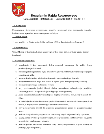 Regulamin Rajdu Rowerowego Łomianki ICDS – KPN Izabelin – Łomianki ICDS 11.06.2011 r. 1. Cel imprezy: Popularyzacja aktywnego wypoczynku, turystyki rowerowej oraz poznawanie walorów krajobrazowych powiatu warszawskiego zachodniego. 2. Termin Rajdu 11 czerwca 2011 r. Start o godz. 9.00 z parkingu ICDS w Łomiankach, ul. Staszica 2. 3. Organizatorzy: Urząd Miejski w Łomiankach oraz nauczyciele w-f ze szkół położonych na terenie Gminy Łomianki. 4. Warunki uczestnictwa: a) wypełnienie 2 kart startowych. Jedną uczestnik zatrzymuje dla siebie, drugą przekazuje organizatorowi, b) przestrzeganie regulaminu rajdu oraz obowiązkowe podporządkowanie się decyzjom organizatora rajdu, c) posiadanie niezbędnej wiedzy i umiejętności poruszania się po drogach, d) osoby niepełnoletnie mogą brać udział w rajdzie tylko pod opieką osoby dorosłej, e) posiadanie sprawnego technicznie roweru, f) przy przekraczaniu jezdni (drogi) służby porządkowe zabezpieczają przejście, zatrzymując ruch i przeprowadzając całą grupę na drugą stronę, g) jadąc rzędem należy zachować odległość między rowerami 3-5 m, a przy zjazdach 1530 m, h) w trakcie jazdy należy dostosować prędkość do swoich umiejętności oraz sytuacji na drodze, a przy zjazdach przestrzegać zakazu wyprzedzania, i) przy pokonywaniu przejść dla pieszych, przechodzimy przez nie przeprowadzając rower, j) podczas jazdy nie należy wypuszczać kierownicy z rąk i zdejmować stóp z pedałów, k) należy jechać równo i spokojnie w szyku. Niedopuszczalnie jest tarasowanie się, jazda równoległa i ciągłe zmiany pozycji, l) podczas postoju nie należy tarasować drogi. Należy organizować je poza jezdnią na parkingu, łące lub polanie, m) w czasie postoju nie należy oddalać się od grupy, n) organizator zapewnia opiekę medyczną o) organizator nie bierze na siebie odpowiedzialności za rzeczy zagubione, szkody osobowe, rzeczowe i majątkowe, które wystąpią przed, w trakcie lub po zakończeniu rajdu, p) organizator nie bierze żadnej odpowiedzialności za ewentualne kolizje lub wypadki spowodowane przez uczestników rajdu, q) uczestnicy rajdu ubezpieczają się we własnym zakresie, r) uczestnicy radu rowerowego startują na własną odpowiedzialność, s) udział w rajdzie jest bezpłatny, t) nieprzestrzeganie regulaminu rajdu oraz samowolna zmiana trasy rajdu powodują wykluczeniu z rajdu, u) wskazane jest posiadanie kasków ochronnych 5. Na trasie zabrania się: a) spożywania alkoholu i innych środków odurzających, b) śmiecenia, c) niszczenia przyrody, d) indywidualnej jazdy rowerem bez opiekuna, e) używania szklanych pojemników. f) głośnego zachowywania się 6. Trasa rajdu: Początek Rajdu: Integracyjne Centrum Dydaktyczno Sportowe w Łomiankach (START) > Szpital Dziecięcy w Dziekanowie Leśnym > szlakiem zielonym do Kamienia W. Plapisa > szlakiem żółtym do Spółkowej Góry > szlakiem czarnym do Sierakowa > szlakiem czarnym do siedziby KPN (postój, krótki odpoczynek i ciepły posiłek) Powrót na trasie: siedziba KPN > szlakiem czarnym do Sierakowa > szlakiem czarnym do półkowej Góry > Aleją Ułanów Jazłowieckich do Dąbrowy Leśnej > Biały Domek w Dąbrowie Leśnej > Integracyjne Centrum Dydaktyczno Sportowe w Łomiankach (META). 7. Informacje dodatkowe: Podczas postoju zaplanowanego w drodze powrotnej, wśród uczestników rajdu przeprowadzona będzie loteria fantowa. Do wygrania będą nagrody, ufundowane przez Urząd Miejski w Łomiankach oraz Gminną Komisję Rozwiązywania Problemów Alkoholowych w Łomiankach.