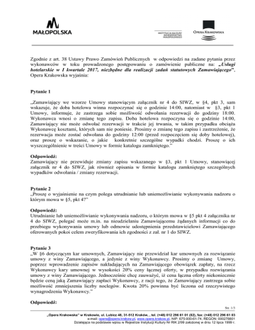 Zgodnie z art. 38 Ustawy Prawo Zamówień Publicznych w odpowiedzi na zadane pytania przez wykonawców w toku prowadzonego postępowaniu o zamówienie publiczne na: „Usługi hotelarskie w I kwartale 2017, niezbędne dla realizacji zadań statutowych Zamawiającego”, Opera Krakowska wyjaśnia: Pytanie 1 „Zamawiający we wzorze Umowy stanowiącym załącznik nr 4 do SIWZ, w §4, pkt 3, sam wskazuje, że doba hotelowa winna rozpoczynać się o godzinie 14:00, natomiast w §3, pkt 1 Umowy, informuje, że zastrzega sobie możliwość odwołania rezerwacji do godziny 18:00. Wykonawca wnosi o zmianę tego zapisu. Doba hotelowa rozpoczyna się o godzinie 14:00, Zamawiający nie może odwołać rezerwacji w trakcie jej trwania, w takim przypadku obciąża Wykonawcę kosztami, których sam nie poniesie. Prosimy o zmianę tego zapisu i zastrzeżenie, że rezerwacja może zostać odwołana do godziny 12:00 (przed rozpoczęciem się doby hotelowej), oraz proszę o wskazanie, o jakie konkretnie szczególne wypadki chodzi. Proszę o ich wyszczególnienie w treści Umowy w formie katalogu zamkniętego.” Odpowiedź: Zamawiający nie przewiduje zmiany zapisu wskazanego w §3, pkt 1 Umowy, stanowiącej załącznik nr 4 do SIWZ, jak również opisania w formie katalogu zamkniętego szczególnych wypadków odwołania / zmiany rezerwacji. Pytanie 2 „Proszę o wyjaśnienie na czym polega utrudnianie lub uniemożliwianie wykonywania nadzoru o którym mowa w §5, pkt 4?” Odpowiedź: Utrudnianie lub uniemożliwianie wykonywania nadzoru, o którym mowa w §5 pkt 4 załącznika nr 4 do SIWZ, polegać może m.in. na nieudzielaniu Zamawiającemu żądanych informacji co do przebiegu wykonywania umowy lub odmowie udostępnienia przedstawicielowi Zamawiającego oferowanych pokoi celem zweryfikowania ich zgodności z zał. nr 1 do SIWZ. Pytanie 3 „W §6 dotyczącym kar umownych, Zamawiający nie przewidział kar umownych za rozwiązanie umowy z winy Zamawiającego, a jedynie z winy Wykonawcy. Prosimy o zmianę Umowy, poprzez wprowadzenie zapisów nakładających na Zamawiającego obowiązek zapłaty, na rzecz Wykonawcy kary umownej w wysokości 20% ceny łącznej oferty, w przypadku rozwiązania umowy z winy Zamawiającego. Jednocześnie chcę zauważyć, iż cena łączna oferty niekoniecznie będzie ceną jaką Zamawiający zapłaci Wykonawcy, z racji tego, że Zamawiający zastrzega sobie możliwość zmniejszenia liczby noclegów. Kwota 20% powinna być liczona od rzeczywistego wynagrodzenia Wykonawcy.” Odpowiedź: Str. 1/3 „Opera Krakowska” w Krakowie, ul. Lubicz 48, 31-512 Kraków, , tel. (+48) 012 296 61 01 (02), fax: (+48) 012 296 61 03 e-mail: [email protected], www.opera.krakow.pl, NIP: 675-000-61-74, REGON: 000278801 Działająca na podstawie wpisu w Rejestrze Instytucji Kultury Nr RIK 2/99 założonej w dniu 12 lipca 1999 r. Zamawiający nie zamierza wprowadzić w szablonie umowy zapisów dot. kar umownych nakładanych na Zamawiającego. Pytanie 4 „Proszę o zmianę §7 Umowy, w ten sposób, że Zamawiający dopisze: „Uprawnienie do rozwiązania umowy, służy Zamawiającemu w przypadku, gdy Wykonawca nie zastosuje się niezwłocznie, maksymalnie w ciągu 3h od momentu zapoznania się z pisemnym wezwaniem.” Odpowiedź: Zamawiający pozostawia pierwotną wersję zapisu w § 7 pkt 1 Umowy, tj.: „………Uprawnienie do rozwiązania umowy, służy Zamawiającemu w przypadku, gdy Wykonawca nie zastosuje się niezwłocznie, maksymalnie w ciągu 1 h, do pisemnego wezwania.” Pytanie 5 „Prosimy o wykreślenie zapisu znajdującego się w §1, pkt 8 Umowy „Wykonawca oświadcza, iż usługi hotelowe są przedmiotem jego działalności gospodarczej, wykonywanej zgodnie z obowiązującymi przepisami prawa”. Zamawiający w ten sposób nie dopuszcza do udziału w postępowaniu prywatnych firm, które w sposób profesjonalny zajmują się organizacją tego typu przedsięwzięć, biorąc pod uwagę fakt iż ustawa Pzp dopuszcza korzystanie z podmiotów trzecich, które w trakcie realizacji zamówienia są Podwykonawcami, Zamawiający winien dopuścić do udziału w postępowaniu również prywatne firmy. Takie firmy były dopuszczone do udziału w postępowaniu w latach poprzednich.” Odpowiedź: Zamawiający modyfikuje §1 pkt 8 Umowy, w ten sposób, że określenie „usługi hotelowe” zmienia na „usługi świadczone na podstawie niniejszej umowy”. W związku z powyższym, punkt, o którym mowa w poprzednim zdaniu otrzymuje brzmienie: „Wykonawca oświadcza, iż usługi świadczone na podstawie niniejszej umowy są przedmiotem jego działalności gospodarczej, wykonywanej zgodnie z obowiązującymi przepisami prawa”. W postępowaniu mogą wziąć udział zarówno podmioty świadczące usługi hotelarskie (noclegowe w przypadku części II postępowania) jak również operatorzy turystyczni, biura podróży itp. Pytanie 6 „Prosimy także o usuniecie ze „Szczegółowego opisu przedmiotu zamówienia”, z pkt 1 podpunktu f). Zamawiający dopuszcza do udziału w postępowaniu hotele posiadające min 3 gwiazdki, obiekty tej klasy bardzo rzadko posiadają chociażby zaplecze fitness. Biorąc pod uwagę fakt, iż odległość hotelu od siedziby Zamawiającego wynosi tylko 2 km warunek ten spełnia tylko hotel Chopin, znajdujący się w najbliższej okolicy siedziby Zamawiającego. Zgodnie z art. 7.1 ustawy Pzp podstawowym obowiązkiem Zamawiającego jest przestrzeganie zasady uczciwej konkurencji. Nie można mówić o uczciwej konkurencji w przypadku spełniania wymogów przez jeden obiekt. Prosimy o wykreślenie tego wymogu. Gdyby Zamawiający w opisie przedmiotu zamówienia zastrzegł, że o udzielenie zamówienia mogą ubiegać się tylko obiekty 5 gwiazdkowe nikogo by nie dziwił wymóg posiadania przez obiekt Spa lub gabinetu odnowy biologicznej, niemniej w przypadku obiektu 3 gwiazdkowego jest to zbyt wygórowany warunek, mając na uwadze to, że cena stanowi 60%, a jak wiad