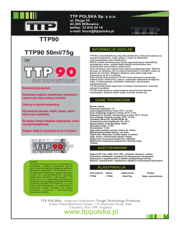 TTP POLSKA Sp. z o.o. ul. D³uga 25 43-365 Wilkowice tel/fax: 33 816 04 14 e-mail: [email protected] TTP90 TTP90 50ml/75g SILNY KLEJ STRUKTURALNY Doskona³a przyczepnoœæ Strukturalne spajanie, uszczelnianie, wype³nianie i naprawa przy u¿yciu jednego produktu. Odporny na wysokie temperatury. Klei tworzywa sztuczne, metale, drewno, beton i wiele innych materia³ów. Nie zawiera lotnych zwi¹zków organicznych, chloru oraz jest bezzapachowy. Wstêpne sklejenie uzyskujemy ju¿ po 5 minutach. INFORMACJE OGÓLNE TTP 90 to dwusk³adnikowy silny klej strukturalny, który jest odporny na wysokie temperatury, wodê, paliwa, a tak¿e na wiêkszoœæ rozpuszczalników oraz chemikaliów. Klej ten zosta³ testowany przy u¿yciu rygorystycznych specyfikacji wymaganych przez najwa¿niejsze fabryki samochodów oraz producentów samochodów ciê¿arowych. 15-to minutowy czas wi¹zania jest ogromn¹ zalet¹ tego kleju. G³ównie dla tego, ¿e dzia³amy nim na ma³ych elementach i w krótkim czasie s¹ gotowe do monta¿u. Wstêpne sklejenie, przy u¿yciu tego kleju uzyskujemy ju¿ po 5 minutach. Poza bran¿¹ samochodow¹ TTP 90 mo¿na stosowaæ w przemyœle elektrycznym i elektronice, optyce i przemyœle szklarskim do klejenia szk³a, w budownictwie, przemyœle meblowym, chemicznym, maszynowym itp. TTP 90 posiada du¿¹ odpornoœæ na bodŸce mechaniczne i du¿¹ si³ê adhezji do pod³o¿a. TTP 90 mo¿e ³¹czyæ ze sob¹ tworzywa sztuczne oraz dowolne kombinacje z u¿yciem metali, szk³a, ceramiki, drewna itp. DANE TECHNICZNE Barwa: czarna Proporcja mieszania: 1/1 Czas przygotowania w temp. 23°C: 1,5 min. Czas wstêpnego wi¹zania w temp. 23°C: 5 min. Gotowoœæ do obróbki mechanicznej w temp. 23°C: 10 min. Czas pe³nego wi¹zania w temp. 23°C: 15 min. Twardoœæ (Shore D), ASTM D2240: 69 Temperatura pracy (aplikacji): 20 - 25°C Wytrzyma³oœæ na temperaturê: 150°C Absorpcja wody: <1,5% Kurczliwoœæ: <1,0% Optymalna gruboœæ spoiny: 0,5mm do 1,5mm Maksymalna gruboœæ spoiny: ok. 5mm Odpornoœæ chemiczna: bardzo dobra na paliwa, oleje, smary, rozcieñczone alkalia i kwasy. Odpornoœæ na promieniowanie UV: ca³kowita Mo¿liwooœæ malowania powierzchni: dowolne farby i lakiery. ZASTOSOWANIE UWAGA Wszystkie informacje, ³¹cznie z ilustracjami s¹ wiarygodne. Jednak¿e u¿ytkownicy powinni sami oceniæ przydatnoœæ ka¿dego produktu do w³aœciwych zastosowañ. TTP Polska Sp. z o.o. nie gwarantuje dok³adnoœci pe³nej informacji i zrzeka siê odpowiedzialnoœci odnoœnie u¿ytkowania produktów. Zobowi¹zania TTP Polska Sp. z o.o. ograniczaj¹ siê jedynie do standardowych warunków sprzeda¿y produktu i w ¿adnym wypadku TTP Polska Sp. z o.o. nie ponosi odpowiedzialnoœci za przypadkowe i poœrednie szkody powsta³e na skutek sprzeda¿y, u¿ywania i niew³aœciwego stosowania produktu. Klejenie PP i PE z ABS, PVC, HPL, metalami, drewnem, szk³em, kamieniem, poliestrem, twardymi lub elastycznymi tworzywami sztucznymi z wype³niaczami z w³ókna syntetycznego lub bez. Klejenie, uszczelnianie i wype³nianie ubytków w tworzywach sztucznych. KLASYFIKACJA Kod artyku³u Nazwa Opakowanie TTP90 TTP90 50ml/75g TTP POLSKA - wy³¹czny dystrybutor Tough Technology Products Eaton Place Business Centre, 114 Washway Road, Sale Cheshire, M33 7RF, England www.ttppolska.pl Rodzaj Kleje, uszczelniacze