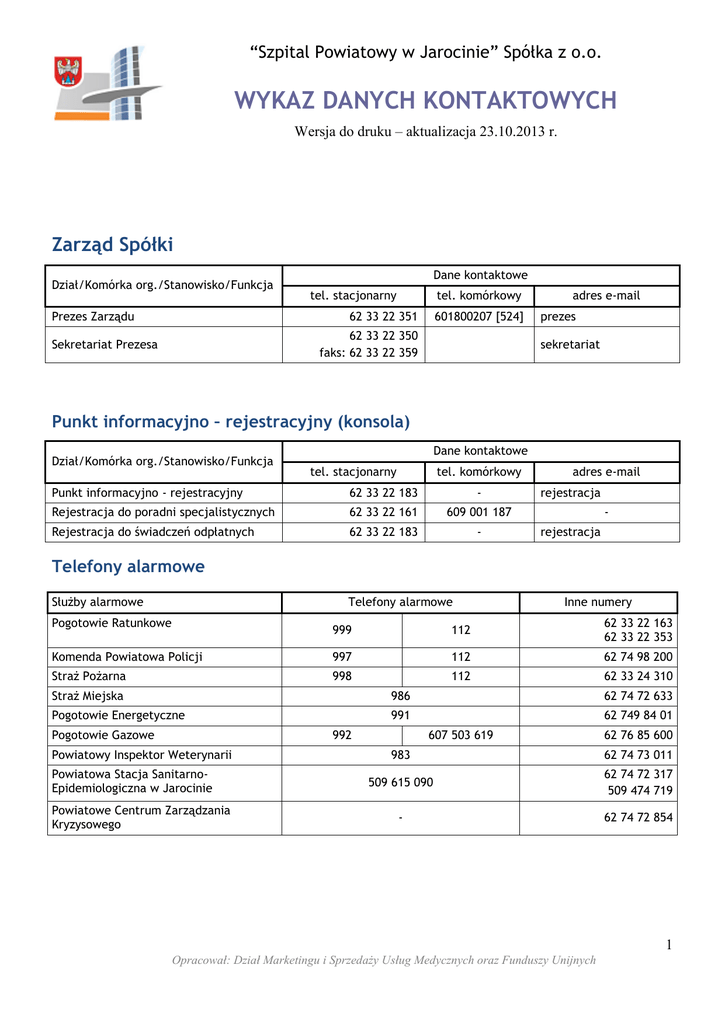 “Szpital Powiatowy w Jarocinie” Spółka z o.o. WYKAZ DANYCH KONTAKTOWYCH Wersja do druku – aktualizacja 23.10.2013 r. Zarząd Spółki Dział/Komórka org./Stanowisko/Funkcja Prezes Zarządu Dane kontaktowe tel. stacjonarny tel. komórkowy 62 33 22 351 601800207 [524] 62 33 22 350 faks: 62 33 22 359 Sekretariat Prezesa adres e-mail prezes sekretariat Punkt informacyjno – rejestracyjny (konsola) Dział/Komórka org./Stanowisko/Funkcja Dane kontaktowe tel. stacjonarny tel. komórkowy Punkt informacyjno - rejestracyjny 62 33 22 183 - Rejestracja do poradni specjalistycznych 62 33 22 161 609 001 187 Rejestracja do świadczeń odpłatnych 62 33 22 183 - adres e-mail rejestracja rejestracja Telefony alarmowe Służby alarmowe Telefony alarmowe Pogotowie Ratunkowe Inne numery 999 112 62 33 22 163 62 33 22 353 Komenda Powiatowa Policji 997 112 62 74 98 200 Straż Pożarna 998 112 62 33 24 310 Straż Miejska 986 62 74 72 633 Pogotowie Energetyczne 991 62 749 84 01 Pogotowie Gazowe 992 Powiatowy Inspektor Weterynarii Powiatowa Stacja SanitarnoEpidemiologiczna w Jarocinie Powiatowe Centrum Zarządzania Kryzysowego 607 503 619 62 76 85 600 983 62 74 73 011 509 615 090 62 74 72 317 509 474 719 - 62 74 72 854 1 Opracował: Dział Marketingu i Sprzedaży Usług Medycznych oraz Funduszy Unijnych “Szpital Powiatowy w Jarocinie” Spółka z o.o. WYKAZ DANYCH KONTAKTOWYCH Wersja do druku – aktualizacja 23.10.2013 r. Administracja Dział Księgowości Dział/Komórka org./Stanowisko/Funkcja Główna Księgowa Dane kontaktowe tel. stacjonarny 62 33 22 315 tel. komórkowy 603927016 [502] 62 33 22 207 tel./faks: 62 33 22 355 Kasa ksiegowosc kasa 62 33 22 205 62 33 22 187 Dział Księgowości adres e-mail wycena ksiegowosc3 Dział Współpracy z NFZ, Statystyki Medycznej i Archiwum Medycznego Dział/Komórka org./Stanowisko/Funkcja Dane kontaktowe tel. stacjonarny Kierownik Działu 62 33 22 301 Dział Statystyki Medycznej 62 33 22 212 Dział Rozliczeń 62 33 22 302 tel. komórkowy adres e-mail rozliczenia 603927708 [504] statystyka Dział Zarządzania Infrastrukturą Informatyczną Dział/Komórka org./Stanowisko/Funkcja Kierownik działu Dane kontaktowe tel. stacjonarny 62 33 22 317 tel. komórkowy 665 02 14 20 adres e-mail informatyk Dział Marketingu i Sprzedaży Usług Medycznych oraz Funduszy Unijnych Dział/Komórka org./Stanowisko/Funkcja Dane kontaktowe tel. stacjonarny tel. komórkowy adres e-mail Kierownik Działu 62 33 22 213 609 005 525 marketing Sekcja ds. Promocji i Rozwoju 62 33 22 211 885 555 041 [537] promocja Dział Organizacyjny, Kadr i Płac Dział/Komórka org./Stanowisko/Funkcja Dane kontaktowe tel. stacjonarny tel. komórkowy 603927709 [506] adres e-mail Kierownik Działu 62 33 22 318 kadry Sekcja ds. Kadr i Świadczeń Socjalnych 62 33 22 209 kadrybiuro Sekcja Płac 62 33 22 206 arleta.place goska.place ewa.place 2 Opracował: Dział Marketingu i Sprzedaży Usług Medycznych oraz Funduszy Unijnych “Szpital Powiatowy w Jarocinie” Spółka z o.o. WYKAZ DANYCH KONTAKTOWYCH Wersja do druku – aktualizacja 23.10.2013 r. Dział Techniczno-Gospodarczy Dział/Komórka org./Stanowisko/Funkcja Dane kontaktowe tel. stacjonarny tel. komórkowy Kierownik Działu 62 33 22 320 603927705 [503] Konserwator Urządzeń Technicznych 62 33 22 160 665021416 [520] Magazyn Gospodarczy 62 33 22 157 Ekipa Transportowa 62 33 22 114 Salowe 62 33 22 146 Kotłownia, Elektryk dyżurny 62 33 22 164 Pralnia, Szwalnia 62 33 22 156 adres e-mail emark 665021411 [518] Dział Zamówień Publicznych i Zaopatrzenia Dział/Komórka org./Stanowisko/Funkcja Dane kontaktowe tel. stacjonarny tel. komórkowy Kierownik Działu 62 33 22 321 605 781 790 [508] Sekcja Zaopatrzenia 62 33 22 321 691060595 [507] Sekcja Zamówień Publicznych 62 33 22 158 adres e-mail logistyka Stanowiska samodzielne Dział/Komórka org./Stanowisko/Funkcja Dane kontaktowe tel. stacjonarny tel. komórkowy adres e-mail Pełnomocnik ds. zarządzania jakością 62 33 22 189 pelnomocnik.ds.jakosci Specjalista ds. BHP P-POŻ i OC 62 33 22 152 bhp Ratownictwo Medyczne Dział/Komórka org./Stanowisko/Funkcja Dyspozytornia Medyczna Dane kontaktowe tel. stacjonarny 62 62 62 62 faks: 62 74 33 33 33 33 72 555 22 163 22 353 22 354 22 303 tel. komórkowy 665021422 [523] adres e-mail dyspozytor 3 Opracował: Dział Marketingu i Sprzedaży Usług Medycznych oraz Funduszy Unijnych “Szpital Powiatowy w Jarocinie” Spółka z o.o. WYKAZ DANYCH KONTAKTOWYCH Wersja do druku – aktualizacja 23.10.2013 r. Ratownictwo Medyczne – Zespoły Wyjazdowe Dane kontaktowe Dział/Komórka org./Stanowisko/Funkcja tel. stacjonarny Dyżurka Lekarska 62 33 22 150 Zespół „S” 62 33 22 159 Zespół „P” 62 33 22 185 tel. komórkowy adres e-mail Szpital Powiatowy w Jarocinie Dział/Komórka org./Stanowisko/Funkcja Punkt Informacyjno-Rejestracyjny Dane kontaktowe tel. stacjonarny tel. komórkowy tel./faks: 62 33 22 183 adres e-mail rejestracja Kierownik Medyczny 62 33 22 128 603927707 [501] kierownik.medyczny Zastępca Kierownika ds. pielęgniarek i średniego personelu medycznego 62 33 22 345 665021415 [519] epidemiologia Pełnomocnik ds. Praw Pacjenta, Specjalista ds. Epidemiologii Sekretariat Oddziału Chirurgicznego i Dziecięcego Koordynator Transplantacyjny Pełnomocnik ds. kombatantów 62 33 22 175 koordnyatortransplantacyjny 62 33 22 144 epidemiologia2 62 33 22 170 Sekretariat.oddzialy 62 33 22 175 501 623 019 koordnyatortransplantacyjny 62 33 22 302 Opieka Duszpasterska 692 730 357 Kostnica 62 33 22 162 Transport zwłok 62 747 29 52 601 869 111 Szpitalny Oddział Ratunkowy Dział/Komórka org./Stanowisko/Funkcja Dane kontaktowe tel. stacjonarny tel. komórkowy Kierownik 62 33 22 166 663901962 [513] Pielęgniarka Oddziałowa 62 33 22 165 663901971 [517] Sala Obserwacyjna 62 33 22 176 Sala Resuscytacyjna 62 33 22 178 adres e-mail ratownictwo 4 Opracował: Dział Marketingu i Sprzedaży Usług Medycznych oraz Funduszy Unijnych “Szpital Powiatowy w Jarocinie