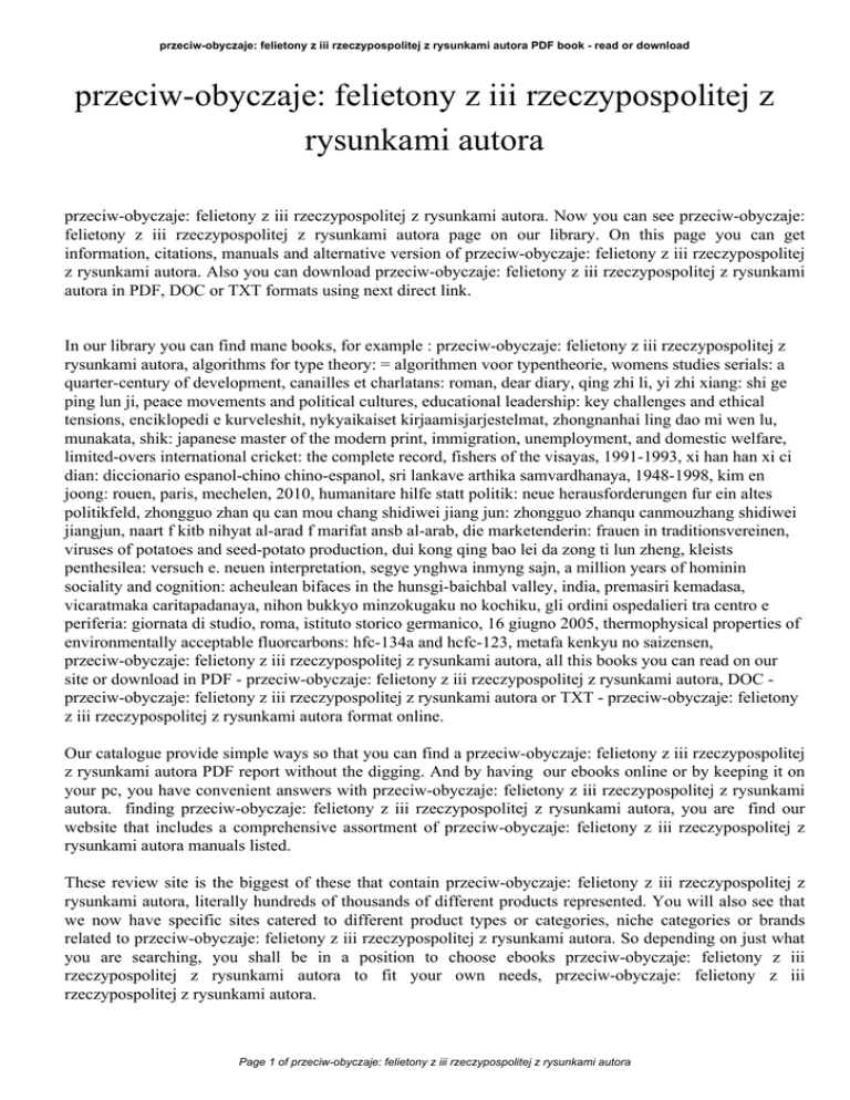 przeciw-obyczaje: felietony z iii rzeczypospolitej z rysunkami autora PDF book - read or download przeciw-obyczaje: felietony z iii rzeczypospolitej z rysunkami autora przeciw-obyczaje: felietony z iii rzeczypospolitej z rysunkami autora. Now you can see przeciw-obyczaje: felietony z iii rzeczypospolitej z rysunkami autora page on our library. On this page you can get information, citations, manuals and alternative version of przeciw-obyczaje: felietony z iii rzeczypospolitej z rysunkami autora. Also you can download przeciw-obyczaje: felietony z iii rzeczypospolitej z rysunkami autora in PDF, DOC or TXT formats using next direct link. In our library you can find mane books, for example : przeciw-obyczaje: felietony z iii rzeczypospolitej z rysunkami autora, algorithms for type theory: = algorithmen voor typentheorie, womens studies serials: a quarter-century of development, canailles et charlatans: roman, dear diary, qing zhi li, yi zhi xiang: shi ge ping lun ji, peace movements and political cultures, educational leadership: key challenges and ethical tensions, enciklopedi e kurveleshit, nykyaikaiset kirjaamisjarjestelmat, zhongnanhai ling dao mi wen lu, munakata, shik: japanese master of the modern print, immigration, unemployment, and domestic welfare, limited-overs international cricket: the complete record, fishers of the visayas, 1991-1993, xi han han xi ci dian: diccionario espanol-chino chino-espanol, sri lankave arthika samvardhanaya, 1948-1998, kim en joong: rouen, paris, mechelen, 2010, humanitare hilfe statt politik: neue herausforderungen fur ein altes politikfeld, zhongguo zhan qu can mou chang shidiwei jiang jun: zhongguo zhanqu canmouzhang shidiwei jiangjun, naart f kitb nihyat al-arad f marifat ansb al-arab, die marketenderin: frauen in traditionsvereinen, viruses of potatoes and seed-potato production, dui kong qing bao lei da zong ti lun zheng, kleists penthesilea: versuch e. neuen interpretation, segye ynghwa inmyng sajn, a million years of hominin sociality and cognition: acheulean bifaces in the hunsgi-baichbal valley, india, premasiri kemadasa, vicaratmaka caritapadanaya, nihon bukkyo minzokugaku no kochiku, gli ordini ospedalieri tra centro e periferia: giornata di studio, roma, istituto storico germanico, 16 giugno 2005, thermophysical properties of environmentally acceptable fluorcarbons: hfc-134a and hcfc-123, metafa kenkyu no saizensen, przeciw-obyczaje: felietony z iii rzeczypospolitej z rysunkami autora, all this books you can read on our site or download in PDF - przeciw-obyczaje: felietony z iii rzeczypospolitej z rysunkami autora, DOC przeciw-obyczaje: felietony z iii rzeczypospolitej z rysunkami autora or TXT - przeciw-obyczaje: felietony z iii rzeczypospolitej z rysunkami autora format online. Our catalogue provide simple ways so that you can find a przeciw-obyczaje: felietony z iii rzeczypospolitej z rysunkami autora PDF report without the digging. And by having our ebooks online or by keeping it on your pc, you have convenient answers with przeciw-obyczaje: felietony z iii rzeczypospolitej z rysunkami autora. finding przeciw-obyczaje: felietony z iii rzeczypospolitej z rysunkami autora, you are find our website that includes a comprehensive assortment of przeciw-obyczaje: felietony z iii rzeczypospolitej z rysunkami autora manuals listed. These review site is the biggest of these that contain przeciw-obyczaje: felietony z iii rzeczypospolitej z rysunkami autora, literally hundreds of thousands of different products represented. You will also see that we now have specific sites catered to different product types or categories, niche categories or brands related to przeciw-obyczaje: felietony z iii rzeczypospolitej z rysunkami autora. So depending on just what you are searching, you shall be in a position to choose ebooks przeciw-obyczaje: felietony z iii rzeczypospolitej z rysunkami autora to fit your own needs, przeciw-obyczaje: felietony z iii rzeczypospolitej z rysunkami autora. Page 1 of przeciw-obyczaje: felietony z iii rzeczypospolitej z rysunkami autora