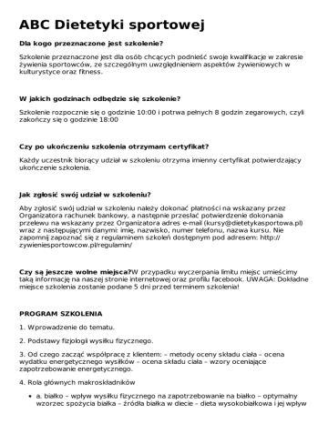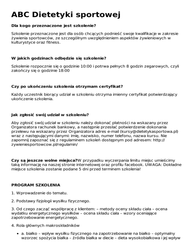 ABC Dietetyki sportowej Dla kogo przeznaczone jest szkolenie? Szkolenie przeznaczone jest dla osób chcących podnieść swoje kwalifikacje w zakresie żywienia sportowców, ze szczególnym uwzględnieniem aspektów żywieniowych w kulturystyce oraz fitness. W jakich godzinach odbędzie się szkolenie? Szkolenie rozpocznie się o godzinie 10:00 i potrwa pełnych 8 godzin zegarowych, czyli zakończy się o godzinie 18:00 Czy po ukończeniu szkolenia otrzymam certyfikat? Każdy uczestnik biorący udział w szkoleniu otrzyma imienny certyfikat potwierdzający ukończenie szkolenia. Jak zgłosić swój udział w szkoleniu? Aby zgłosić swój udział w szkoleniu należy dokonać płatności na wskazany przez Organizatora rachunek bankowy, a następnie przesłać potwierdzenie dokonania przelewu na wskazany przez Organizatora adres e-mail ([email protected]) wraz z następującymi danymi: imię, nazwisko, numer telefonu, nazwa kursu. Nie zapomnij zapoznać się z regulaminem szkoleń dostępnym pod adresem: http:// zywieniesportowcow.pl/regulamin/ Czy są jeszcze wolne miejsca?W przypadku wyczerpania limitu miejsc umieścimy taką informację na naszej stronie internetowej oraz profilu facebook. UWAGA: Dokładne miejsce szkolenia zostanie podane 5 dni przed terminem szkolenia! PROGRAM SZKOLENIA 1. Wprowadzenie do tematu. 2. Podstawy fizjologii wysiłku fizycznego. 3. Od czego zacząć współpracę z klientem: – metody oceny składu ciała – ocena wydatku energetycznego wysiłków – ocena składu ciała – wzory oceniające zapotrzebowanie energetycznego. 4. Rola głównych makroskładników a. białko – wpływ wysiłku fizycznego na zapotrzebowanie na białko – optymalny wzorzec spożycia białka – źródła białka w diecie – dieta wysokobiałkowa i jej wpływ na zdrowie b. tłuszcz – dieta wysokotłuszczowa w sporcie – zapotrzebowanie c. węglowodany – rola w procesie regeneracji powysiłkowej – zapotrzebowanie podczas wysiłków. 5. Nawodnienie a wysiłek fizyczny. 6. Mikroskładniki: witaminy, składniki mineralne, antyoksydanty – czy sportowiec potrzebuje ich więcej? – potencjalne ryzyko związane z nadmierną suplementacją mikroskładników 7. Suplementacja (podział, przeznaczenie, zastosowanie wybranych suplementów): a. odżywki białkowe (koncentraty, izolaty, hydrolizaty) b. odżywki węglowodanowe (typu carbo, Vitargo, żele i batony energetyczne) c. odżywki węglowodanowo-białkowe (tzw. gainery) d. napoje sportowe e. BCAA, l-glutamina f. suplementy wpływające na redukcję masy ciała g. suplementy a układ kostno-stawowy h. wybrane suplementy o potencjale ergogenicznym i. wybrane suplementy o potencjale zdrowotnym 8. Dyskusja (m.in. dieta bezglutenowa w sporcie, dieta paleo w sporcie) OSOBY PROWADZĄCE SZKOLENIE Łukasz Jaśkiewicz Dietetyk sportowy współpracujący z zawodnikami wielu dyscyplin sportowych z akcentem na sporty wytrzymałościowe. Inicjator działań PTDS. Na co dzień aktywny sportowiec i doświadczony szkoleniowiec, umiejętnie łączący współczesne podejście naukowe z praktyką. Bartłomiej Pomorski Dietetyk sportowy, prezes i współzałożyciel Polskiego Towarzystwa Dietetyki Sportowej. Członek organizacji Professionals in Nutrition for Exercise and Sport (PINES) zrzeszającej dietetyków sportowych z całego świata oraz członek towarzystwa The International Society of Exercise and Immunology (ISEI), organizacji skupiającej osoby zainteresowane tematyką immunologii wysiłku fizycznego. Na co dzień zajmuję się przygotowaniem planów żywieniowych oraz suplementacyjnych dla sportowców różnych dyscyplin sportowych. Link do wydarzenia: http://bonavita.pl/kalendarz/lw/abc-dietetyki-sportowej-3