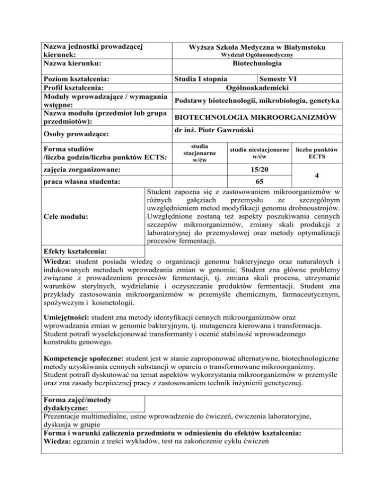 Nazwa jednostki prowadzącej kierunek: Nazwa kierunku: Wyższa Szkoła Medyczna w Białymstoku Wydział Ogólnomedyczny Biotechnologia Poziom kształcenia: Studia I stopnia Semestr VI Profil kształcenia: Ogólnoakademicki Moduły wprowadzające / wymagania Podstawy biotechnologii, mikrobiologia, genetyka wstępne: Nazwa modułu (przedmiot lub grupa BIOTECHNOLOGIA MIKROORGANIZMÓW przedmiotów): dr inż. Piotr Gawroński Osoby prowadzące: Forma studiów /liczba godzin/liczba punktów ECTS: zajęcia zorganizowane: praca własna studenta: Cele modułu: studia stacjonarne w/ćw studia niestacjonarne w/ćw liczba punktów ECTS 15/20 4 65 Student zapozna się z zastosowaniem mikroorganizmów w różnych gałęziach przemysłu ze szczególnym uwzględnieniem metod modyfikacji genomu drobnoustrojów. Uwzględnione zostaną też aspekty poszukiwania cennych szczepów mikroorganizmów, zmiany skali produkcji z laboratoryjnej do przemysłowej oraz metody optymalizacji procesów fermentacji. Efekty kształcenia: Wiedza: student posiada wiedzę o organizacji genomu bakteryjnego oraz naturalnych i indukowanych metodach wprowadzania zmian w genomie. Student zna główne problemy związane z prowadzeniem procesów fermentacji, tj. zmiana skali procesu, utrzymanie warunków sterylnych, wydzielanie i oczyszczanie produktów fermentacji. Student zna przykłady zastosowania mikroorganizmów w przemyśle chemicznym, farmaceutycznym, spożywczym i kosmetologii. Umiejętności: student zna metody identyfikacji cennych mikroorganizmów oraz wprowadzania zmian w genomie bakteryjnym, tj. mutageneza kierowana i transformacja. Student potrafi wyselekcjonować transformanty i ocenić stabilność wprowadzonego konstruktu genowego. Kompetencje społeczne: student jest w stanie zaproponować alternatywne, biotechnologiczne metody uzyskiwania cennych substancji w oparciu o transformowane mikroorganizmy. Student potrafi dyskutować na temat aspektów wykorzystania mikroorganizmów w przemyśle oraz zna zasady bezpiecznej pracy z zastosowaniem technik inżynierii genetycznej. Forma zajęć/metody dydaktyczne: Prezentacje multimedialne, ustne wprowadzenie do ćwiczeń, ćwiczenia laboratoryjne, dyskusja w grupie Forma i warunki zaliczenia przedmiotu w odniesieniu do efektów kształcenia: Wiedza: egzamin z treści wykładów, test na zakończenie cyklu ćwiczeń Umiejętności: wykonywanie doświadczeń na ćwiczeniach, dyskusja w grupie, prawidłowe przeprowadzenie analizy restrykcyjnej plazmidu i interpretacja wyników (elektroforegram), prawidłowe przeprowadzenie reakcji PCR i interpretacja wyników Kompetencje: umiejętność współpracy ze zwróceniem uwagi na właściwy podział obowiązków, rzeczowa dyskusja i zdolność wyciągania wniosków, umiejętność prezentacji wyników w sposób zrozumiały dla grupy Treści programowe: Wykłady: studia niestacjonarne 1. 2. 3. 4. 5. 6. 7. Genom bakteryjny: struktura, organizacja i ekspresja genów. (2h) Legislacja i bezpieczeństwo pracy z zastosowaniem technik inżynierii genetycznej. (2h) Rodzaje wektorów umożliwiających ekspresję informacji genetycznej w bakteriach. (2h) Horyzontalny transfer genów: koniugacja, transformacja i transdukcja. (2h) Znaczenie bakteriofagów w medycynie i przemyśle farmaceutycznym. (2h) Wytwarzanie białek ludzkich przez bakterie oraz produkcja szczepionek i antybiotyków. (2h) Mikroorganizmy pomocne w ochronie środowiska. Broń bakteriologiczna i jej dezaktywacja. (2h) 8. Źródła i przechowywanie cennych szczepów mikroorganizmów. (1h) Ćwiczenia: studia niestacjonarne 1. 2. 3. 4. 5. Identyfikacja mikroorganizmów: techniki Southern Blot i PCR. (3h) Budowa konstruktu genowego do transformacji mikroorganizmów. (3h) Techniki wprowadzania materiału genetycznego do komórek drobnoustrojów. (3h) Techniki selekcji transformantów i określanie wydajności trasnformacji. (3h) Pozyskiwanie szczepów mikroorganizmów o potencjalnym zastosowaniu przemysłowym. (3h) 6. Wykorzystanie mikroorganizmów i ich metabolitów we współczesnej kosmetologii. (3h) 7. Przemysłowa produkcja etanolu i kwasu cytrynowego. Test. (2h) Literatura podstawowa: 1. Salyers A.A., Witt D.D., tłum. pod red. Z. Markiewicza: Mikrobiologia. Różnorodność, chorobotwórczość i środowisko 2. red. Baj J., i Markiewicz Z.: Biologia molekularna bakterii Wyd. PWN 2006; 3. Nicklin J. Graeme-Cook K., Killington R., tłum. pod red. Z. Markiewicza: Mikrobiologia, Krótkie wykłady Wyd. PWN 2006 4. Łabużek S., Necklen D., Radziejewska-Lebrecht J.: Biotechnologia mikroorganizmów: wybrane zagadnienia. Wyd. Uniwersytet Śląski, Katowice 2002 Literatura uzupełniająca: 1. red. Z. Libudzisz, K. Kowal, Z. Żakowska: Mikrobiologia techniczna, (t. 1) Mikroorganizmy i środowiska ich występowania Wyd. PWN 2007.
