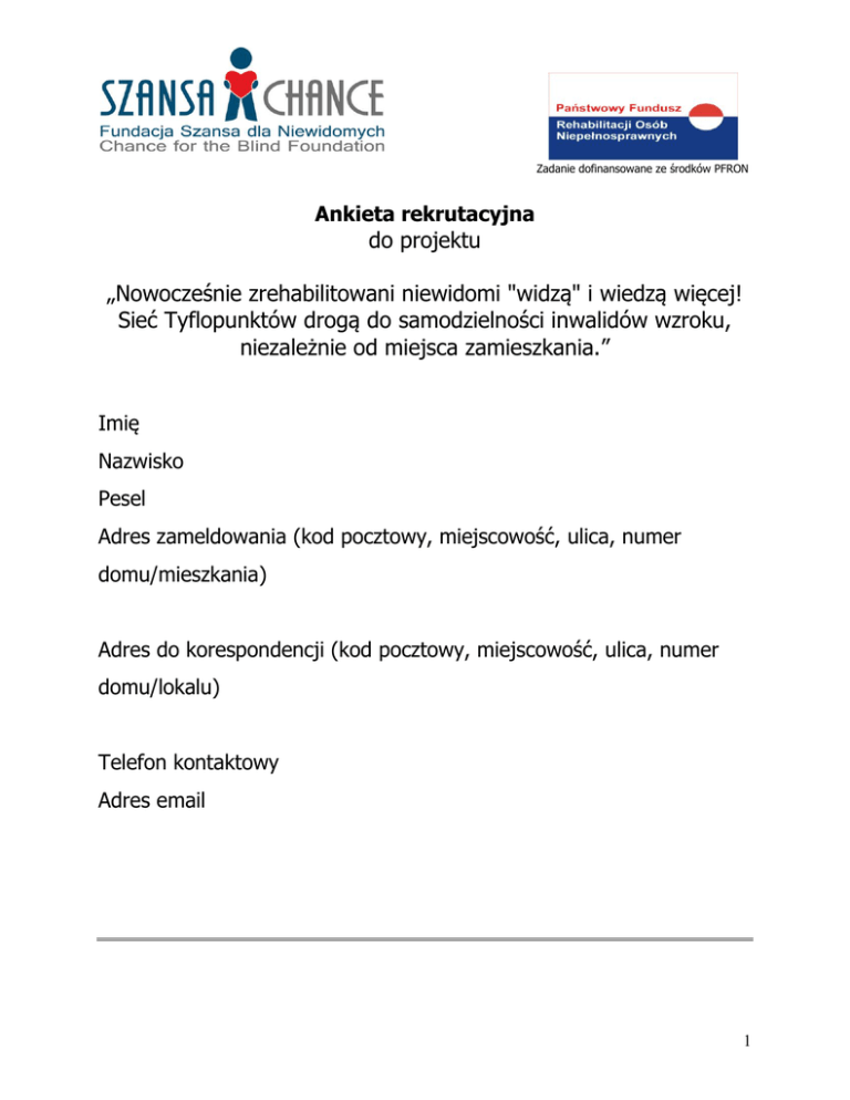 Zadanie dofinansowane ze środków PFRON Ankieta rekrutacyjna do projektu „Nowocześnie zrehabilitowani niewidomi "widzą" i wiedzą więcej! Sieć Tyflopunktów drogą do samodzielności inwalidów wzroku, niezależnie od miejsca zamieszkania.” Imię Nazwisko Pesel Adres zameldowania (kod pocztowy, miejscowość, ulica, numer domu/mieszkania) Adres do korespondencji (kod pocztowy, miejscowość, ulica, numer domu/lokalu) Telefon kontaktowy Adres email 1 Płeć: Kobieta Mężczyzna Stopień niepełnosprawnoś ci Lekki Umiarkowany Znaczny Podstawowe Gimnazjalne Wykształcenie: Niepełne podstawowe Wyższe Zawodowe Zatrudnienie: Średnie Policealne Nieaktywny/a Poszukujący/a zawodowo pracy niezatrudniony/a Poszukujący/a pracy zatrudniony/a Zatrudniony/a Zatrudniony/a w w ZPCH 2) ZAZ 1) Zatrudniony/a na otwartym rynku pracy Bezrobotny/a Rejestracja w PUP 3): Uczestnictwo w WTZ 4): Zarejestrowany Niezarejestrowany Nie uczestniczył/a Absolwent Zamieszkanie: Miasto do 20 tyś. mieszkańców Miasto od 50 do 100 tyś. mieszkańców Uczestnik Miasto od 20 do 50 tyś. mieszkańców Wieś Miasto powyżej 100 tyś. mieszkańców 1) Zakład Aktywności Zawodowej 2) Zakład Pracy Chronionej 3) Powiatowy Urząd Pracy 4) Warsztaty Terapii Zajęciowej 2 I Ocena stopnia samodzielności i zrehabilitowania 1. Czy uważasz siebie za osobę samodzielną: Tak, jestem w pełni samodzielny Z pomocy innych korzystam tylko sporadycznie lub w wyjątkowych sytuacjach Nie, potrzebuję pomocy innych przy wykonywaniu większości czynności dnia codziennego 2. Jak oceniasz swój poziom zrehabilitowania: Wysoki Średni Niski II Ocena stopnia motywacji 1. Czy jesteś zadowolony ze swojego poziomu samodzielności? Tak, jestem w pełni zadowolony Raczej tak, ale chcę być bardziej samodzielny Nie 2. Jakie masz oczekiwania wobec siebie (możesz wybrać kilka) Chcę rozwijać swoje pasje Chcę się kształcić Chcę opanować proste czynności dnia codziennego Chcę się samodzielnie poruszać Chcę poznać nowoczesne techniki rehabilitacji Chcę poszerzyć wiedzę i umiejętności korzystania ze specjalistycznego sprzętu tyfloinformatycznego 3 Chcę dobrze znać prawa przysługujące osobom z dysfunkcją wzroku i korzystać z nich zgodnie z obowiązującym prawem Inne wymień jakie Nie mam żadnych oczekiwań Informacje dodatkowe: Proszę zaznaczyćmoduły którymi są Państwo najbardziej zainteresowani: Świat dotyku i dźwięku Dom Kuchnia Zdrowie TYFLOSport TYFLOInformatyka TYFLOEdukacja Niewidomy poliglota Mobilność Uprawnienia Kultura Hobby TYFLOTurystyka Autoprezentacja Nowoczesne technologie Motywacja 4