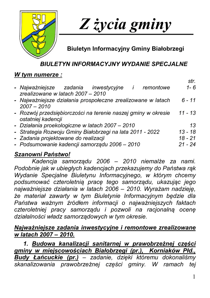 Z życia gminy Biuletyn Informacyjny Gminy Białobrzegi BIULETYN INFORMACYJNY WYDANIE SPECJALNE W tym numerze : - Najważniejsze zadania inwestycyjne i remontowe zrealizowane w latach 2007 – 2010 - Najważniejsze działania prospołeczne zrealizowane w latach 2007 – 2010 - Rozwój przedsiębiorczości na terenie naszej gminy w okresie ostatniej kadencji - Działania proekologiczne w latach 2007 – 2010 - Strategia Rozwoju Gminy Białobrzegi na lata 2011 - 2022 - Zadania projektowane do realizacji - Podsumowanie kadencji samorządu 2006 – 2010 str. 1- 6 6 - 11 11 - 13 13 13 - 18 18 - 21 21 - 24 Szanowni Państwo! Kadencja samorządu 2006 – 2010 niemalże za nami. Podobnie jak w ubiegłych kadencjach przekazujemy do Państwa rąk Wydanie Specjalne Biuletynu Informacyjnego, w którym chcemy podsumować czteroletnią pracę tego samorządu, ukazując jego najważniejsze działania w latach 2006 – 2010. Wyrażam nadzieję, że materiał zawarty w tym Biuletynie Informacyjnym będzie dla Państwa ważnym źródłem informacji o najważniejszych faktach czteroletniej pracy samorządu i pozwoli na racjonalną ocenę działalności władz samorządowych w tym okresie. Najważniejsze zadania inwestycyjne i remontowe zrealizowane w latach 2007 – 2010. 1. Budowa kanalizacji sanitarnej w prawobrzeżnej części gminy w miejscowościach Białobrzegi (pr.), Korniaków Płd., Budy Łańcuckie (pr.) – zadanie, dzięki któremu dokonaliśmy skanalizowania prawobrzeżnej części gminy. W ramach tej 1 inwestycji wykonaliśmy 44 km sieci kanalizacyjnej, 24 przepompownie. Wydaliśmy na ten cel kwotę 5 340 000 zł. Zadanie było współfinansowane ze środków Unii Europejskiej. 2. Wykonanie projektu technicznego wraz z uzyskaniem pozwolenia na budowę oraz rozpoczęcie budowy kanalizacji w lewobrzeżnej części gminy w miejscowościach Białobrzegi (l.), Korniaków Płn., Budy Łańcuckie (l.) – to największe zadanie w historii samorządu, którego realizację rozpoczęliśmy latem 2010 r. Wykonanych zostanie ok. 84 km sieci kanalizacyjnej oraz 24 przepompownie. Całkowity koszt tego zadania to kwota 9 335 000 zł. Zadanie dofinansowane jest ze środków Unii Europejskiej. Od początku realizacji tej inwestycji do końca 2010 r. wydamy na ten cel kwotę 2 100 000 zł. Zadanie to nie było planowane do rozpoczęcia w tej kadencji, ale ze względu na pozyskane środki unijne rozpoczynamy jego realizację o rok wcześniej niż pierwotnie planowaliśmy. 3. Budowa mostu przez rzekę Wisłok w ciągu drogi powiatowej nr 1516 R Korniaków Północny – Budy Łańcuckie wraz z dojazdami. Inwestorem na tym zadaniu był Powiat Łańcucki. To największa inwestycja drogowa na terenie naszej gminy. W ciągu kilkunastu miesięcy, a więc jak na nasze polskie warunki w ekspresowym tempie powstał żelbetowy most o długości 113,57 m wraz z dojazdami. Całkowity koszt budowy mostu to kwota 11 853 296 zł. Środki Powiatu Łańcuckiego to kwota 622 296 zł, środki budżetu Gminy Białobrzegi to kwota 1 125 000 zł, zaś reszta kwoty 10 106 000 zł to środki pochodzące z budżetu państwa. Tak, więc na teren naszej gminy trafiły ogromne, największe w naszej historii środki pomocowe na inwestycję drogową. Oprócz środków na budowę tego mostu wydatkowaliśmy na remonty dróg powiatowych, jako pomoc dla Powiatu Łańcuckiego, zarządcy tych dróg kwotę 742 000 zł. 4. Remonty dróg gminnych W tej kadencji samorządu wykonaliśmy 16,3 km nowych nawierzchni asfaltowych na drogach będących naszą własnością. Tak, więc przekroczyliśmy znacznie nasz plan na tą kadencję, gdyż zamierzaliśmy wykonać 9 km nowych nawierzchni asfaltowych. 2 Możliwe to było dzięki pozyskaniu środków pomocowych na budowę dróg oraz dobrej sytuacji finansowej naszej gminy. Oprócz tego finansowaliśmy zakup kamienia, arszy, wykonanie przepustów, koszenie poboczy, odśnieżanie, wykonanie parkingów publicznych. Wykonaliśmy nawierzchnie asfaltowe na parkingu publicznym w Białobrzegach pr., Woli Dalszej, Budach Łańcuckich pr., Białobrzegach l., Korniaktowie Płd. Razem w tej kadencji na drogi gminne wydaliśmy kwotę 4 522 000 zł. 5. Budowa chodników Zgodnie z naszym Programem „Bezpieczna Gmina” zamierzaliśmy w tej kadencji wykonać ok. 10 km chodników, w każdej miejscowości naszej gminy, przy drogach powiatowych w miejscach największego ruchu pieszych i samochodów. Naszym celem było także połączenie różnych instytucji w ramach tworzenia tzw. centrów wsi, stąd też budowa chodników w okolicach szkół, domów kultury, kościołów. W okresie ostatnich 4 lat zostało wybudowanych na terenie naszej gminy 13 km chodników. Tak, więc także tutaj przekroczyliśmy nasze zamierzenia na tą kadencję. Możliwe to było, podobnie jak w przypadku dróg dzięki dofinansowaniu budowy chodnika w Woli Dalszej ze środków pomocowych oraz przeznaczeniu przez Radę Gminy znacznie większych środków na te cele niż pierwotnie planowaliśmy. Budowa chodników wzdłuż dróg powiatowych to zadanie powiatu, stąd też tą inwestycję realizowaliśmy wspólnie, finansując z budżetu gminy 75% kosztów, natomiast Powiat Łańcucki finansował 25 % kosztów. Na budowę chodników przeznaczyliśmy w tej kadencji z budżetu gminy kwotę 2 700 000 zł. Budując chodniki wymieniliśmy 28 przystanków zmieniając tzw. „budy” na estetyczne przystanki. Wydaliśmy na ten cel kwotę 150 000 zł. 6. Wykonanie elewacji na budynkach użyteczności publicznej. W ramach działań zmierzających do poprawy estetyki, funkcjonalności budynków i ich otoczenia oraz wizerunku gminy wykonaliśmy nowe elewacje na następujących budynkach będących naszą własnością: 3 1. 2. 3. 4. 5. 6. 7. 8. 9. 10. 11. 12. 13. 14. Szkoła Podstawowa Nr 1 w Białobrzegach Szkoła Podstawowa Nr 1 w Korniaktowie Południowym Szkoła Podstawowa Nr 2 w Korniaktowie Północnym Szkoła Podstawowa Nr 2 w Budach Łańcuckich Publiczne