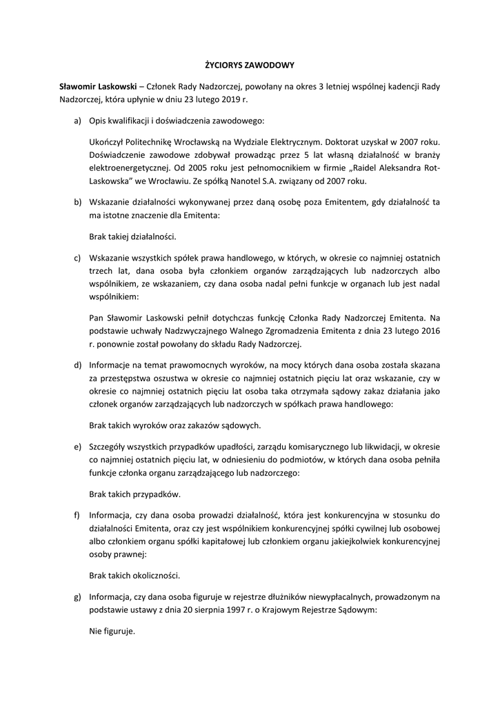 ŻYCIORYS ZAWODOWY Sławomir Laskowski – Członek Rady Nadzorczej, powołany na okres 3 letniej wspólnej kadencji Rady Nadzorczej, która upłynie w dniu 23 lutego 2019 r. a) Opis kwalifikacji i doświadczenia zawodowego: Ukończył Politechnikę Wrocławską na Wydziale Elektrycznym. Doktorat uzyskał w 2007 roku. Doświadczenie zawodowe zdobywał prowadząc przez 5 lat własną działalność w branży elektroenergetycznej. Od 2005 roku jest pełnomocnikiem w firmie „Raidel Aleksandra RotLaskowska” we Wrocławiu. Ze spółką Nanotel S.A. związany od 2007 roku. b) Wskazanie działalności wykonywanej przez daną osobę poza Emitentem, gdy działalność ta ma istotne znaczenie dla Emitenta: Brak takiej działalności. c) Wskazanie wszystkich spółek prawa handlowego, w których, w okresie co najmniej ostatnich trzech lat, dana osoba była członkiem organów zarządzających lub nadzorczych albo wspólnikiem, ze wskazaniem, czy dana osoba nadal pełni funkcje w organach lub jest nadal wspólnikiem: Pan Sławomir Laskowski pełnił dotychczas funkcję Członka Rady Nadzorczej Emitenta. Na podstawie uchwały Nadzwyczajnego Walnego Zgromadzenia Emitenta z dnia 23 lutego 2016 r. ponownie został powołany do składu Rady Nadzorczej. d) Informacje na temat prawomocnych wyroków, na mocy których dana osoba została skazana za przestępstwa oszustwa w okresie co najmniej ostatnich pięciu lat oraz wskazanie, czy w okresie co najmniej ostatnich pięciu lat osoba taka otrzymała sądowy zakaz działania jako członek organów zarządzających lub nadzorczych w spółkach prawa handlowego: Brak takich wyroków oraz zakazów sądowych. e) Szczegóły wszystkich przypadków upadłości, zarządu komisarycznego lub likwidacji, w okresie co najmniej ostatnich pięciu lat, w odniesieniu do podmiotów, w których dana osoba pełniła funkcje członka organu zarządzającego lub nadzorczego: Brak takich przypadków. f) Informacja, czy dana osoba prowadzi działalność, która jest konkurencyjna w stosunku do działalności Emitenta, oraz czy jest wspólnikiem konkurencyjnej spółki cywilnej lub osobowej albo członkiem organu spółki kapitałowej lub członkiem organu jakiejkolwiek konkurencyjnej osoby prawnej: Brak takich okoliczności. g) Informacja, czy dana osoba figuruje w rejestrze dłużników niewypłacalnych, prowadzonym na podstawie ustawy z dnia 20 sierpnia 1997 r. o Krajowym Rejestrze Sądowym: Nie figuruje. SPORZĄDZONO: DNIA 24 LUTEGO 2016 R.