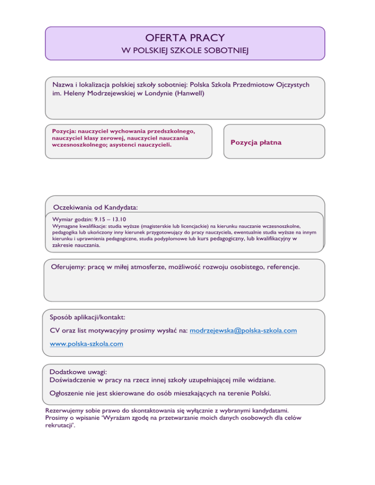 OFERTA PRACY W POLSKIEJ SZKOLE SOBOTNIEJ Nazwa i lokalizacja polskiej szkoły sobotniej: Polska Szkola Przedmiotow Ojczystych im. Heleny Modrzejewskiej w Londynie (Hanwell) Pozycja: nauczyciel wychowania przedszkolnego, nauczyciel klasy zerowej, nauczyciel nauczania wczesnoszkolnego; asystenci nauczycieli. Pozycja płatna Oczekiwania od Kandydata: Wymiar godzin: 9.15 – 13.10 Praca od (data): Wymagane kwalifikacje: studia wyższe (magisterskie lub licencjackie) na kierunku nauczanie wczesnoszkolne, pedagogika lub ukończony inny kierunek przygotowujący do pracy nauczyciela, ewentualnie studia wyższe na innym kierunku i uprawnienia pedagogiczne, studia podyplomowe lub kurs pedagogiczny, lub kwalifikacyjny w zakresie nauczania. Oferujemy: pracę w miłej atmosferze, możliwość rozwoju osobistego, referencje. Sposób aplikacji/kontakt: CV oraz list motywacyjny prosimy wysłać na: [email protected] www.polska-szkola.com 07849831135 Dodatkowe uwagi: Doświadczenie w pracy na rzecz innej szkoły uzupełniającej mile widziane. Ogłoszenie nie jest skierowane do osób mieszkających na terenie Polski. Rezerwujemy sobie prawo do skontaktowania się wyłącznie z wybranymi kandydatami. Prosimy o wpisanie ‘Wyrażam zgodę na przetwarzanie moich danych osobowych dla celów rekrutacji’.