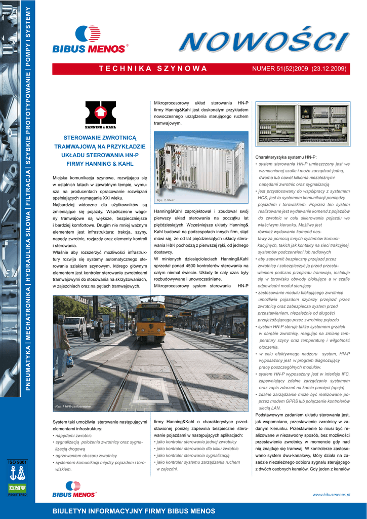 TECHNIKA SZYNOWA Mikroprocesorowy układ NUMER 51(52)2009 (23.12.2009) sterowania HN-P firmy Hannig&Kahl jest doskonałym przykładem nowoczesnego urządzenia sterującego ruchem tramwajowym. STEROWANIE ZWROTNICĄ TRAMWAJOWĄ NA PRZYKŁADZIE UKŁADU STEROWANIA HN-P Charakterystyka systemu HN-P: FIRMY HANNING & KAHL • system sterowania HN-P umieszczony jest we wzmocnionej szafie i może zarządzać jedną, dwoma lub nawet kilkoma niezależnymi Miejska komunikacja szynowa, rozwijająca się napędami zwrotnic oraz sygnalizacją w ostatnich latach w zawrotnym tempie, wymu- • jest przystosowany do współpracy z systemem sza na producentach opracowanie rozwiązań spełniających wymagania XXI wieku. Najbardziej widoczne dla użytkowników są HCS, jest to systemem komunikacji pomiędzy Rys. 2 HN-P pojazdem i torowiskiem. Poprzez ten system zmieniające się pojazdy. Współczesne wago- Hanning&Kahl zaprojektował i zbudował swój realizowane jest wydawanie komend z pojazdów ny tramwajowe są większe, bezpieczniejsze pierwszy układ sterowania na początku lat do zwrotnic w celu skierowania pojazdu we i bardziej komfortowe. Drugim nie mniej ważnym pięćdziesiątych. Wcześniejsze układy Hanning& właściwym kierunku. Możliwe jest elementem jest infrastruktura: trakcja, szyny, Kahl budował na podzespołach innych firm, stąd również wydawanie komend nas- napędy zwrotnic, rozjazdy oraz elementy kontroli mówi się, że od lat pięćdziesiątych układy stero- tawy za pomocą innych systemów komuni- i sterowania. wania H&K pochodzą z pierwszej ręki, od jednego kacyjnych, takich jak kontakty na sieci trakcyjnej, Właśnie aby rozszerzyć możliwości infrastruk- dostawcy. tury rozwija się systemy automatycznego ste- W minionych dziesięcioleciach Hanning&Kahl rowania szlakiem szynowym, którego głównym sprzedał ponad 4500 kontrolerów sterowania na zwrotnicę i zabezpieczyć ją przed przesta- elementem jest kontroler sterowania zwrotnicami całym niemal świecie. Układy te cały czas były wieniem podczas przejazdu tramwaju, instaluje tramwajowymi do stosowania na skrzyżowaniach, rozbudowywane i unowocześniane. się w torowisku obwody blokujące a w szafie w zajezdniach oraz na pętlach tramwajowych. Mikroprocesorowy system sterowania systemów podczerwieni lub radiowych HN-P • aby zapewnić bezpieczny przejazd przez odpowiedni moduł sterujący • zastosowanie modułu blokującego zwrotnicę umożliwia pojazdom szybszy przejazd przez zwrotnicę oraz zabezpiecza system przed przestawieniem, niezależnie od długości przejeżdżającego przez zwrotnicę pojazdu • system HN-P steruje także systemem grzałek w obrębie zwrotnicy, reagując na zmianę temperatury szyny oraz temperaturę i wilgotność otoczenia. • w celu efektywnego nadzoru system, HN-P wyposażony jest w program diagnozujący pracę poszczególnych modułów. • system HN-P wyposażony jest w interfejs IFC, zapewniający zdalne zarządzanie systemem oraz zapis zdarzeń na karcie pamięci (opcja) • zdalne zarządzanie może być realizowane poprzez modem GPRS lub połączenie kontrolerów Rys. 1 HFK-zastosowanie siecią LAN. Podstawowym zadaniem układu sterowania jest, System taki umożliwia sterowanie następującymi firmy Hanning&Kahl o charakterystyce przed- jak wspomniano, przestawienie zwrotnicy w za- elementami infrastruktury: stawionej poniżej zapewnia bezpieczne stero- danym kierunku. Przestawienie to musi być re- • napędami zwrotnic wanie pojazdami w następujących aplikacjach: alizowane w niezawodny sposób, bez możliwości • sygnalizacją położenia zwrotnicy oraz sygna- • jako kontroler sterowania jednej zwrotnicy przestawienia zwrotnicy w momencie gdy nad • jako kontroler sterowania dla kilku zwrotnic nią znajduje się tramwaj. W kontrolerze zastoso- • ogrzewaniem obszaru zwrotnicy • jako kontroler sterowania sygnalizacją wano system dwu-kanałowy, który działa na za- • systemem komunikacji między pojazdem i toro- • jako kontroler systemu zarządzania ruchem sadzie niezależnego odbioru sygnału sterującego lizacją drogową wiskiem. w zajezdni. z dwóch osobnych kanałów. Gdy jeden z kanałów z jakichkolwiek powodów przekaże inną infor- sterującego kontrolera, posiada swój niezależny mację niż drugi, cały system wyłączy się, system bezpiecznikowy, osobno dla każdego wskazując stan awarii. elementu grzewczego. Wszystkie operacje reali- Za pasywne wykrywanie tramwaju w rejonie roz- zowane przez kontroler mogą być zapisywane na jazdu oraz zablokowanie systemu w momencie karcie pamięci w rejestratorze zdarzeń. Uzyskanie gdy jest on w rejonie zwrotnicy odpowiadają sys- odpowiednich informacji zależy od sposobu temy blokad torowych. Hanning&Kahl stosuje dwa podłączenia różnych elementów systemu, które systemy wykrywania. System działający na za- chcielibyśmy monitorować. sadzie zwarcia osiowego (tzw HFK) wykrywający pojazd w obszarze odizolowanego odcinka torów, poprzez zmianę rezystancji w momencie poja- Sterowniki te można wykorzystać nie tylko do sterowania pojedynczą zwrotnicą. Coraz częściej Rys. 5 HFP-układ detekcji zwarcia osiowego stosuje się je do sterowania grupą zwrotnic wienia się w tym obszarze pojazdu szynowego. tramwajowych, zarówno na skrzyżowaniach, jak Innym rozwiązaniem jest system stanowiący i w specjalnych układach komunikacyjnych jak kombinację dwóch wcześniej przedstawionych zwężenia z dwóch do jednego toru lub w zajezd- (tzw. HSK). Przejeżdżający pojazd zwiera poprzez niach. Na uwagę zasługuje fakt, że rozwiązania osie dwie szyny, co generuje sygnał zajętości te nie wymagają prostego mnożenia modułów zwrotnicy. Do utrzymania tego sygnału nie jest w kontrolerze. Optymalizację systemów uzyskuje wymagane ciągłe zwarcie osiowe, lecz wystarczy się przez wykorzystanie ich wewnętrznej architek- tłumienie układu rezonansowego spowodowane tury. Kontrolery pozwalają 