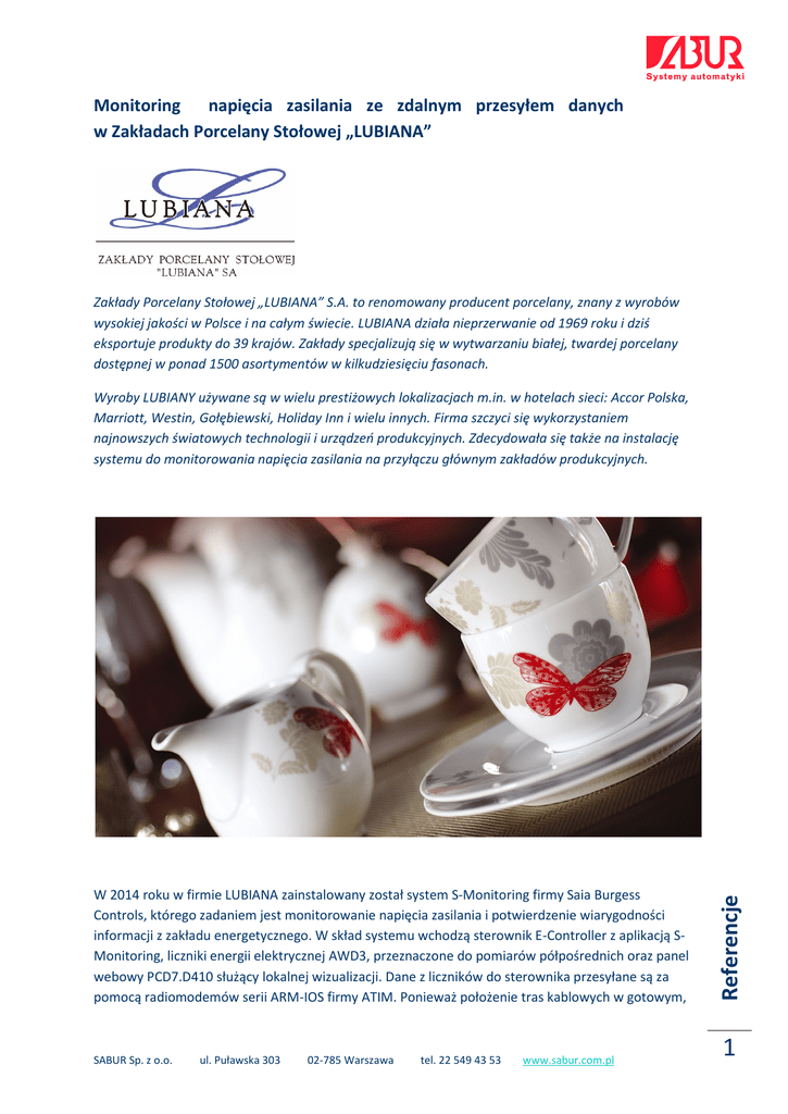 Monitoring napięcia zasilania ze zdalnym przesyłem danych w Zakładach Porcelany Stołowej „LUBIANA” Zakłady Porcelany Stołowej „LUBIANA” S.A. to renomowany producent porcelany, znany z wyrobów wysokiej jakości w Polsce i na całym świecie. LUBIANA działa nieprzerwanie od 1969 roku i dziś eksportuje produkty do 39 krajów. Zakłady specjalizują się w wytwarzaniu białej, twardej porcelany dostępnej w ponad 1500 asortymentów w kilkudziesięciu fasonach. W 2014 roku w firmie LUBIANA zainstalowany został system S-Monitoring firmy Saia Burgess Controls, którego zadaniem jest monitorowanie napięcia zasilania i potwierdzenie wiarygodności informacji z zakładu energetycznego. W skład systemu wchodzą sterownik E-Controller z aplikacją SMonitoring, liczniki energii elektrycznej AWD3, przeznaczone do pomiarów półpośrednich oraz panel webowy PCD7.D410 służący lokalnej wizualizacji. Dane z liczników do sterownika przesyłane są za pomocą radiomodemów serii ARM-IOS firmy ATIM. Ponieważ położenie tras kablowych w gotowym, Referencje Wyroby LUBIANY używane są w wielu prestiżowych lokalizacjach m.in. w hotelach sieci: Accor Polska, Marriott, Westin, Gołębiewski, Holiday Inn i wielu innych. Firma szczyci się wykorzystaniem najnowszych światowych technologii i urządzeń produkcyjnych. Zdecydowała się także na instalację systemu do monitorowania napięcia zasilania na przyłączu głównym zakładów produkcyjnych. SABUR Sp. z o.o. 1 ul. Puławska 303 02-785 Warszawa tel. 22 549 43 53 www.sabur.com.pl działającym zakładzie produkcyjnym było niemożliwe, inwestor zdecydował się na zastosowanie komunikacji radiowej, której wdrożenie jest szybkie i nie pociąga za sobą kosztów modernizacji obiektu. Jak to działa? Liczniki energii elektrycznej zainstalowane na punktach zasilających na bieżąco monitorują napięcie i jakość zasilania zakładu. Dane pomiarowe z liczników przesyłane są za pomocą radiomodemów ARM-IOS do E-Controllera, który odpowiada za ich rejestrację. Dwa radiomodemy są zainstalowane przy licznikach, jeden – pełniący funkcję odbiornika danych ze wszystkich punktów – przy sterowniku. Aplikacja S-Monitoring wbudowana w sterownik i służąca do odczytu i analizy danych z liczników jest wizualizowana lokalnie na 10-calowym panelu webowym Saia PCD7.D410VTCF. Korzyści z wdrożenia systemu stały monitoring napięcia i jakości zasilania bieżący podgląd stanów liczników weryfikacja informacji o zasilaniu, pochodzących z zakładu energetycznego. Wykorzystane rozwiązania i urządzenia Sterownik Saia PCD1.M0160E0 E-Controller – 1 szt. Liczniki energii elektrycznej do pomiarów półpośrednich AWD3 – 4 szt. Panel Saia PCD7.D410VTCF – 1 szt. Terminator Saia PCD7.T161– 1 szt. Zasilacz Q.PS-AD2-2402F1 – 1 szt. Radiomodem ATIM ARM-IOS – 3 szt. Antena ANT868-12FSC z SMA –3szt. Referencje SABUR Sp. z o.o. ul. Puławska 303 02-785 Warszawa tel. 22 549 43 53 www.sabur.com.pl 2