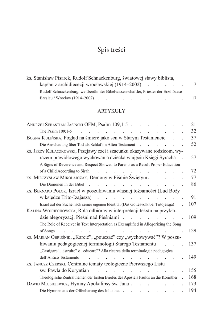 Spis treści ks. Stanisław Pisarek, Rudolf Schnackenburg, światowej sławy biblista, kapłan z archidiecezji wrocławskiej (1914–2002) . . . . . . 7 Rudolf Schnackenburg, weltberühmter Bibelwissenschaftler, Priester der Erzdiözese Breslau / Wrocław (1914–2002) . . . . . . Andrzej Sebastian Jasiński OFM, Psalm 109,1-5 . . . . . . . 17 ARTYKUŁY 21 32 Bogna Kulińska, Pogląd na śmierć jako sen w Starym Testamencie . . . 37 Die Anschauung über Tod als Schlaf im Alten Testament . . . . . . . 52 ks. Jerzy Kułaczkowski, Przejawy czci i szacunku okazywane rodzicom, wyrazem prawidłowego wychowania dziecka w ujęciu Księgi Syracha . . 57 . . . . . The Psalm 109:1-5 . . . . . . . . . . . . . . A Signs of Reverence and Respect Showed to Parents as a Result Proper Education of a Child According to Sirah . . . . . . . . . . . . ks. Mieczysław Mikołajczak, Demony w Piśmie Świętym . 72 . . . . 77 Die Dämonen in der Bibel . . . . . . . . . . . . . 86 ks. Bernard Polok, Izrael w poszukiwaniu własnej tożsamości (Lud Boży w księdze Trito-Izajasza) . . . . . . . . . . . . 91 Israel auf der Suche nach seiner eigenen Identität (Das Gottesvolk bei Tritojesaja) . 107 Kalina Wojciechowska, Rola odbiorcy w interpretacji tekstu na przykładzie alegoryzacji Pieśni nad Pieśniami . . . . . . . . 109 The Role of Receiver in Text Interpretation as Exemplified in Allegorizing the Song of Songs . . . . . . . . . . . . . . . ks. Marian Obruśnik, „Karcić”, „pouczać” czy „wychowywać”? W poszukiwaniu pedagogicznej terminologii Starego Testamentu . . . 129 137 „Castigare”, „istruire” o „educare”? Alla ricerca della terminologia pedagogica 149 dell’Antico Testamento . . . . . . . . . . . . ks. Janusz Czerski, Centralne tematy teologiczne Pierwszego Listu św. Pawła do Koryntian . . . . . . . . . . . 155 168 . 173 . 194 Theologische Zentralthemen der Ersten Briefes des Apostels Paulus an die Korinther . Dawid Mojsiejewicz, Hymny Apokalipsy św. Jana . Die Hymnen aus der Offenbarung des Johannes . . . . . . . . . . . . 284 Spis treści ks. Stanisław Pisarek, Die Apostelgeschichte in der Bibel von André Chouraqui . . . . . . . . . . . . . . . Dzieje Apostolskie w Biblii André Chouraqui’ego . . . . . . . ks. Mariusz Rosik, Oczyszczenie świątyni (Mk 11,15-18) jako zapowiedź jej zburzenia . . . . . . . . . . . . . . 199 206 211 . 219 La purificazione del tempio (Mc 11,15-18) come preavviso del suo sconquasso . ks. Andrzej Demitrów, Mise en situation littéraire et doctrinale de la tradition du tissage du voile du Temple par Marie dans le Protoévangile de Jacques . . . . . . . . . . . . . . . 223 Przedstawienie podłoża literackiego i doktrynalnego tradycji tkania zasłony świątynnej przez Maryję w Protoewangelii św. Jakuba . . . . . . . . Grzegorz Kubski, Czy ks. Walerian Serwatowski, „wybitny biblista polski XIX w.”, uprawiał naukę? Niedokładnie odczytana karta z dziejów rodzimej teologii . . . . . . . . . . . . . 230 233 Did Practise Rev. Walerian Serwatowski “The Most Reputed Polish Exeget of the 19th Century” the Science? . . . . . . . . . . . . 244