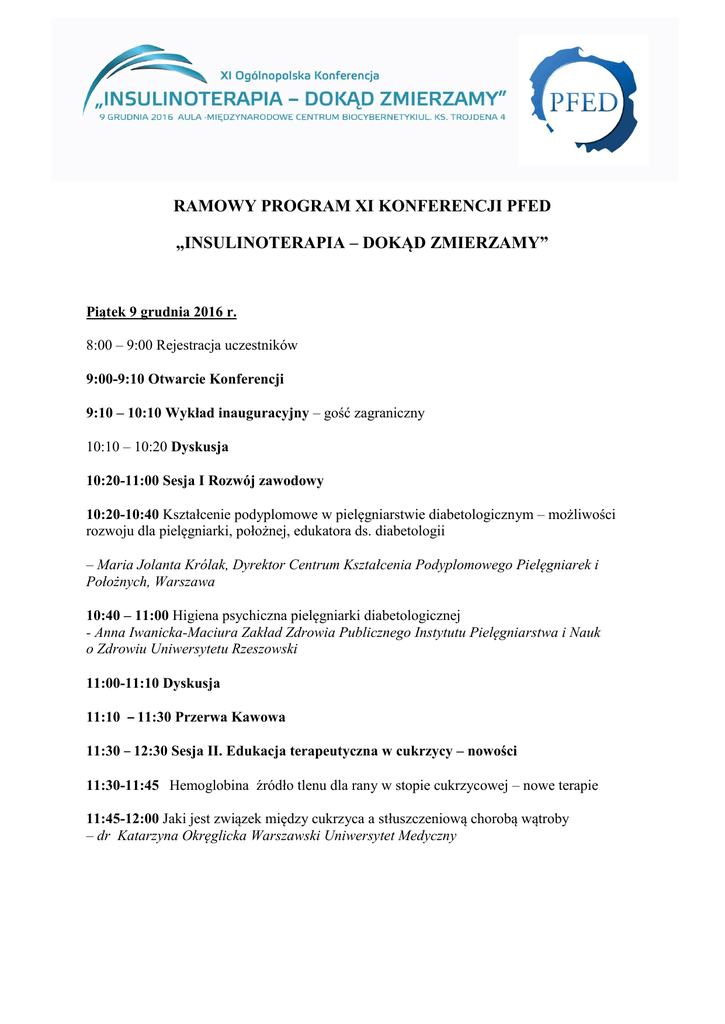 RAMOWY PROGRAM XI KONFERENCJI PFED „INSULINOTERAPIA – DOKĄD ZMIERZAMY” Piątek 9 grudnia 2016 r. 8:00 – 9:00 Rejestracja uczestników 9:00-9:10 Otwarcie Konferencji 9:10 – 10:10 Wykład inauguracyjny – gość zagraniczny 10:10 – 10:20 Dyskusja 10:20-11:00 Sesja I Rozwój zawodowy 10:20-10:40 Kształcenie podyplomowe w pielęgniarstwie diabetologicznym – możliwości rozwoju dla pielęgniarki, położnej, edukatora ds. diabetologii – Maria Jolanta Królak, Dyrektor Centrum Kształcenia Podyplomowego Pielęgniarek i Położnych, Warszawa 10:40 – 11:00 Higiena psychiczna pielęgniarki diabetologicznej - Anna Iwanicka-Maciura Zakład Zdrowia Publicznego Instytutu Pielęgniarstwa i Nauk o Zdrowiu Uniwersytetu Rzeszowski 11:00-11:10 Dyskusja 11:10 – 11:30 Przerwa Kawowa 11:30 – 12:30 Sesja II. Edukacja terapeutyczna w cukrzycy – nowości 11:30-11:45 Hemoglobina źródło tlenu dla rany w stopie cukrzycowej – nowe terapie 11:45-12:00 Jaki jest związek między cukrzyca a stłuszczeniową chorobą wątroby – dr Katarzyna Okręglicka Warszawski Uniwersytet Medyczny 12:00-12:30 Konsekwencje nadmiernej suchości skóry w cukrzycy, czy możemy im zapobiec? Dr n. med. Beata Mrozikiewicz – Rakowska, internista, diabetolog. Klinika Gastroenterologii i Chorób Przemiany Materii Akademii Medycznej, SPCSK ul. Banacha w Warszawie, Poradnia Stopy Cukrzycowej Mirosława Młynarczuk- pielęgniarka zabiegowa w gabinecie stopy cukrzycowej w Katedrze i Klinice Gastroenterologii i Chorób Przemiany Materii Akademii Medycznej, SPCSK ul. Banacha w Warszawie oraz Poradni Stopy Cukrzycowej. 12:30-13:00 Cukrzyca w nowym świetle - mgr Ewa Targońska-Piekutowska 13:00– 13:45 Obiad 13:45 – 15:25 Sesja III Satelitarna, firmowa 13:45-14:15 LILLY 14:15-14:45 Sekrety współczesnej diety. - dr Beata Sińska 14:45-15:15 „Edukacja a sukces terapeutyczny u pacjenta stosującego insulinoterapię ” - Natasza Kalkun-Tobiasz 15:15 -15:25 GENEXO 15:25-16:00 Sesja IV Pielęgniarstwo diabetologiczne - aktualne wytyczne 16:00 Zakończenie konferencji