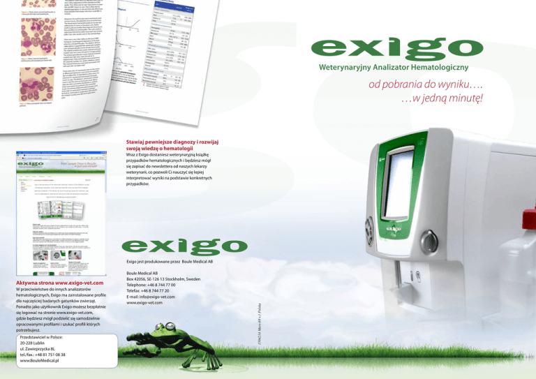 Weterynaryjny Analizator Hematologiczny od pobrania do wyniku…. …w jedną minutę! Stawiaj pewniejsze diagnozy i rozwijaj swoją wiedzę o hematologii Wraz z Exigo dostaniesz weterynaryjną książkę przypadków hematologicznych i będziesz mógł się zapisać do newslettera od naszych lekarzy weterynarii, co pozwoli Ci nauczyć się lepiej interpretować wyniki na podstawie konkretnych przypadków. Aktywna strona www.exigo-vet.com W przeciwieństwe do innych analizatorów hematologicznych, Exigo ma zainstalowane profile dla najczęściej badanych gatunków zwierząt. Ponadto jako użytkownik Exigo możesz bezpłatnie się logować na stronie www.exigo-vet.com, gdzie będziesz mógł podzielić się samodzielnie opracowanymi profilami i szukać profili których potrzebujesz. Przedstawiciel w Polsce: 20-228 Lublin ul. Zawieprzycka 8L tel./fax.: +48 81 751 08 38 www.BouleMedical.pl Boule Medical AB Box 42056, SE-126 13 Stockholm, Sweden Telephone: +46 8 744 77 00 Telefax: +46 8 744 77 20 E-mail: [email protected] www.exigo-vet.com 1504214 Mars-08 v.1 Polska Exigo jest produkowane przez Boule Medical AB – nowa klasa analizatorów weterynaryjnych Szybki podgląd Podgląd tradycyjny Proste monito rowanie kontroli Exigo bezpośrednio wywodzi się z weterynaryjnej wersji analizatora Medonic, który był znany jako jeden z najdokładnieszych analizatorów na rynku. Prostota obsługi Exigo posiada intuicyjne oprogramowanie łatwe do zarządzania poprzez kolorowy ekran dotykowy z przejrzystym menu i podręcznymi wskazówkami. Wraz z szybkim podglądem możesz zobaczyć wynik wraz z zakresami referencyjnymi lub korzystać z tradycyjnego podglądu z parametrami, histogramami i ewentualnymi alertami. Przycisk Poprzez zaoferowanie Exigo, analizatora przeznaczonego dla weterynarii, skupiono się bardziej na oczekiwaniach lekarzy weterynarii i analizie krwi zwierzęcej. Wskaz ów hemato ki logiczn e Najszybszy na świecie! Exigo umożliwia bezpośredni pomiar z 20μl mikrokapilary, analiza może być wykonana bezpośrednio po pobraniu krwi. Bez probówki, wstępnego mieszania i żadnych dodatkowych przygotowań - po prostu wystarczy jedna kropla krwi. i Zamiast zagadkowych flag i dziwnych kodów błędów, Exigo wyświetla wskazówki jak postępować w przypadku próbek patologicznych i informacjami o ewentualnych błędach systemu. Odczynniki i zapobieganie skrzepom Zaawansowane różnicowanie Wszystkie wymagane odczynniki znajdują się na podręcznym zasobniku, tuż przy analizatorze. W porównaniu do innych analiztorów, automatyczne przepłukiwanie igły pobierającej i dodatkowy płyn płuczący, minimalizują ryzyko zapchania analizatora skrzepem krwi. Różnicowanie leukocytów jest jednym z trudniej mierzalnych parametrów, często próbki prawidłowe są flagowane jako patologiczne. Exigo ma poprawiony system różnicowania WBC co zapobiega tego typu błędom. Zainstalowane Pies Kot Koń Królik Krowa Fretka Kontrola jakości Wbudowane mieszadło Wiele gatunków Poprzez czytnik kodów kreskowych wprowadzane są informacje o materiałach kontrolnych. Oszczędź miejsce poprzez zastosowanie wbudowanego mieszadła dla sześciu probówek różnych rozmiarów. Do standardowo zainstalowanych profili dostępne są nowe: owca, szczur, świnia, lama, mysz, małpa i koza. Weterynaryjny Analizator Hematologiczny