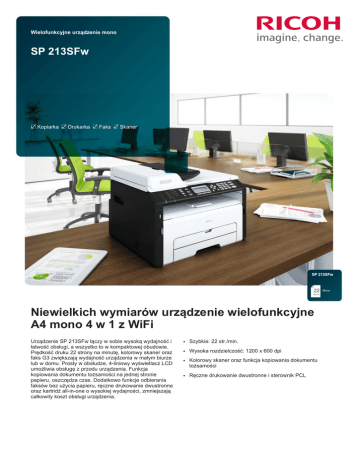 Wielofunkcyjne urządzenie mono SP 213SFw Kopiarka Drukarka Faks Skaner SP 213SFw 22 str./m Niewielkich wymiarów urządzenie wielofunkcyjne A4 mono 4 w 1 z WiFi Urządzenie SP 213SFw łączy w sobie wysoką wydajność i łatwość obsługi, a wszystko to w kompaktowej obudowie. Prędkość druku 22 strony na minutę, kolorowy skaner oraz faks G3 zwiększają wydajność urządzenia w małym biurze lub w domu. Prosty w obsłudze, 4-liniowy wyświetlacz LCD umożliwia obsługę z przodu urządzenia. Funkcja kopiowania dokumentu tożsamości na jednej stronie papieru, oszczędza czas. Dodatkowo funkcje odbierania faksów bez użycia papieru, ręczne drukowanie dwustronne oraz kartridż all-in-one o wysokiej wydajności, zmniejszają całkowity koszt obsługi urządzenia. Szybkie: 22 str./min. Wysoka rozdzielczość: 1200 x 600 dpi Kolorowy skaner oraz funkcja kopiowania dokumentu tożsamości Ręczne drukowanie dwustronne i sterownik PCL Mono Specyfikacja techniczna SP 213SFw Kompatybilność: OGÓLNE Czas nagrzewania: 27 sekund Prędkość wykonania pierwszej kopii: Prędkość wydruku ciągłego: 10 sekundy 22 stron na minutę Pamięć: 16 MB Cykl duty: 20 000 wydruków miesięcznie Drukowanie dwustronne: Ręczne Wymiary (szer. x gł. x wys.): 402 x 360 x 293 mm Waga: 11,1 kg Źródło zasilania: 220 - 240 V, 50/60 Hz KOPIARKA Kopiowanie wielokrotne: 300 dpi, 600 x 600 dpi Zoom: Od 25% do 400% co 1% DRUKARKA Język drukarki: Maksymalnie: 33,6 Kbps OBSŁUGIWANY PAPIER Zalecany rozmiar papieru: Pojemność wejściowa papieru: Maksymalnie: 151 arkuszy Maksymalnie: 50 arkuszy Gramatura papieru: Standardowa/e kaseta/y na papier: 60 - 105 g/m² Taca ręczna: 60 - 105 g/m² ADF: 52 - 105 g/m² EKOLOGIA Pobór mocy: Rozdzielczość drukowania: 600 x 600 dpi, 1 200 x 600 dpi PCL (80 czcionek) Interfejs: USB 2.0 Bezprzewodowa sieć LAN (IEEE 802.11b/g/n) Windows® XP Windows® Vista Windows® 7 Windows® 8 Windows® 8.1 Windows® Server 2003 Windows® Server 2003R2 Windows® Server 2008 Windows® Server 2008R2 Windows® Server 2012 Windows® Server 2012R2 A4 A5 A6 B5 B6 Pojemność wyjściowa papieru: PCL6 Czcionki: Środowiska Windows®: G3: 3 sek. Prędkość modemu: Do 99 kopii Rozdzielczość: G3 Prędkość transmisji: Maksymalnie: 400 W Tryb gotowości: 65 W Tryb uśpienia: 5 W MATERIAŁY EKSPLOATACYJNE All-in-one cartridge capacity (regular yield): All-in-one cartridge capacity (duża wydajność): Zestaw startowy: Black: 1 500 prints Czarny: 2 600 wydruków Czarny: 1 000 wydruków Prędkość kopiowania: Niemcy 14 kop./min., Belgia i Austria 9 kop./min. Metoda pomiaru wydajności ISO/IEC 19752. W celu potwierdzenia dostępności modeli, opcji i oprogramowania prosimy skontaktować się z lokalnym autoryzowanym dostawcą produktów Ricoh. SKANER Rozdzielczość: Maksymalnie: 300 dpi Rozmiar oryginału: A4 Sterowniki standardowe: Sieciowy TWAIN, WIA FAKS Certyfikaty ISO9001, ISO14001, ISO27001 Wszystkie marki i/lub produkty są nazwami handlowymi ich właścicieli. Specyfikacja i wygląd zewnętrzny mogą ulec zmianie bez uprzedniej informacji. Kolor produktu może różnić się od przedstawionego w broszurze. Zdjęcia w broszurze nie są prawdziwymi fotografiami i w wyglądzie mogą pojawić się niewielkie różnice. www.ricoh-europe.com Copyright © 2014 Ricoh Europe PLC. All rights reserved. Broszura, jej zawartość i/lub wygląd nie mogą być zmieniane, adoptowane, kopiowane w części i/lub całości ani używane w innych opracowaniach bez pisemnej zgody Ricoh Europe PLC.