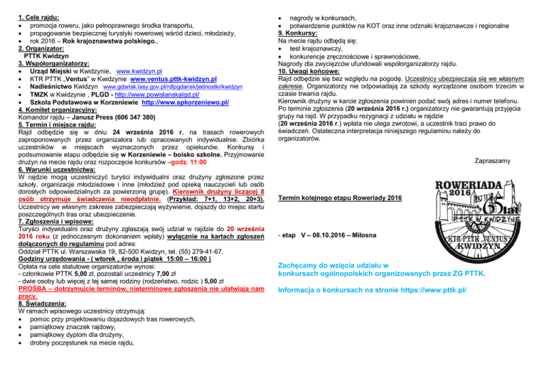 1. Cele rajdu: promocja roweru, jako pełnoprawnego środka transportu, propagowanie bezpiecznej turystyki rowerowej wśród dzieci, młodzieży, rok 2016 – Rok krajoznawstwa polskiego., 2. Organizator: PTTK Kwidzyn 3. Współorganizatorzy: Urząd Miejski w Kwidzynie, www.kwidzyn.pl KTR PTTK „Ventus” w Kwidzynie www.ventus.pttk-kwidzyn.pl Nadleśnictwo Kwidzyn www.gdansk.lasy.gov.pl/rdlpgdansk/jednostki/kwidzyn TMZK w Kwidzynie , PLGD - http://www.powislanskalgd.pl/ Szkoła Podstawowa w Korzeniewie http://www.spkorzeniewo.pl/ 4. Komitet organizacyjny: Komandor rajdu – Janusz Press (606 347 380) 5. Termin i miejsce rajdu: Rajd odbędzie się w dniu 24 września 2016 r. na trasach rowerowych zaproponowanych przez organizatora lub opracowanych indywidualnie. Zbiórka uczestników w miejscach wyznaczonych przez opiekunów. Konkursy i podsumowanie etapu odbędzie się w Korzeniewie – boisko szkolne. Przyjmowanie drużyn na mecie rajdu oraz rozpoczęcie konkursów –godz. 11:00 6. Warunki uczestnictwa: W rajdzie mogą uczestniczyć turyści indywidualni oraz drużyny zgłoszone przez szkoły, organizacje młodzieżowe i inne (młodzież pod opieką nauczycieli lub osób dorosłych odpowiedzialnych za powierzoną grupę). Kierownik drużyny liczącej 8 osób otrzymuje świadczenia nieodpłatnie. (Przykład: 7+1, 13+2, 20+3). Uczestnicy we własnym zakresie zabezpieczają wyżywienie, dojazdy do miejsc startu poszczególnych tras oraz ubezpieczenie. 7. Zgłoszenia i wpisowe: Turyści indywidualni oraz drużyny zgłaszają swój udział w rajdzie do 20 września 2016 roku (z jednoczesnym dokonaniem wpłaty) wyłącznie na kartach zgłoszeń dołączonych do regulaminu pod adres: Oddział PTTK ul. Warszawska 19, 82-500 Kwidzyn, tel. (55) 279-41-67. Godziny urzędowania - ( wtorek , środa i piątek 15:00 – 16:00 ) Opłata na cele statutowe organizatorów wynosi: - członkowie PTTK 5,00 zł, pozostali uczestnicy 7,00 zł - dwie osoby lub więcej z tej samej rodziny (rodzeństwo, rodzic ) 5,00 zł PROŚBA – dotrzymujcie terminów, nieterminowe zgłoszenia nie ułatwiają nam pracy. 8. Świadczenia: W ramach wpisowego uczestnicy otrzymują: pomoc przy projektowaniu dojazdowych tras rowerowych, pamiątkowy znaczek rajdowy, pamiątkowy dyplom dla drużyny, drobny poczęstunek na mecie rajdu, nagrody w konkursach, potwierdzenie punktów na KOT oraz inne odznaki krajoznawcze i regionalne 9. Konkursy: Na mecie rajdu odbędą się: test krajoznawczy, konkurencje zręcznościowe i sprawnościowe, Nagrody dla zwycięzców ufundowali współorganizatorzy rajdu. 10. Uwagi końcowe: Rajd odbędzie się bez względu na pogodę. Uczestnicy ubezpieczają się we własnym zakresie. Organizatorzy nie odpowiadają za szkody wyrządzone osobom trzecim w czasie trwania rajdu. Kierownik drużyny w karcie zgłoszenia powinien podać swój adres i numer telefonu. Po terminie zgłoszenia (20 września 2016 r.) organizatorzy nie gwarantują przyjęcia grupy na rajd. W przypadku rezygnacji z udziału w rajdzie (20 września 2016 r.) wpłata nie ulega zwrotowi, a uczestnik traci prawo do świadczeń. Ostateczna interpretacja niniejszego regulaminu należy do organizatorów. Zapraszamy Termin kolejnego etapu Roweriady 2016 - etap V – 08.10.2016 – Miłosna Zachęcamy do wzięcia udziału w konkursach ogólnopolskich organizowanych przez ZG PTTK. Informacja o konkursach na stronie https://www.pttk.pl/ REGULAMIN RAJDU KORZENIEWO - Szkoła Podstawowa 24.09.2016 r Kwidzyn, wrzesień 2016r